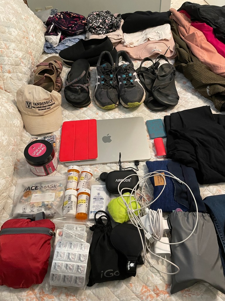 Of course besides clothes I also need my laptop, a mini iPad – as my e-reader, my phone and associated cords, a battery pack and an adaptor. Ear phones, ear plugs, eye mask, face masks, a deck of cards, a day pack, prescriptions, antibiotics, malaria pills, liquid bandaid, hydrocortisone cream, razors, toothbrushes, deodorant, bar shampoo and conditioner, tooth powder. Limiting my liquids to just one quart size bag was a challenge but with a few substitutions I managed. It’s surprising how much room these things take up. Just the pills took up a lot of space.