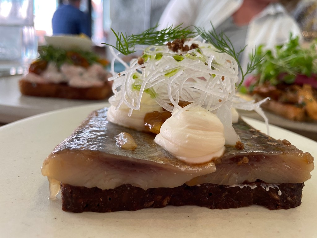 I did try smorrebrod again at several meals and I loved it. Glad not to have it completely tainted by the encounter in Iceland. These delightful open-faced sandwiches are covered with so many toppings – avocado, shrimps, potatoes, tomatoes, mushrooms, plaice, or herring, and many different kinds of meat, usually with some micro greens, pickled onions, eggs, some interesting aioli, and other toppings. These are served traditional with snapps or aquavit. At one restaurant they had jars lined up with their homemade versions, flavored with moss, lemon, dill, hazelnuts, rhubarb, or pineapple and lots of other flavors. I wanted to try some but we were riding bikes that day and I wasn’t sure if that would make a good combination, as it is quite strong.