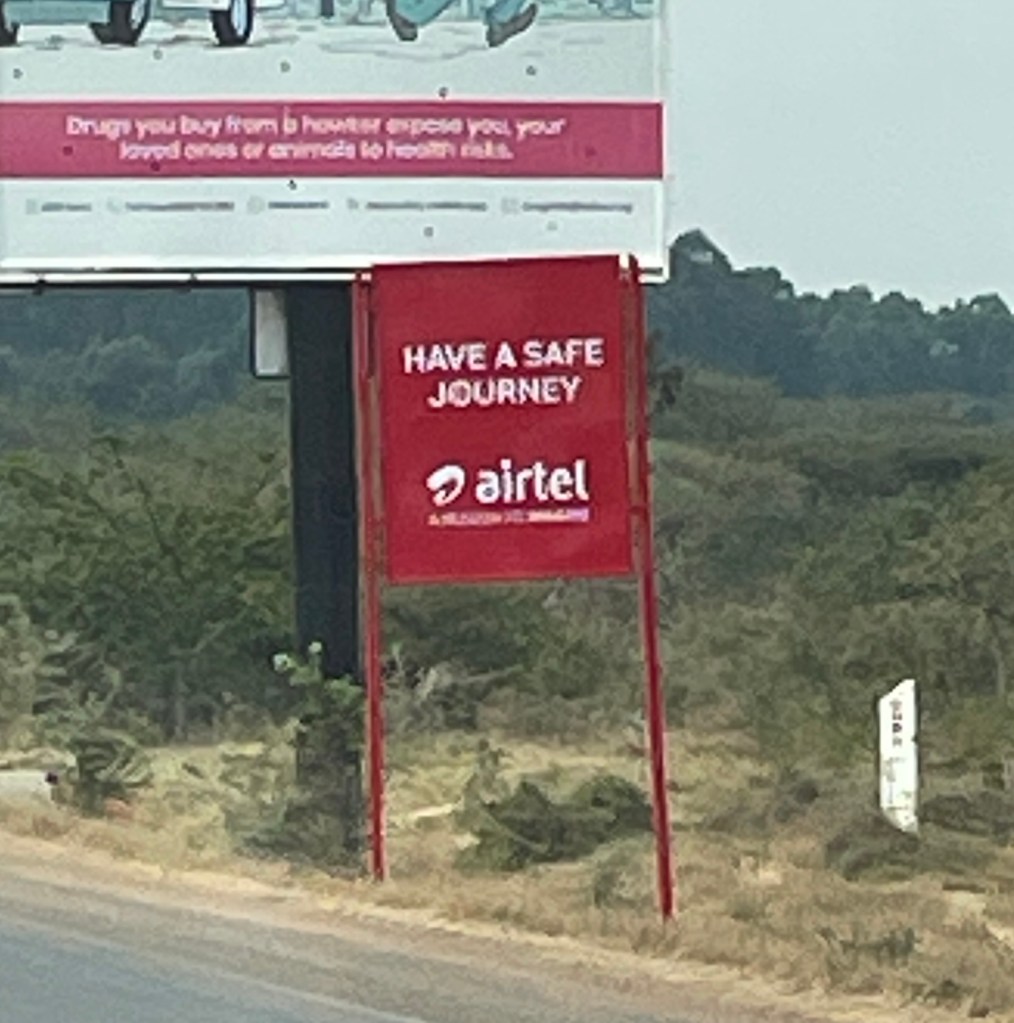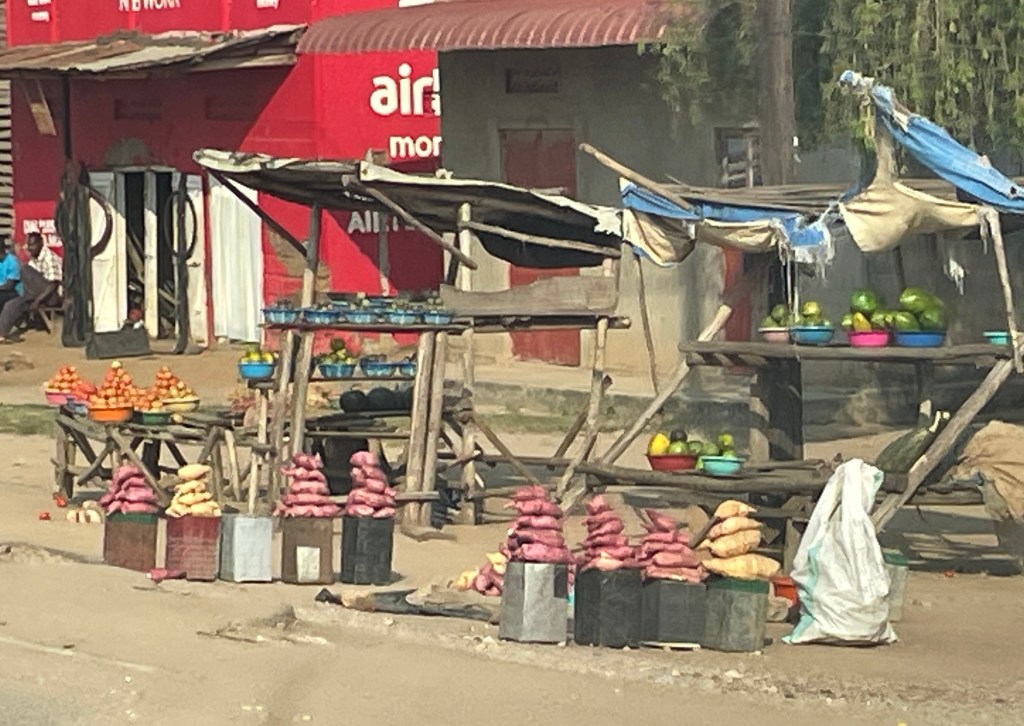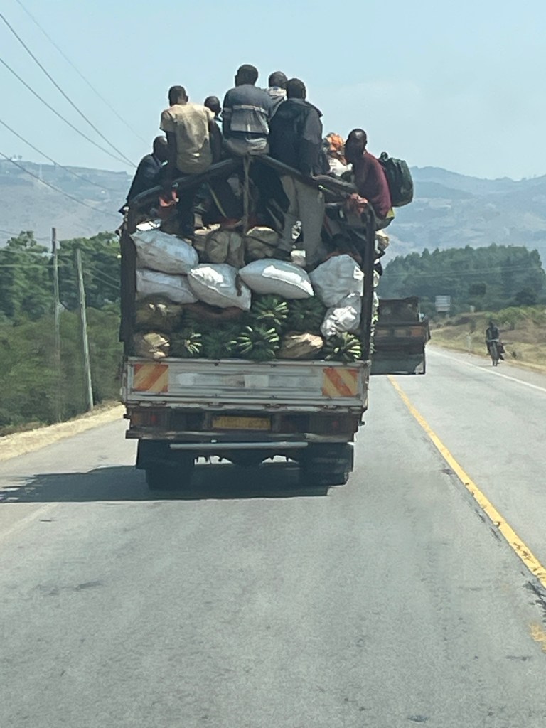 Then come the pedestrians. It does matter how far you are away from a town or city, someone is walking along the road – school children in their pink, red, blue, yellow, green or teal uniforms; men and women going to work; men, women and children carrying items on their heads – bundles of sticks, water jugs, produce, etc, taking them into town to be sold or home after shopping; sellers of freshly caught tilapia, produce, and any number of things, especially at the police check points; and many whose destinations or purpose was unclear as they ambled along. As you come near a town the crowd grows, especially on Sunday when they’re headed to church. There are no sidewalks.