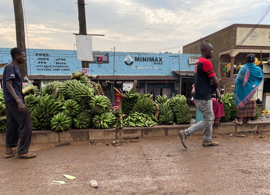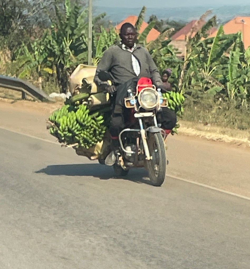 There is a three foot wide lane, usually on one side of the road that may be used by the walkers but it is also full of bicycles and motorcycles which seem to have the right of way. The bikes and cycles are both used for transportation as well as conveyances for items to be sold and purchased. Motorcycles, can be taxis – I was offered several rides as I walked through Entebbe. They may carry 2 people or sometimes 3 or 4. The bikes and cycles are beasts of burden, carrying 3 and sometimes 4 branches of bananas which can weigh several hundred pounds. And the country is hilly, so often people are pushing their bikes up the slopes as no one could pedal uphill with that weight. Or they’re toting 4 or 5 twenty liter jugs of water, which again is close to 200 pounds. Any thing else you an dream of are loaded on those wheels.