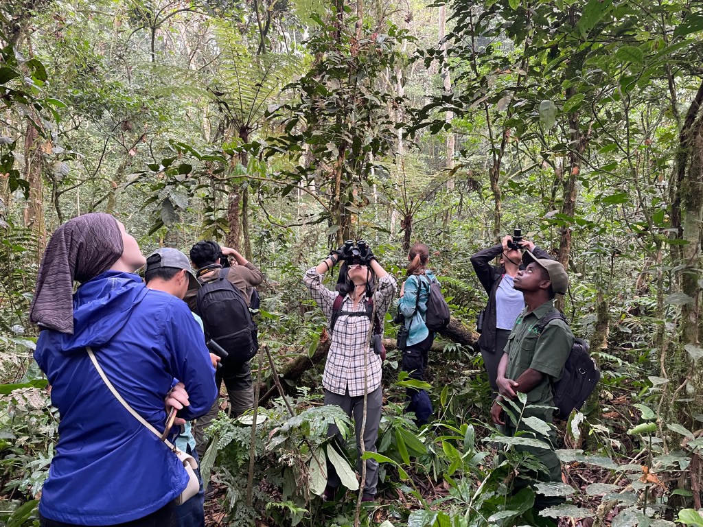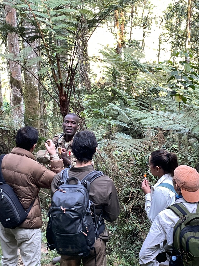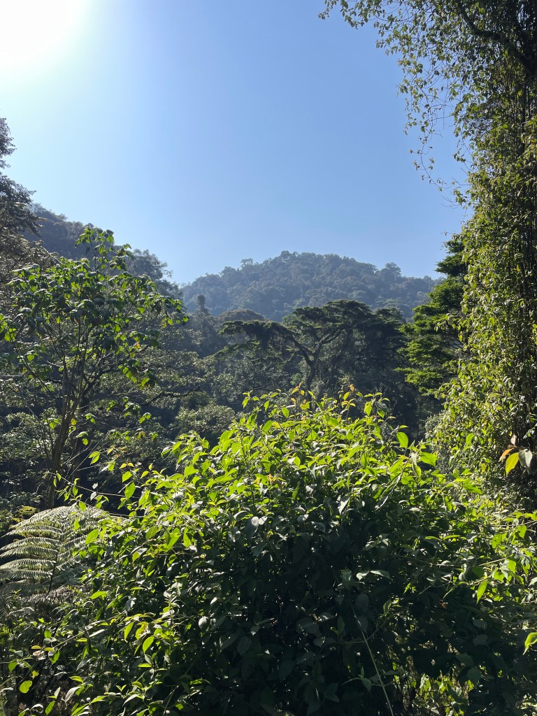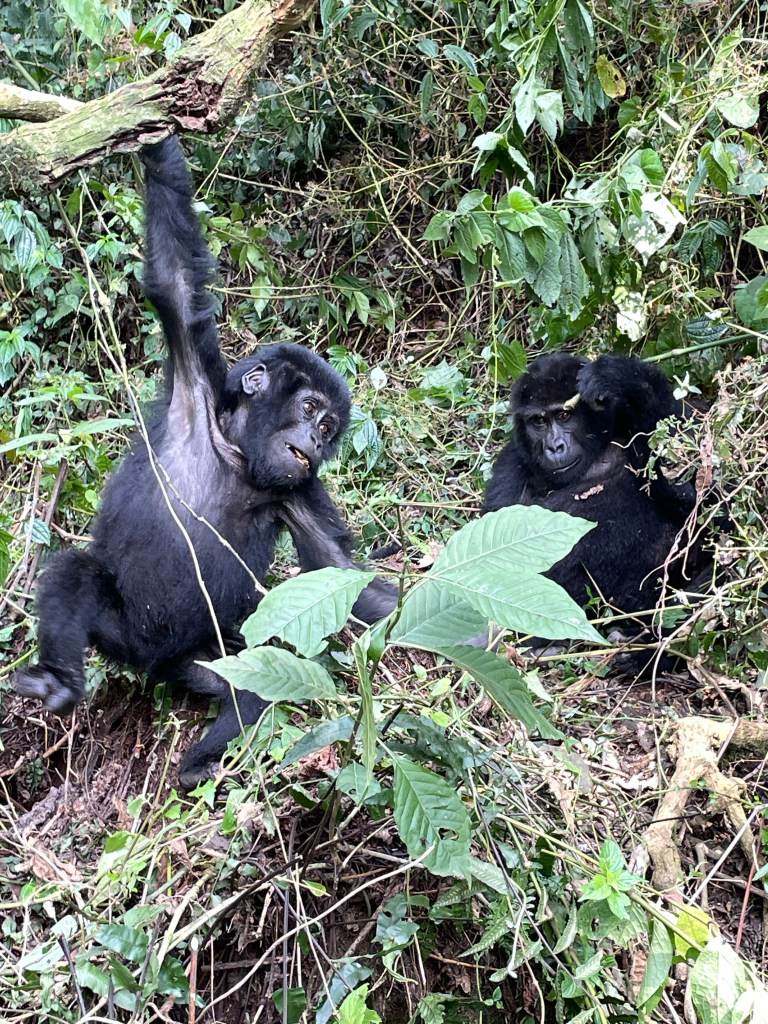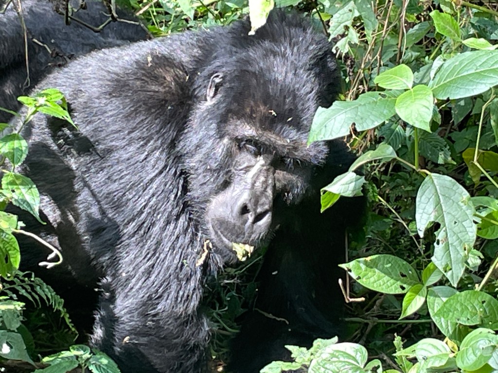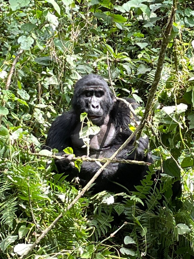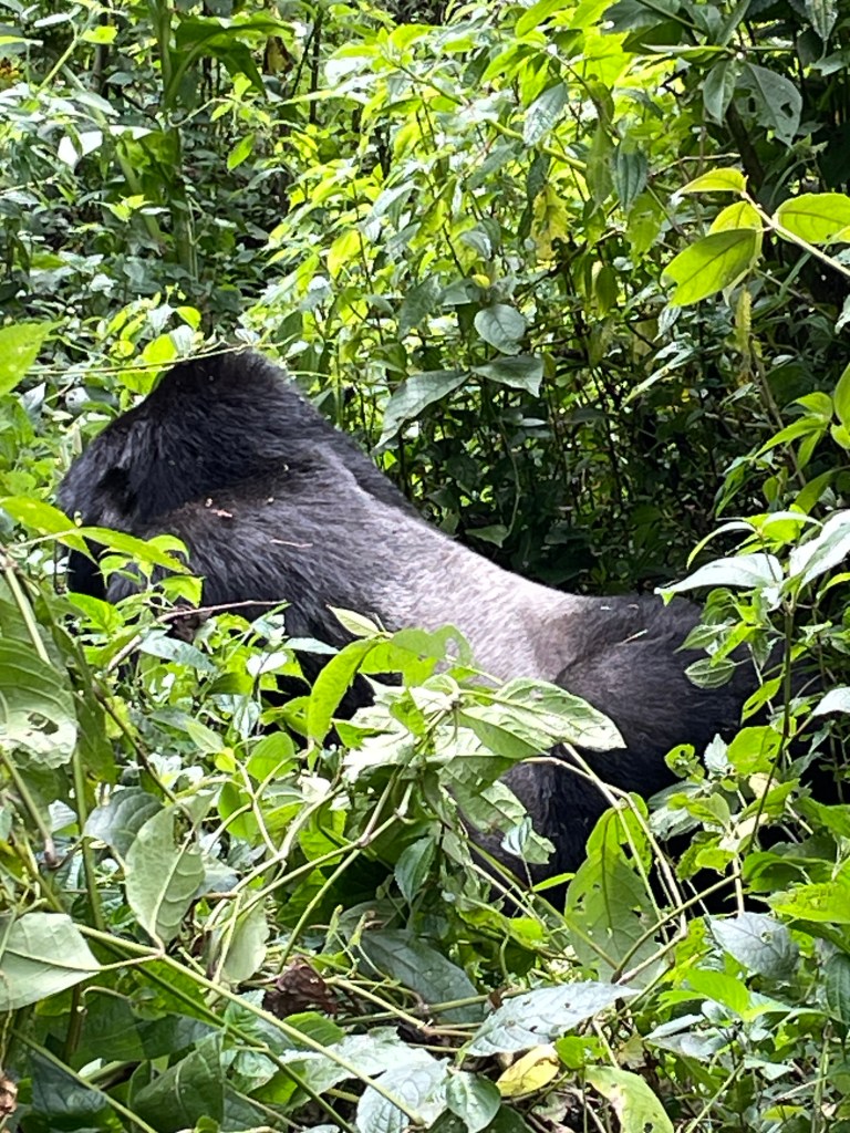 So now for the animal experiences. Hiking to see the gorillas was difficult and fabulous. Ten of us from around the world did the trek- one young lady from South Korea, a family from Mexico, 5 people from a worldwide ecology/biology convention in Kigali – 2 from the US, 1 from Mexico and 2 from Peru. I also did other tours with two women from Brazil and two men from Italy who were from that conference. The path down was steep and slippery due to do the dry silty soil and then we got off the main trail there were vines to catch your feet and trip you, trees with spiked bark you needed to avoid, slanted paths where it was difficult to maintain your footing, and places you just couldn’t see where your foot was going- into a hole or on solid ground. I fell at least 4 times and other reported doing the same. I didn’t feel too bad as I was the oldest in the group by double or more. The trackers and porters were generous with their helping hands and encouragement of the ‘mama’ of the group. And of course we had to hike back up that steep trail at 2300 feet above sea level. I couldn’t believe that the porters carried one women down and back up on a chair! But it was worth it. We found a troop of gorillas and was able to watch them for an hour or so, moving around to see different members. We enjoyed seeing one scamper up a tree, watched a baby swing from a branch with its mother close by, and observed a silver back munching his lunch as he gazed at us nonchalantly. Not many people get this opportunity.