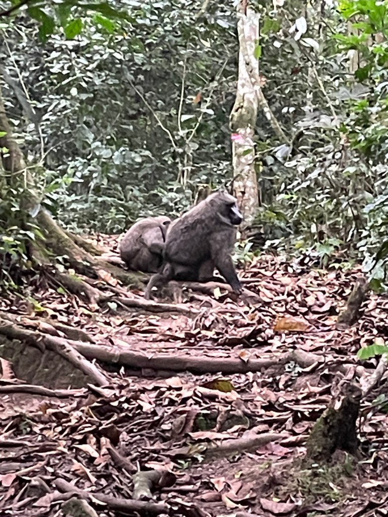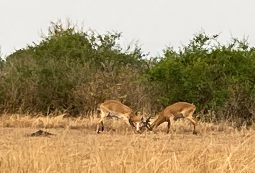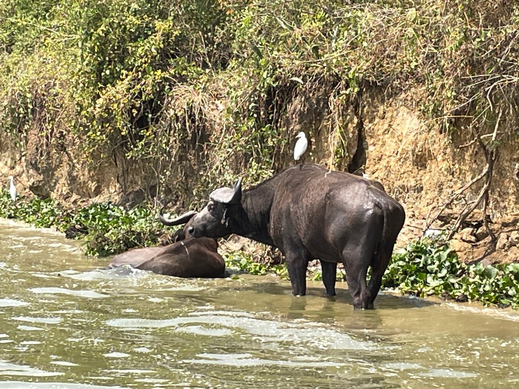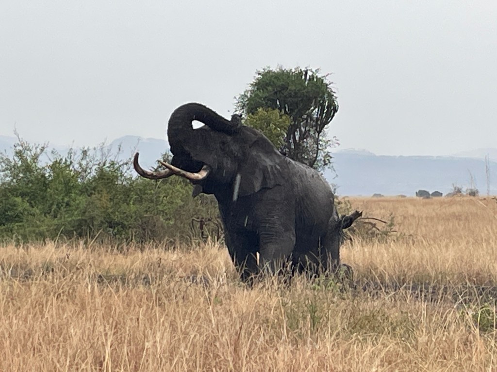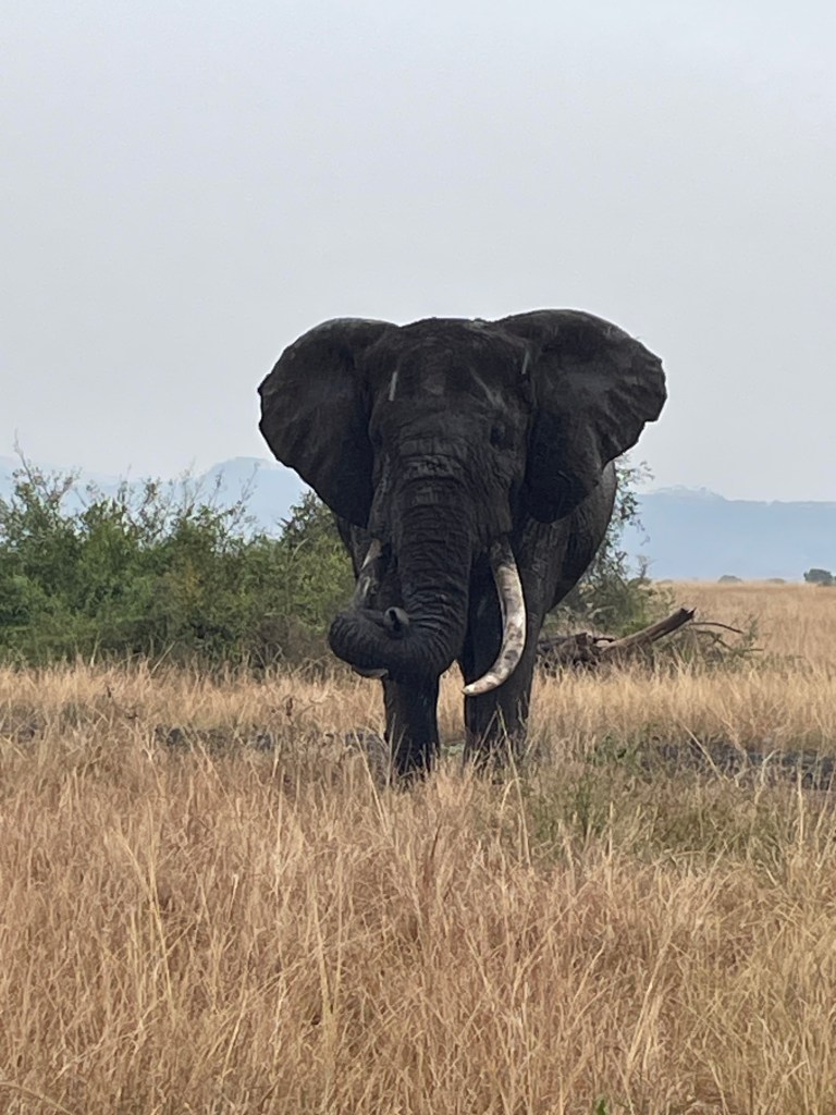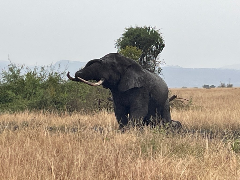 I went on a boat cruise on the Kazinga Channel, a night drive in Queen Elizabeth National Park, and chimpanzee trek as well. I saw water buffalo, a bunch of hippos, elephants, hundreds of kob-a type of antelope, water buck, two female lions lying in wait on the savannah, African fish eagles – almost as big as a bald eagle, also with a white head, a monitor lizard, and crocodiles. There were babies to watch in each of the herds; kobs- the Ugandan national symbol, fighting; and a young male elephant that bowed to me. He was alone and headed toward us when he stopped and got to his knees, then stood up and raised his trunk in the air, and finally just stopped and stared at me. I’m not sure what that was about, but I’m pretty sure he recognized me as the queen of the savannah. We saw a lot of chimps up in the tree tops – one even peed for our amusement, as they munched on figs, but really only saw them in silhouettes when they moved. But then one came down to a particularly large bunch of fruit and posed for pictures. It was incredible to see them all in their natural habitats.