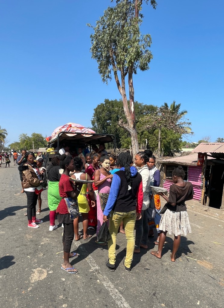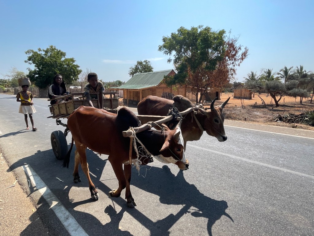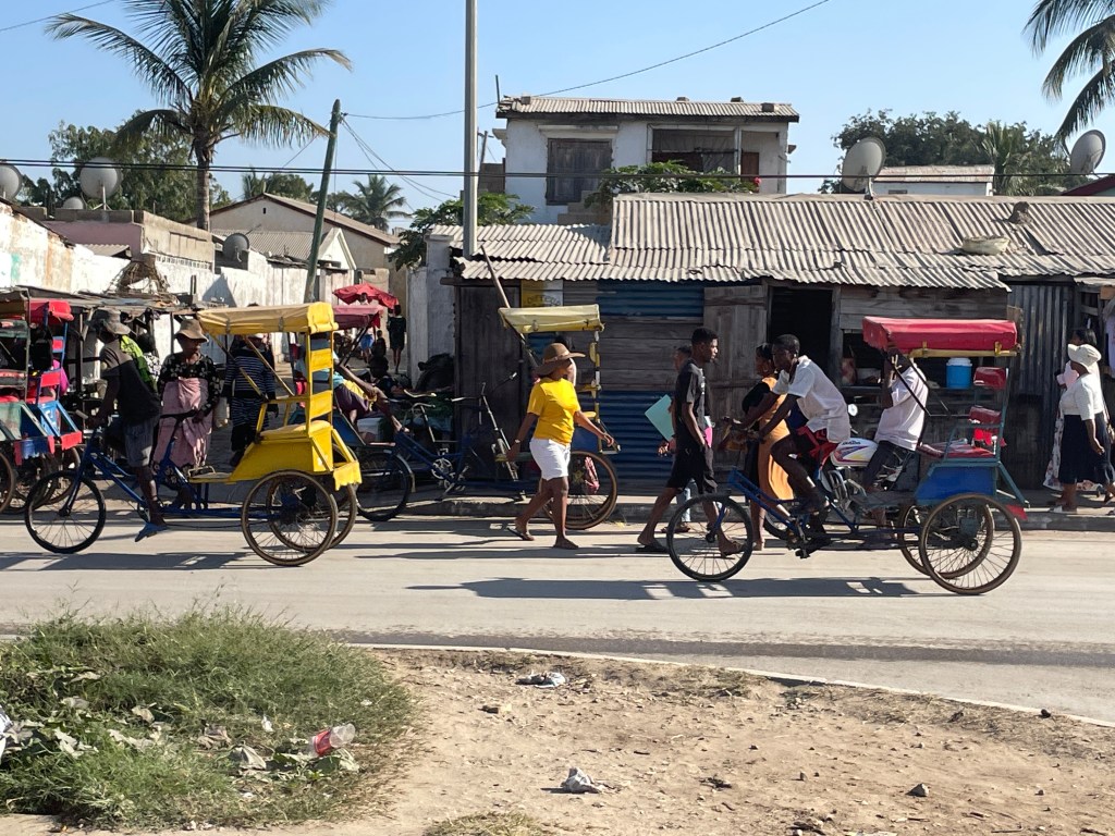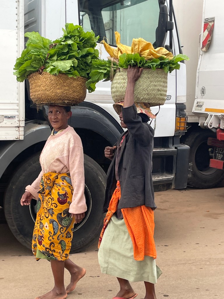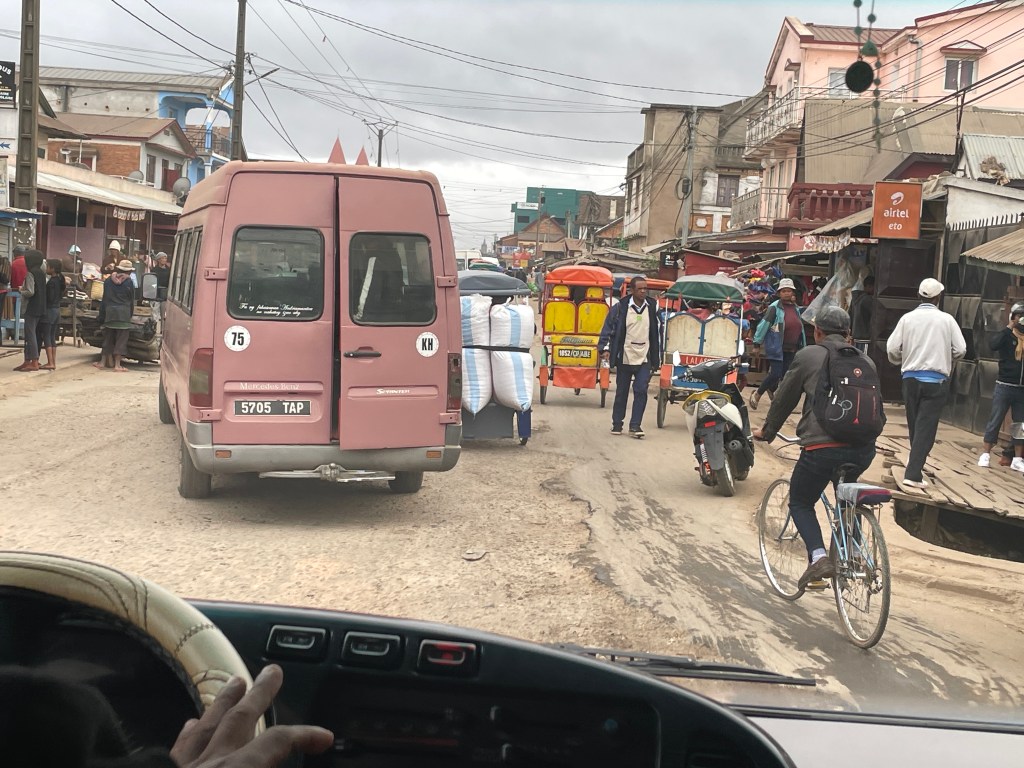 There are only a few major paved roads here and for the most part they are in poor condition, lots of pot holes and broken pavement, so our drive took much longer than it would, say in the States or Australia. Our bus drivers was constantly breaking to go gently through or around some sort of bump in the road. The town and cities are built right up to the road with shops and restaurants thronged with people, especially during the early morning and as the workday ends, creating another hazard as we drove. I found the variety of things for sale in these small business along the highway fascinating, not just the take away foods and brightly colored produce, but bicycle parts, hardware, cell phones, baskets, hats, school supplies, clothing – really anything you would need. And the types of vehicles that are on the road are endless it seems, minibus taxis, man powered tuk tuks, bicycles tuk tuks, zebu pulled carts, human pulled carts, etc. There was liveliness and energy here, filled with social interactions you don’t see in my hometown or any other town I’ve lived in, a true sense of community where people talked and laughed and hung out with their besties.