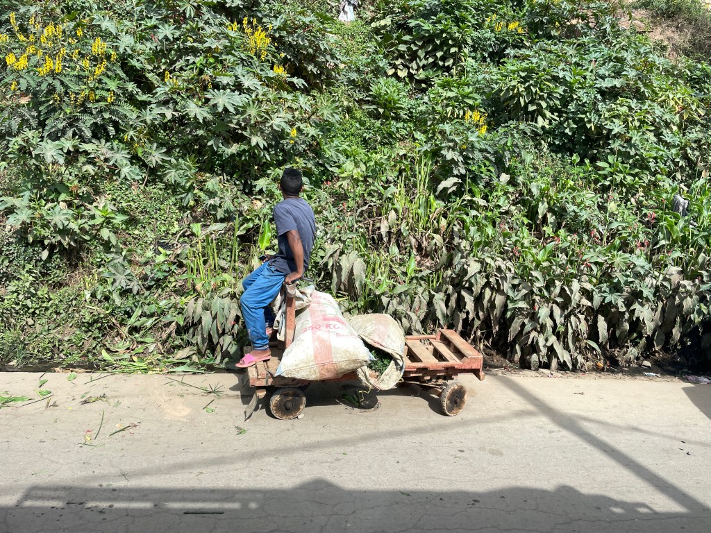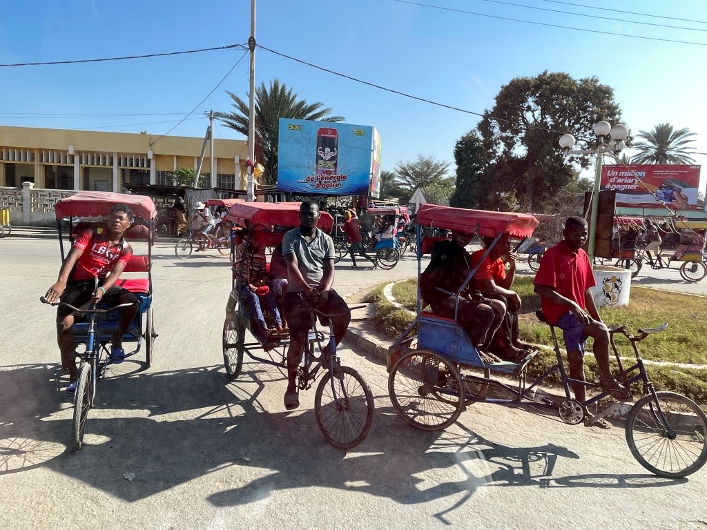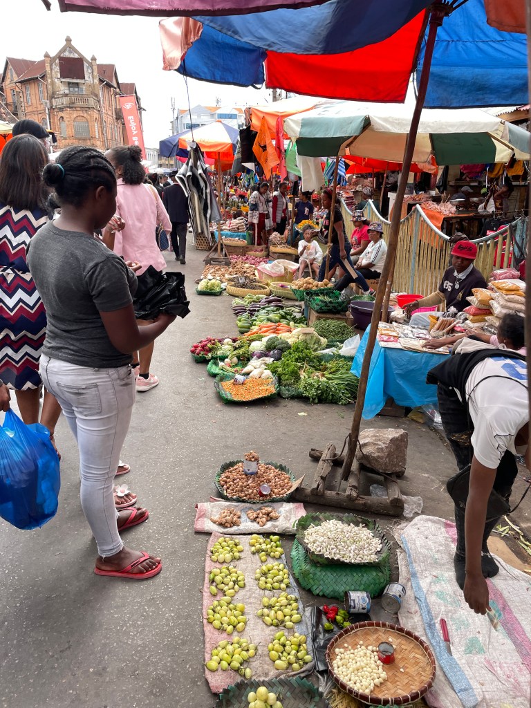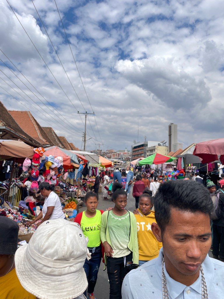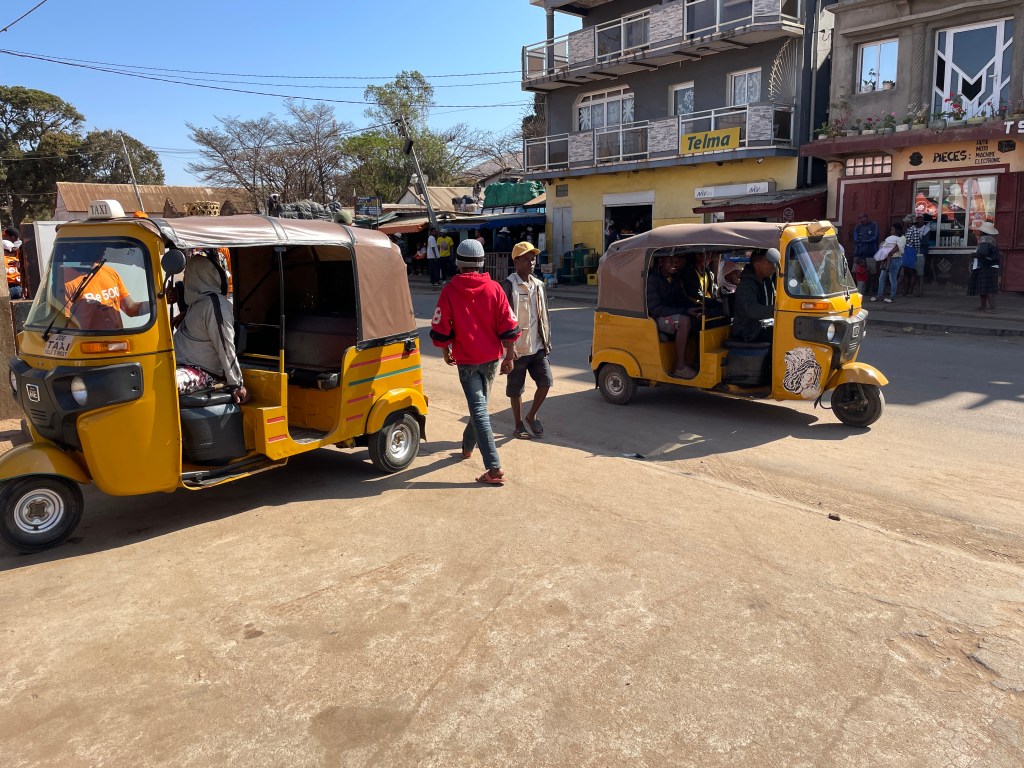 There are only a few major paved roads here and for the most part they are in poor condition, lots of pot holes and broken pavement, so our drive took much longer than it would, say in the States or Australia. Our bus drivers was constantly breaking to go gently through or around some sort of bump in the road. The town and cities are built right up to the road with shops and restaurants thronged with people, especially during the early morning and as the workday ends, creating another hazard as we drove. I found the variety of things for sale in these small business along the highway fascinating, not just the take away foods and brightly colored produce, but bicycle parts, hardware, cell phones, baskets, hats, school supplies, clothing – really anything you would need. And the types of vehicles that are on the road are endless it seems, minibus taxis, man powered tuk tuks, bicycles tuk tuks, zebu pulled carts, human pulled carts, etc. There was liveliness and energy here, filled with social interactions you don’t see in my hometown or any other town I’ve lived in, a true sense of community where people talked and laughed and hung out with their besties.