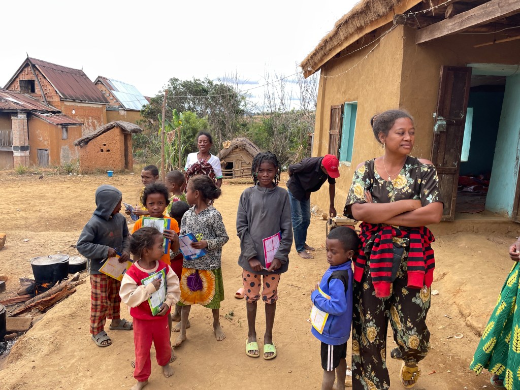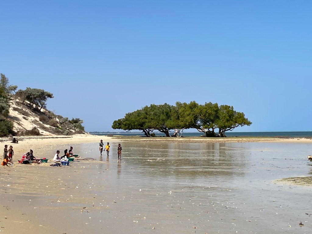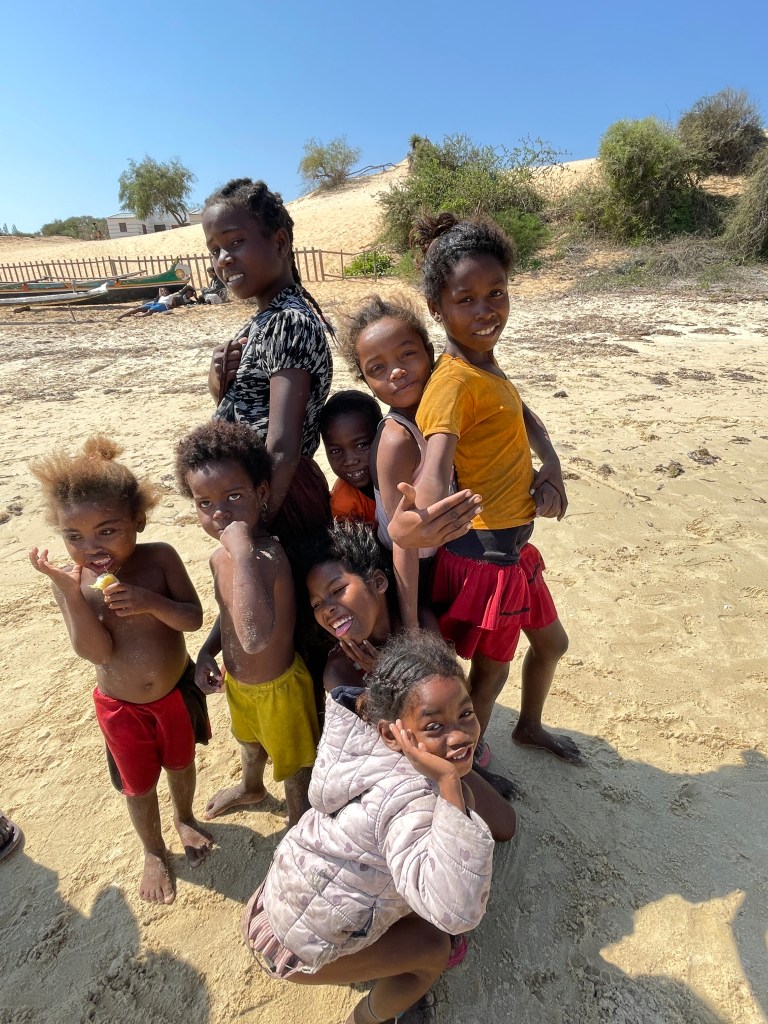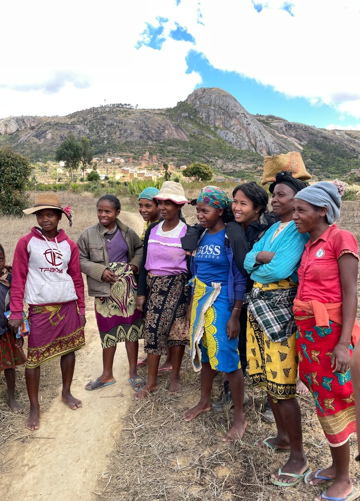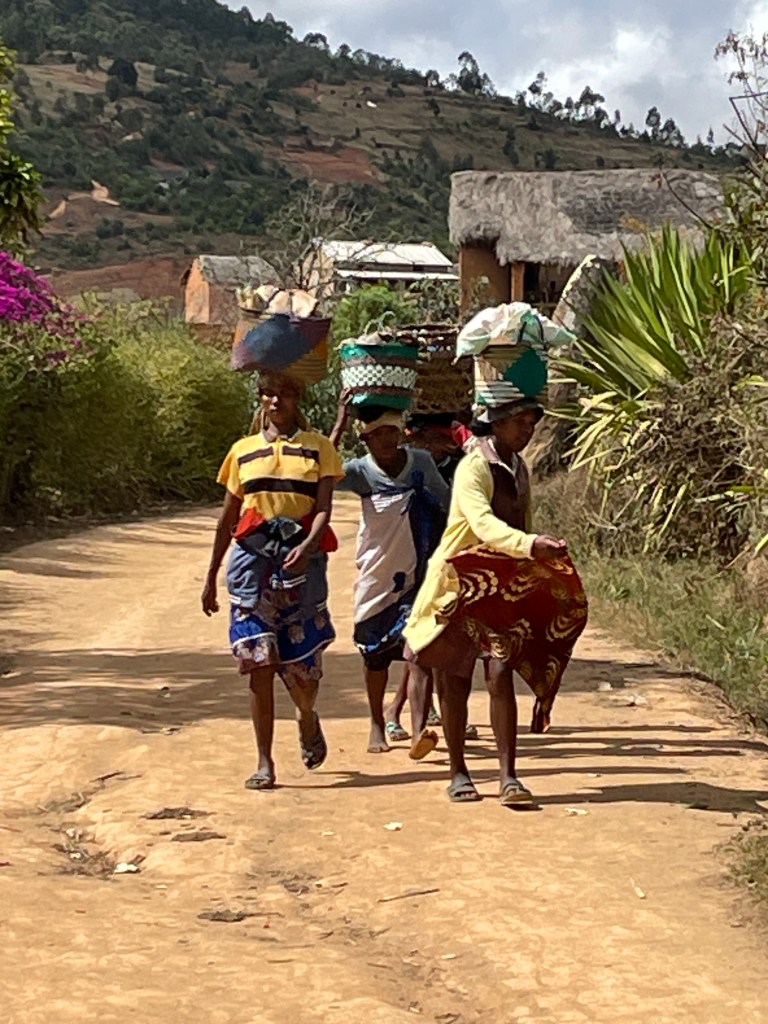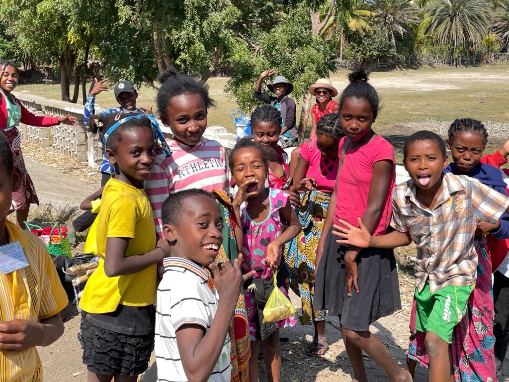 We walked through the countryside, marveling at the farms they built through manual labor. Fields and fields of produce and acres and acres of rice paddies. Rice is the main part of their diet but they’re not able to grow enough and have to import 200,000 tons each year. Through the countryside and along the beach, children followed us everywhere. We’d start off with one or two and then they multiplied until at times we had several dozen. They’d ask our names and tell us theirs, laugh at our antics, and ask for anything that was loose around our person – hat, water bottle, hair tie, jewelry, etc. And how they loved to see their pictures when I showed it to them. In the capital they’ve taught the kids to sell some items like post cards, and magnets, etc instead of begging. And they along with many adults thronged us, asking us to buy vanilla, t-shirts, lambas, carvings, silk scarfs, etc. The Malagasy people have an average income of $2/day so many have much less than that. While the woman work, children as young as 5 or 6 carry their younger siblings on the back, responsible for their care. You can see the poverty in their ripped and dirty clothing. But they’re quick to smile and wave hello.