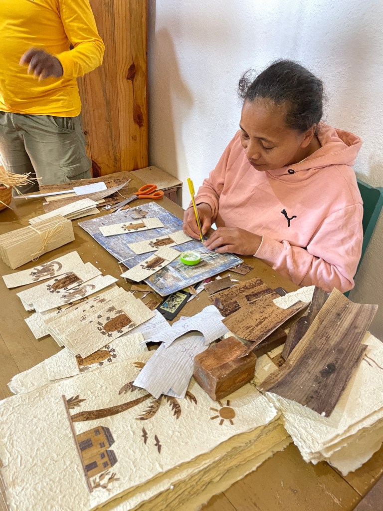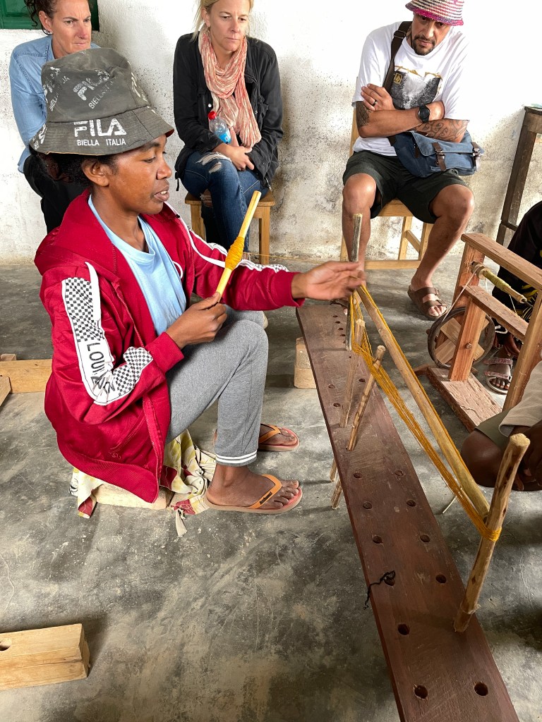 We enjoyed seeing the local artisans working at their crafts – wood carvers creating baobabs, lemurs, geckos, masks, and more; silk makers and weavers looming scarfs and shawls; straw plaiters making hats, mats, trivets, poufs, baskets and handbags; and paper makers crafting cards, envelopes, wall hanging, and gift bags from the bark of a tree. The work was all beautiful. It was interesting that many of the towns grew up around one industry – one with the wood carvers; one that specialized in recycling aluminum into pots and pans, utensils and trinkets; one that sold locals wines and rhum; one that sold precious gems – sapphires the most common; one with universities; as examples. About 20 percent of their population has finished high school and only 1% graduate from college. And even for that 1% jobs are hard to come by. Families normally stayed on the farm. When a son married they gave him a piece of land and built a house. Having a lot of children was a solid retirement plan but after many generations there is less and less land to distribute, some pieces too meager to maintain even a small family. It used to be a newly married couples wish to have seven boys and seven girls but now the average family size is closer to seven. But even that many puts a strain on the families and the land.