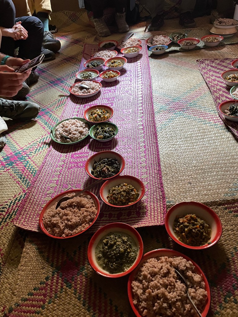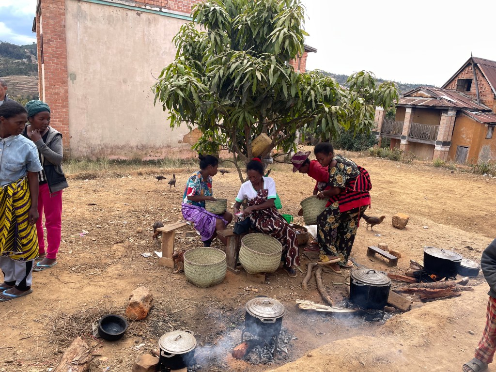 Twice we were served lunch in village homes and treated royally with traditional foods. Always rice, served with various dishes such as a medley of green beans and carrots, cassava, white beans, carrot salad, zebu meat, omelet, French fries, vegetable soup, or vegetable stew. Rice water was offered as the beverage. Our guide was quick to point out, this was a feast for the Malagasy, who usually ate rice three times a day with some vegetables, on rare occasions getting meat and eggs. If rice wasn’t available they had cassava – a starchy tuber similar to potatoes. In the towns and villages, they sold fry bread, a small sweet cake that looked and tasted kind of like a pancake, samosas, noodles tossed with vegetables and near the ocean, grilled fish. And always fruit, especially for breakfast or dessert- bananas, pineapple, tangerines, mandarins or a fruit salad. On our hikes, porters often cooked at the picnic areas and you could buy a wonderful lunch with a fresh vegetable salad, skewered meat or fish, noodles with veggies or zebu, drinks and fruit. Needless to say, we ate well