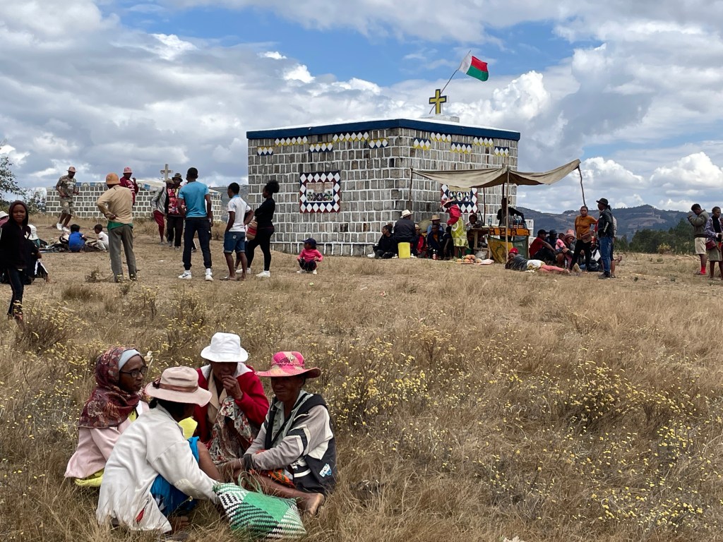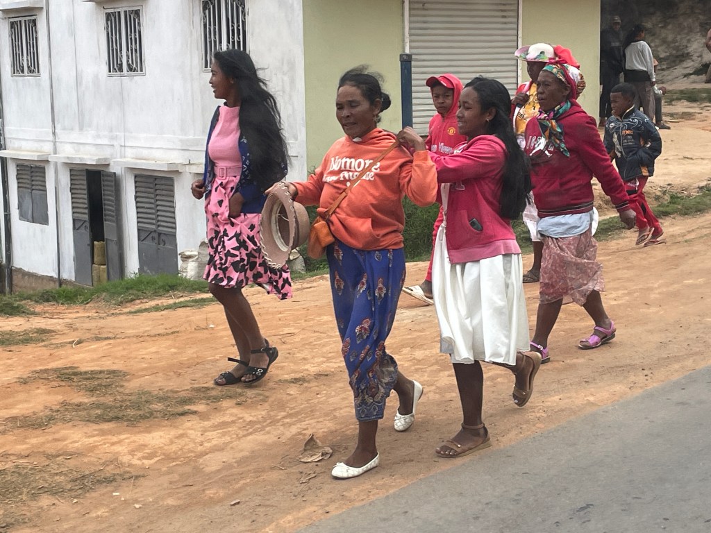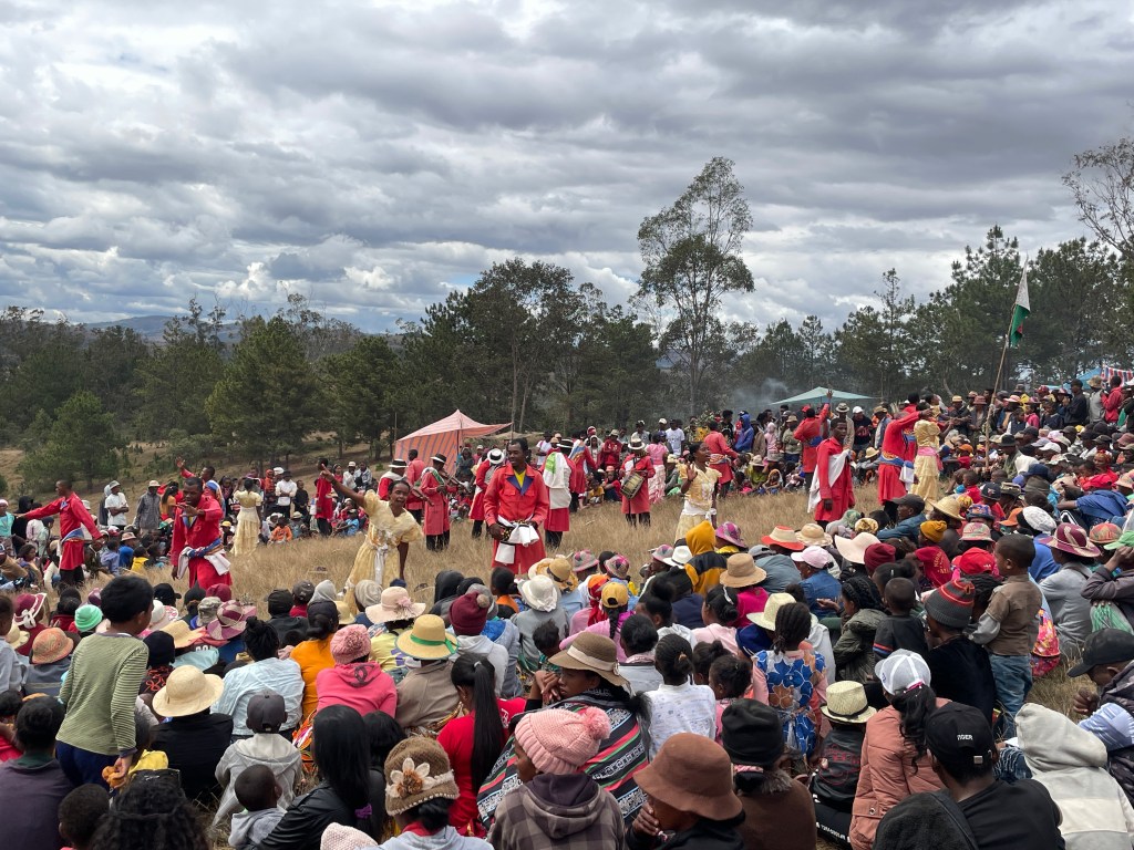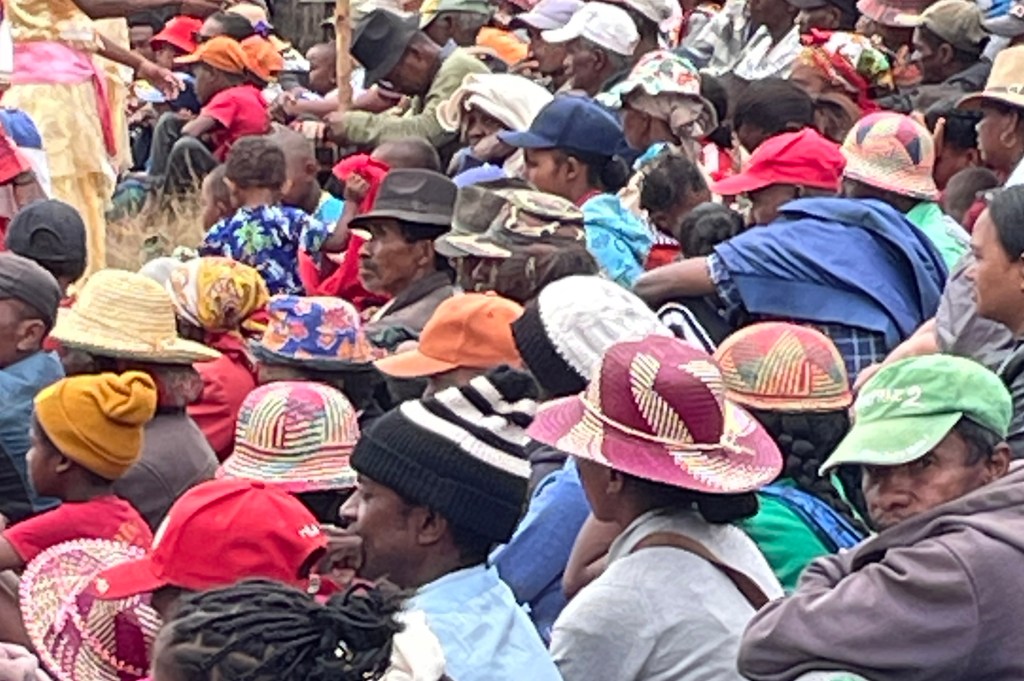 There are 18 tribes in Madagascar, each with its unique approach to living. One tribe, descended from the Masai, has only the most basic of homes instead their money is invested in zebu. The more zebu you have, the richer you are. Another believes that this life is not as important as the afterlife, so spends their wealth on their tombs. Big above ground mausoleums are brightly painted, often with their picture front and center. Another, invests in their houses. They may start with a basic two story structure with a thatched roof, but soon add a veranda and a deck, another wing or floor, or a tin roof, displaying their prosperity for all to see. Some of the tribes, don’t hold a funeral for a loved one right way, instead storing their remains in a cache of rocks until they have saved enough money to buy a zebu or two to feed the guests that come to honor the dead. Some only bury the bones, removing any flesh or sinew that remains before putting them into the tomb, others wrap the bodies in a shroud for burial. Some have individuals tombs as mentioned above and others family tombs. They turn the bones every seven years, gathering together for a feast and remembrance. We stopped by a bone turning, where there were hundreds of people. Men were chopping up zebu on blankets on the ground, people were talking in groups, there were tents with items for sale and tables for guests to pay their respects, leaving rice and money for the family. A great crowd was gathered around a party of men dressed in red suits with top hats and white sashes and women in long flouncy dresses, who sang and told stories