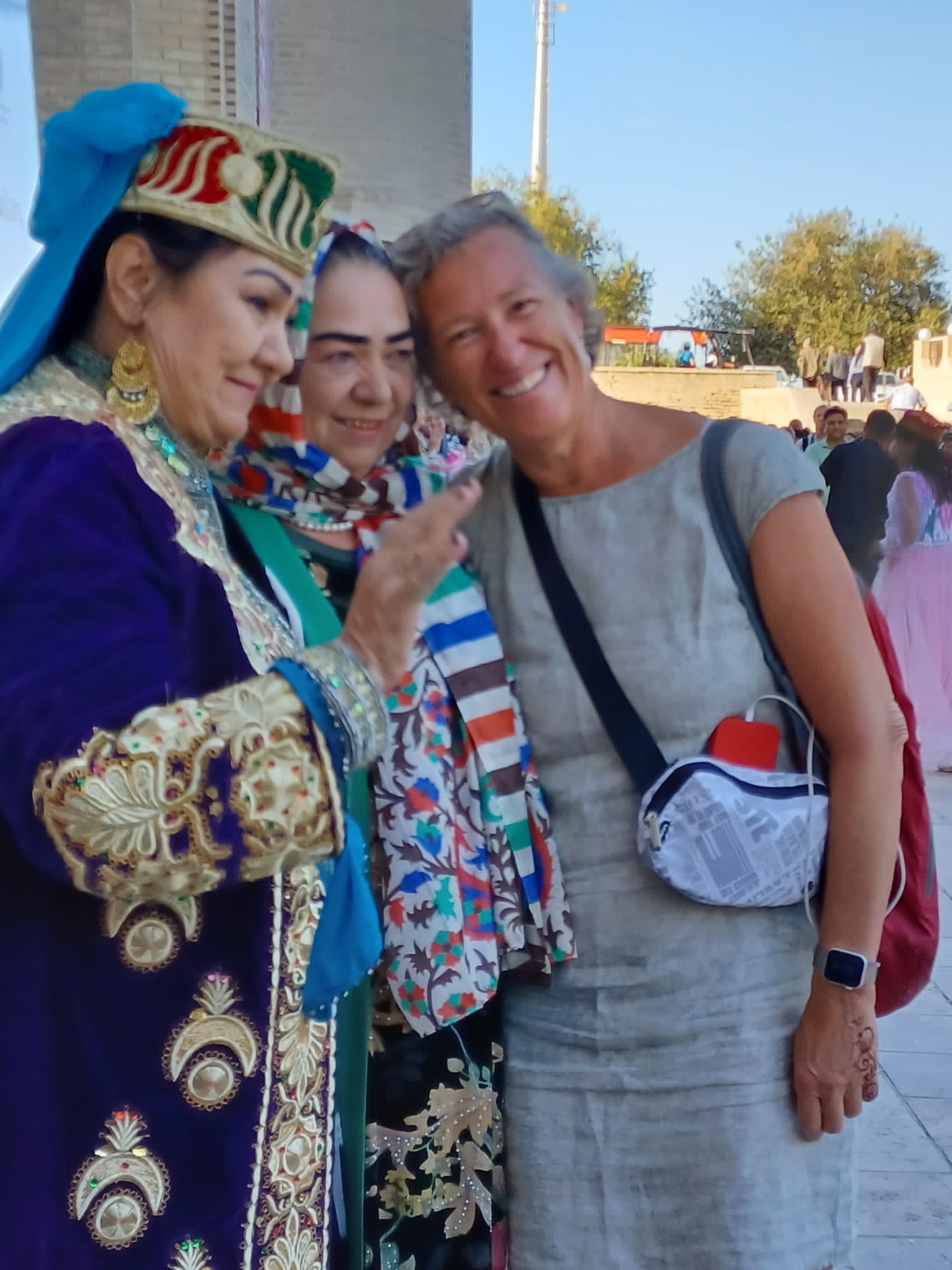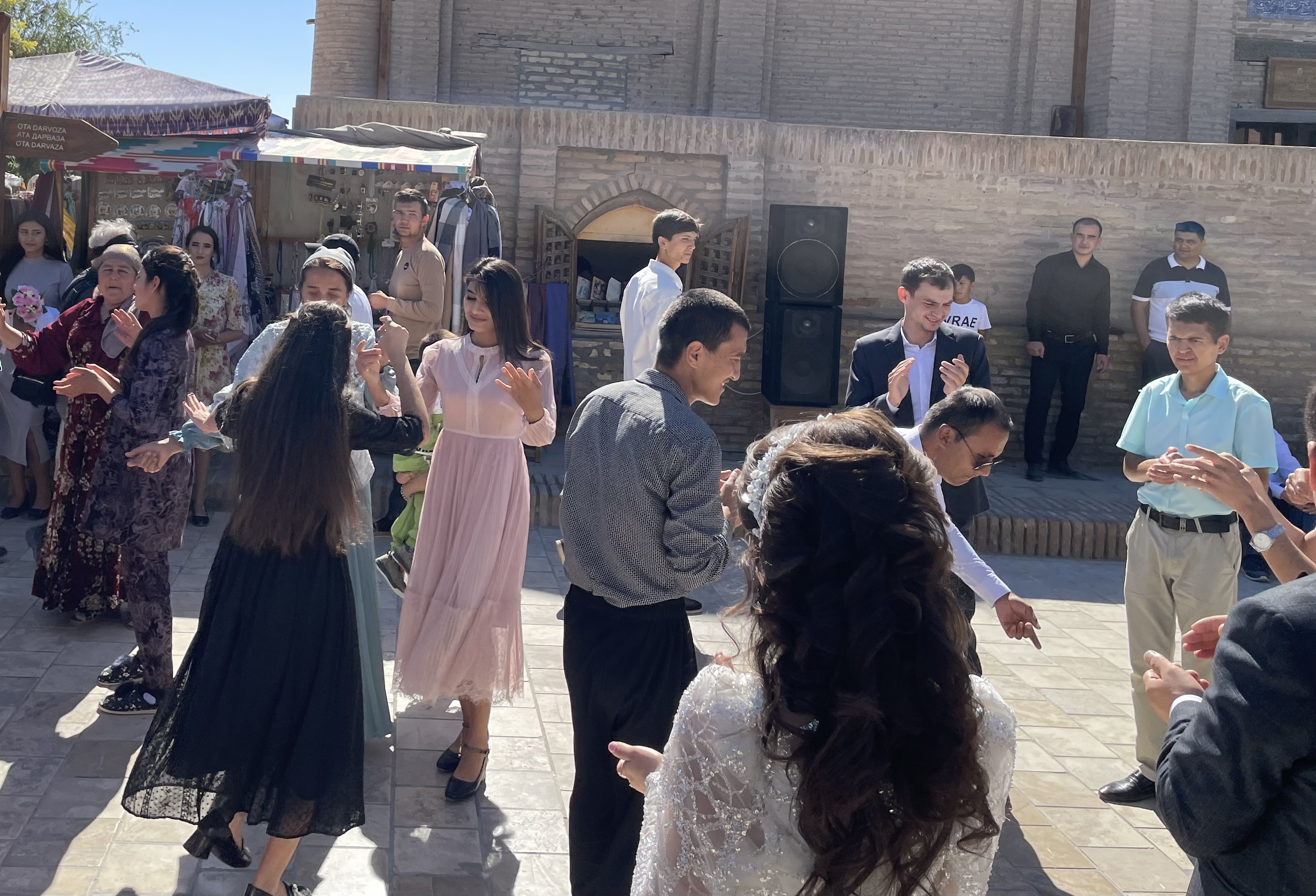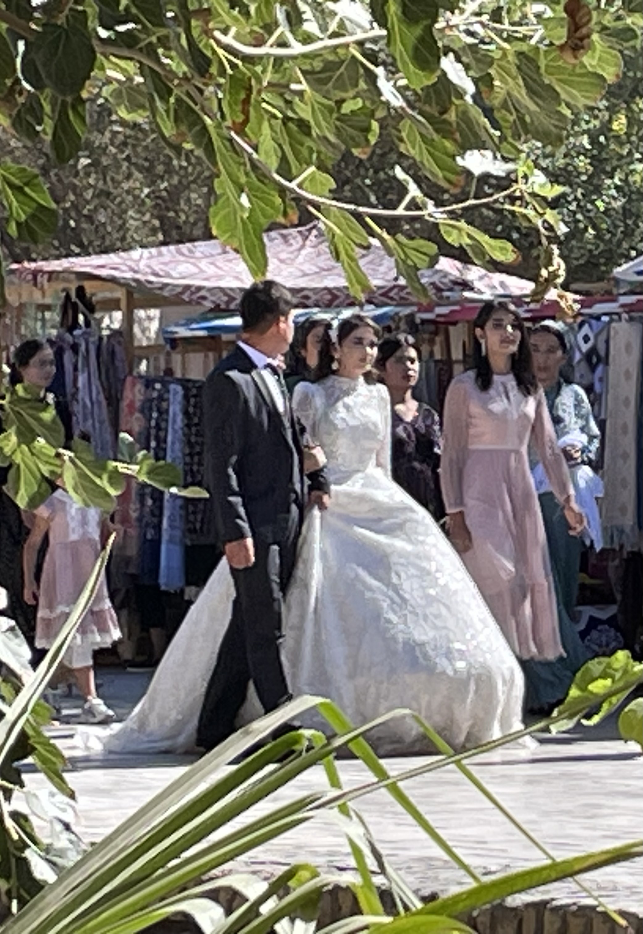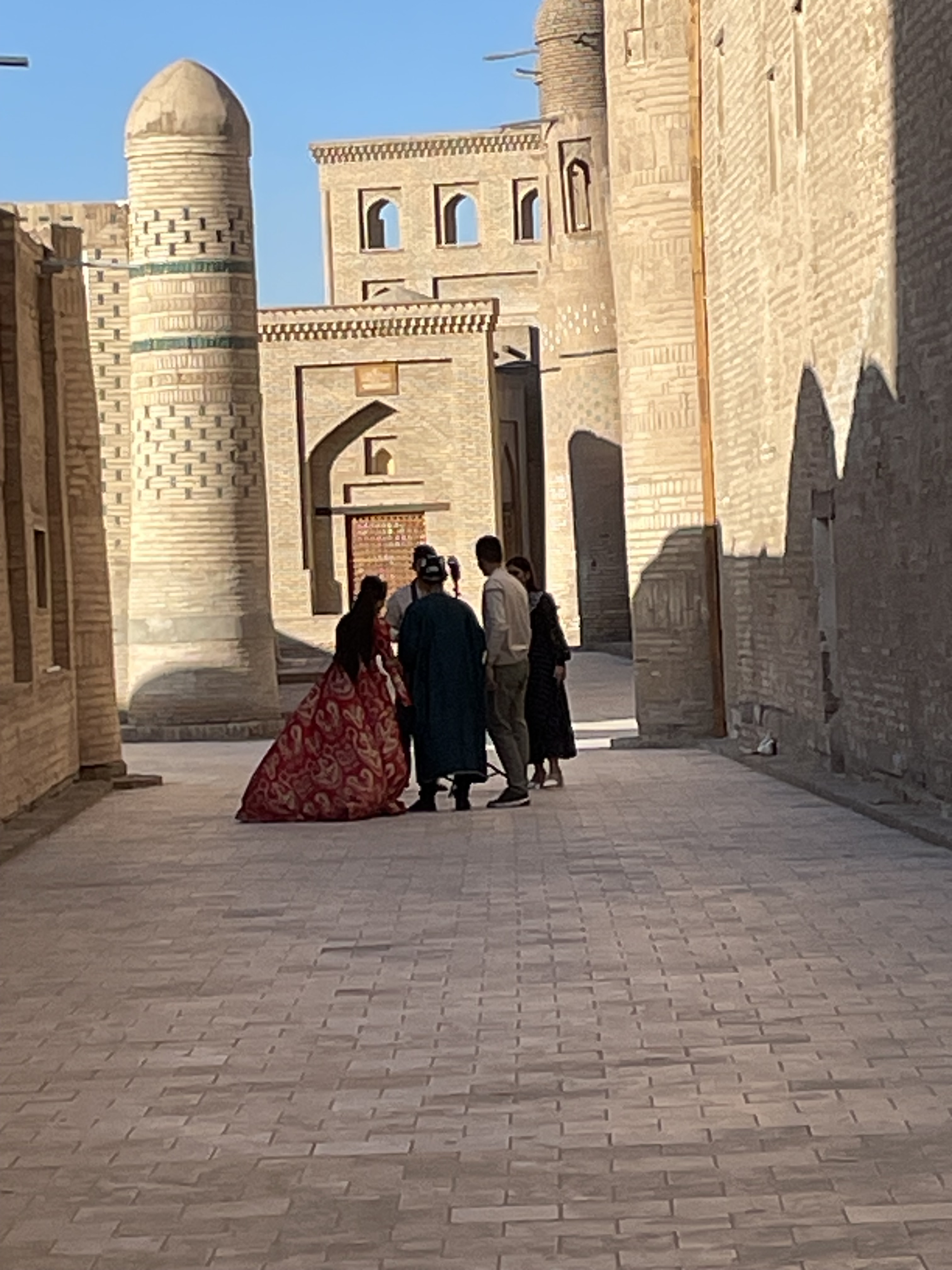 Uzbekistan has a population of 37 million with young people making up 60%. September is like May in the US, the best time to get married. One day in Bukhara, Guy and I were enjoying lunch and a beer in a small cafe near the main shopping street, when this procession came down the street towards us. The wedding dress the woman wore was a dead giveaway that this was a special occasion. The group stopped just in front of us, a boom box began playing loud music and the groomsmen gathered in a circle and began to dance for the bride and groom. Eventually they moved on, and then another group came, and another, all stopping to dance and take pictures. I think we saw 7 or 8 weddings, some in flowing white dresses, some in more traditional attire. We also saw couples around town getting their pictures taken in the matrimonial finery. Some of the women looked radiant, others not so much – there are still arranged marriages here. In Samarkand, we also saw several newly married women, dressed in velvet shifts, with pantaloons underneath and a headdress on.