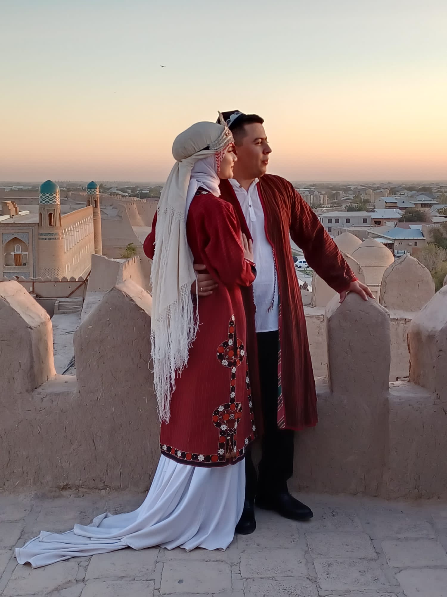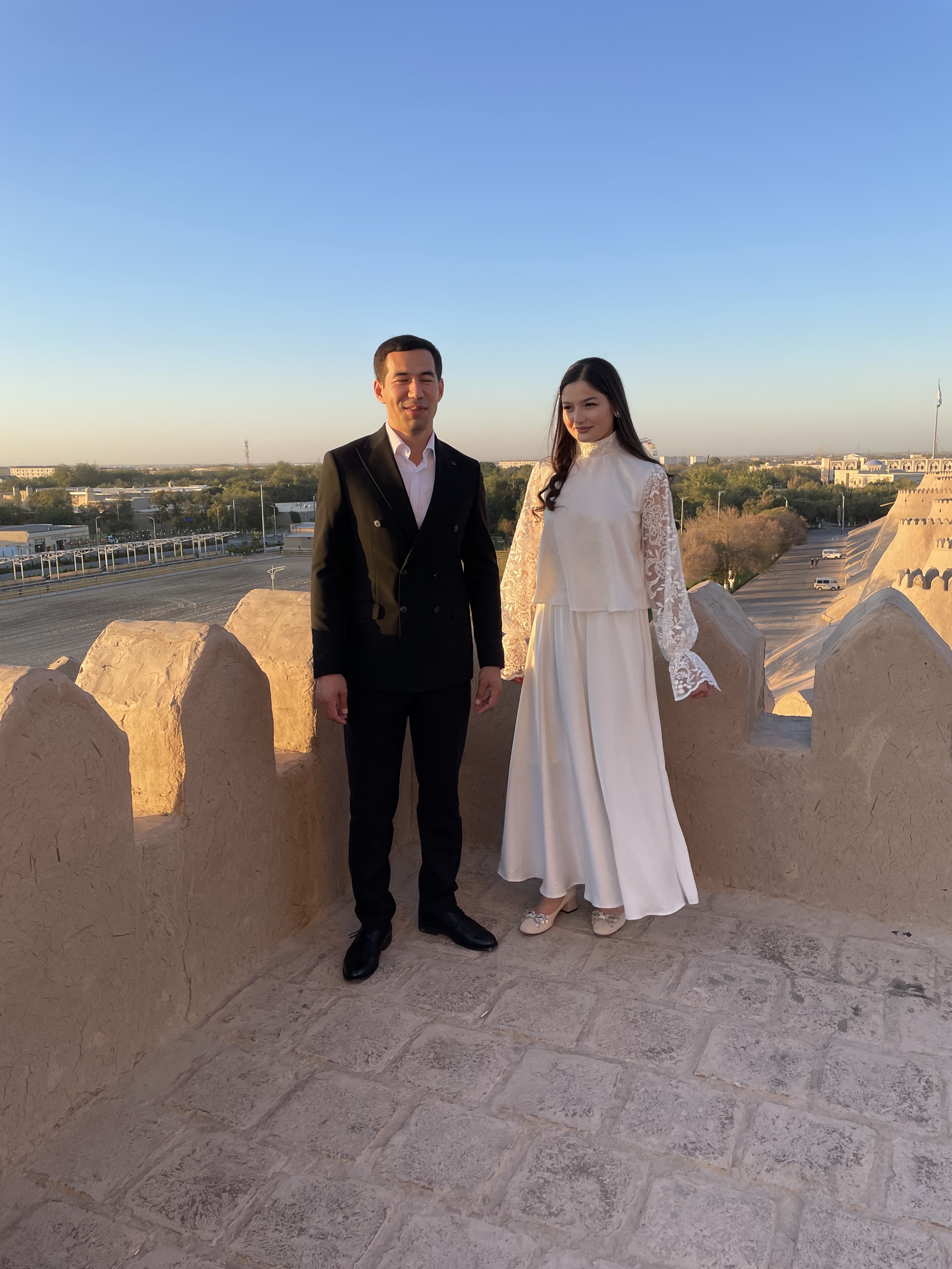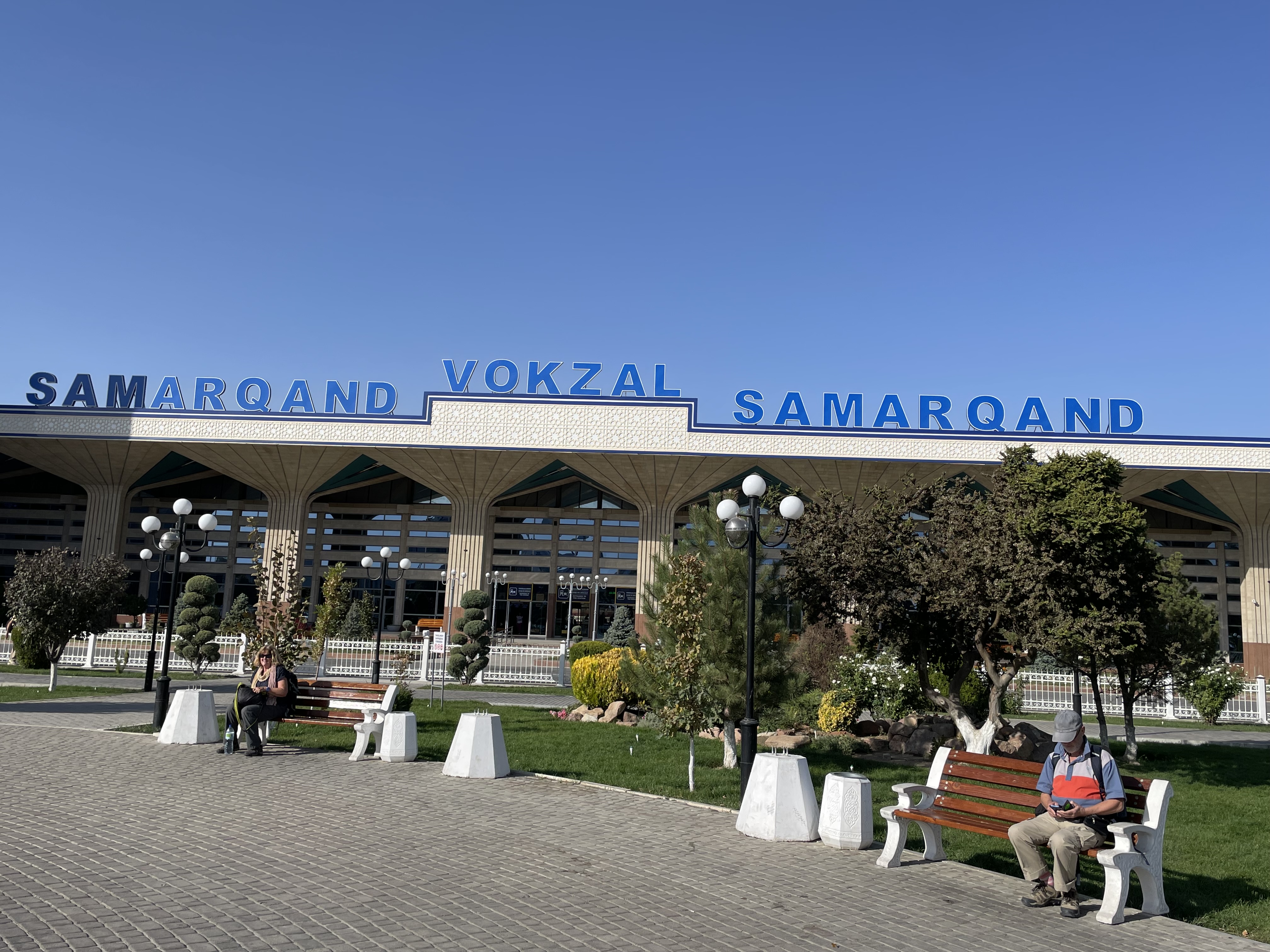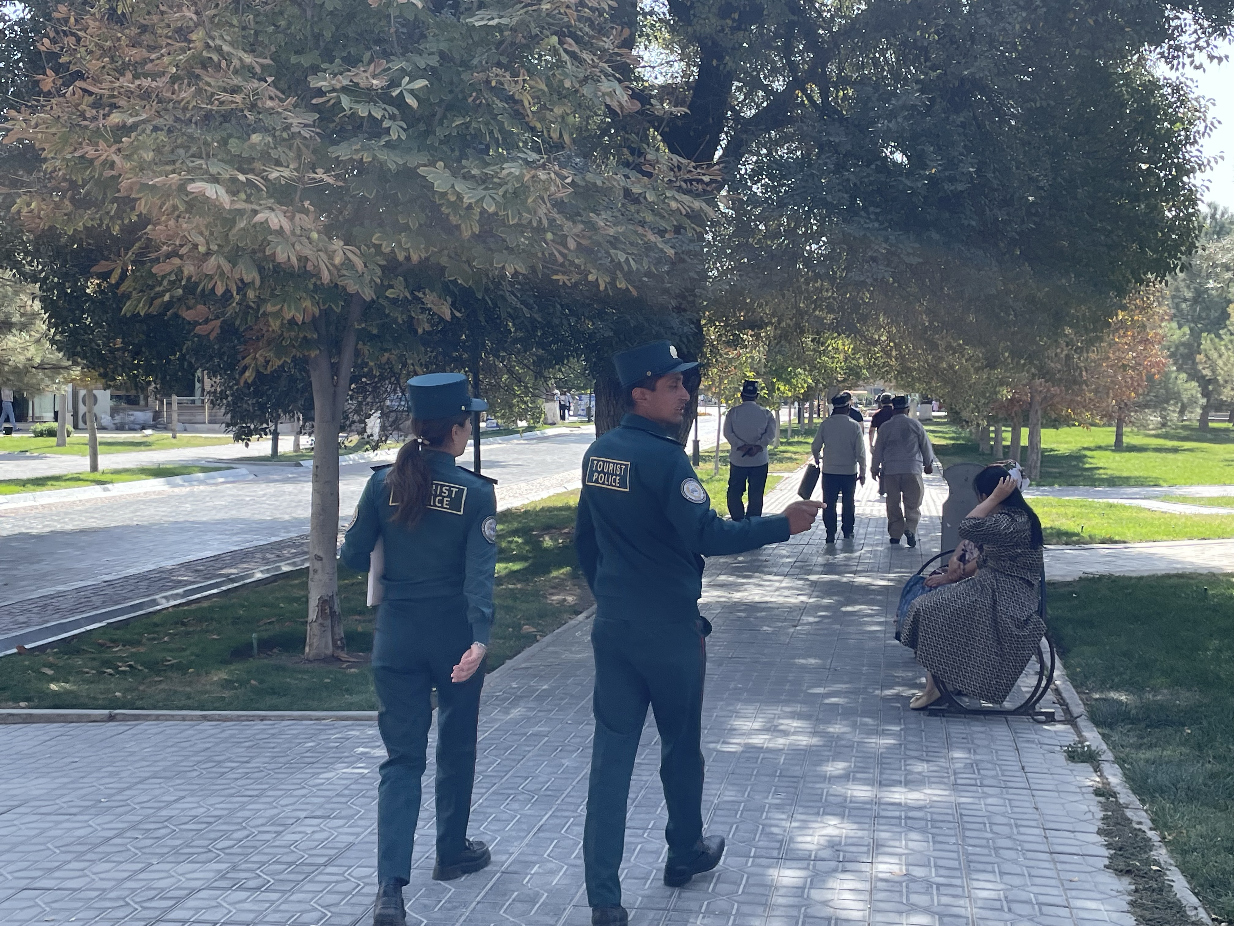 Uzbekistan has a population of 37 million with young people making up 60%. September is like May in the US, the best time to get married. One day in Bukhara, Guy and I were enjoying lunch and a beer in a small cafe near the main shopping street, when this procession came down the street towards us. The wedding dress the woman wore was a dead giveaway that this was a special occasion. The group stopped just in front of us, a boom box began playing loud music and the groomsmen gathered in a circle and began to dance for the bride and groom. Eventually they moved on, and then another group came, and another, all stopping to dance and take pictures. I think we saw 7 or 8 weddings, some in flowing white dresses, some in more traditional attire. We also saw couples around town getting their pictures taken in the matrimonial finery. Some of the women looked radiant, others not so much – there are still arranged marriages here. In Samarkand, we also saw several newly married women, dressed in velvet shifts, with pantaloons underneath and a headdress on.