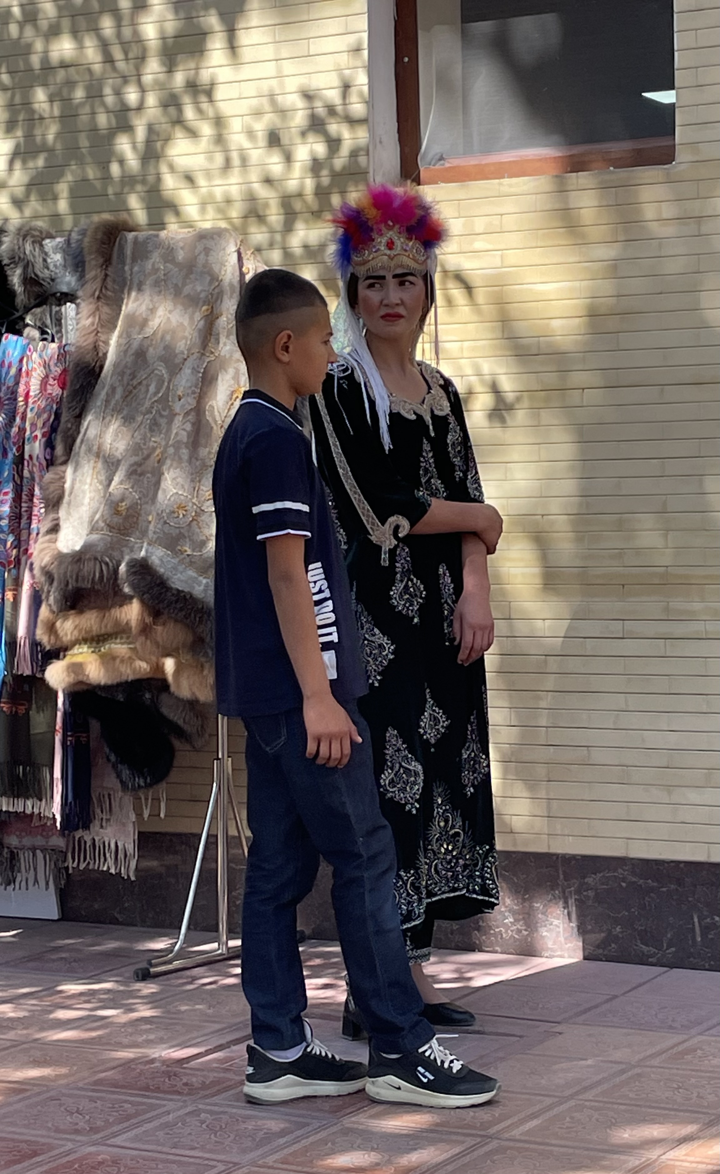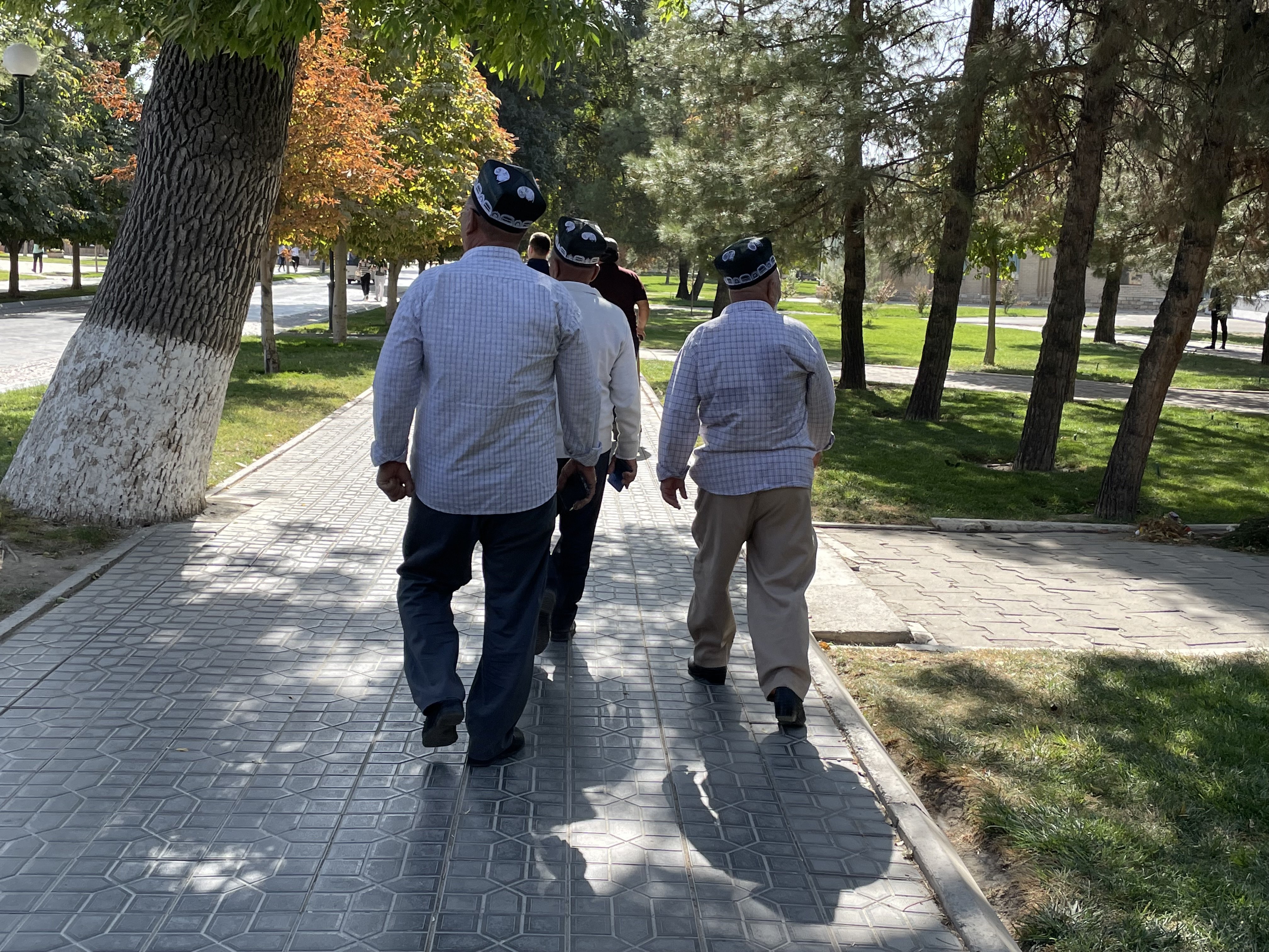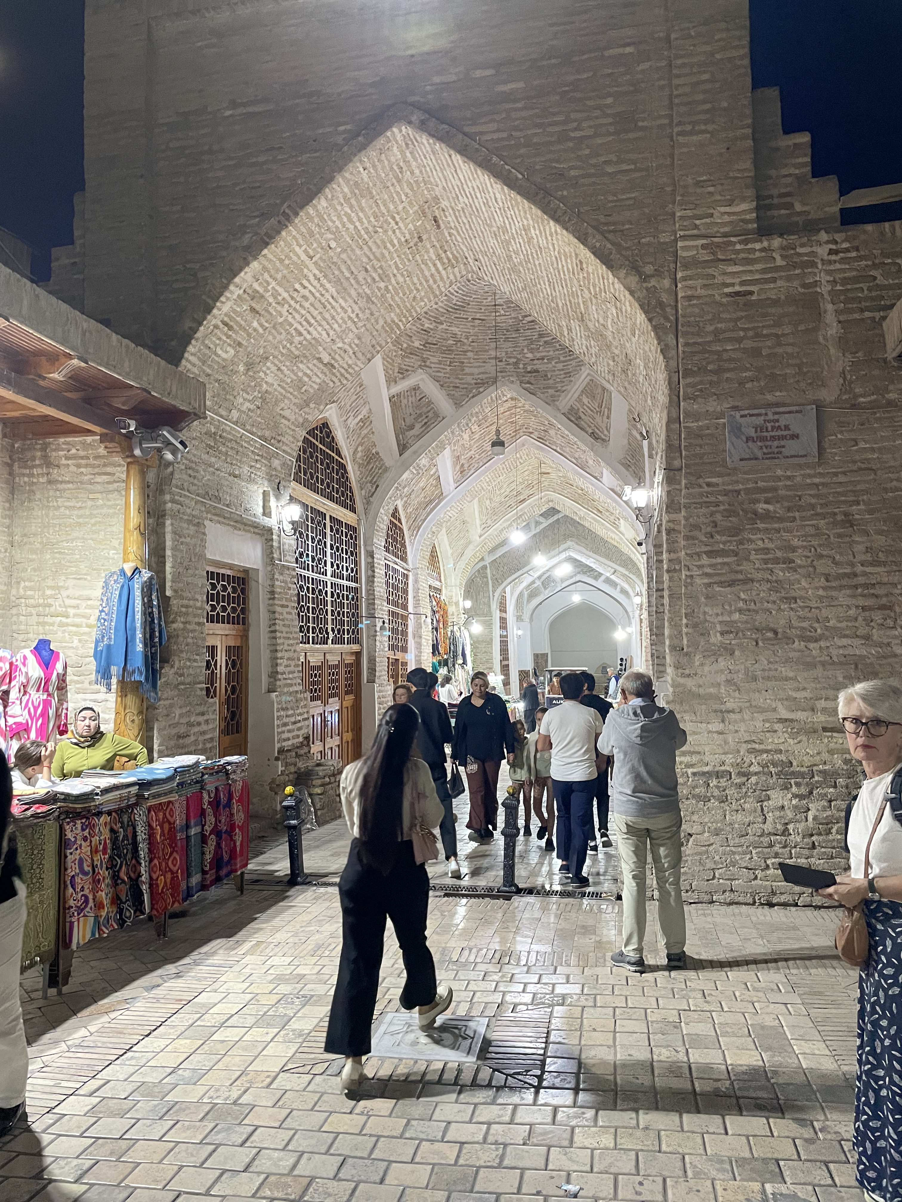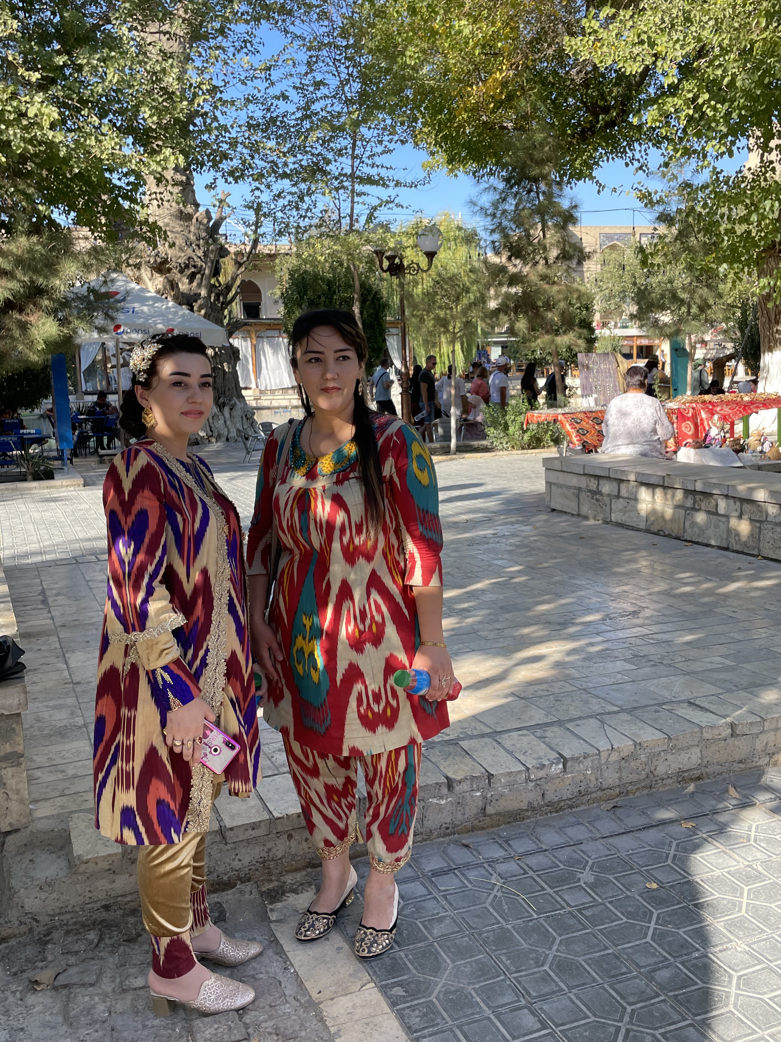 Uzbekistan is over 2600 years old. Once Zoroastrianism was the primary religion, but now the majority of its people are Muslim. However, it is a secular country which means the rules are much laxer here. Woman usually are wearing dresses that cover their knees or go to their ankles, some have their hair covered but much less than in Oman or Dubai. The dresses however have some bling! No drab black here. Velvet seems to be a popular fabric, but patterned with sparkles throughout. At first I just thought it must be some special occasion but no, women are wearing glittering robes everyday. Their traditional fabric is hard to describe, it’s multi-colored in a pattern sort of like a wood grain. The men are generally dressed in dark slacks with a collared shirt of some kind and a black embroidered skullcap. On the Silk Road, skullcaps were a way to tell where people came from as each region and country had their own version. Skullcaps are part of the traditional dress for the woman too but prettier. Of course, the younger generation are wearing more jeans.