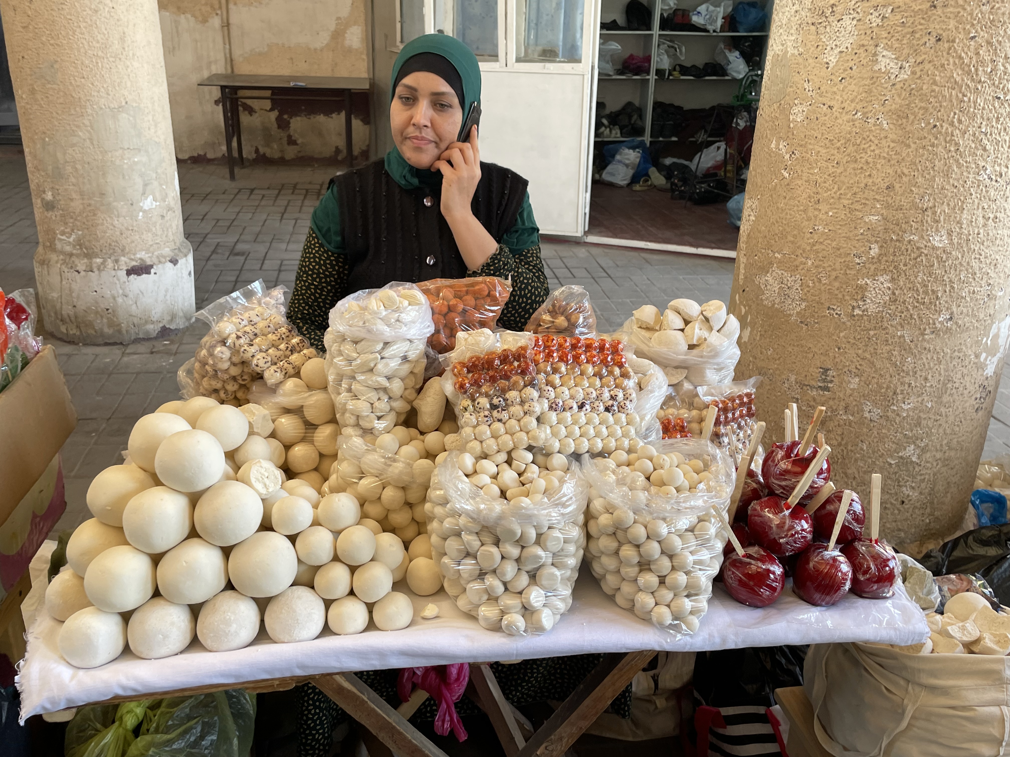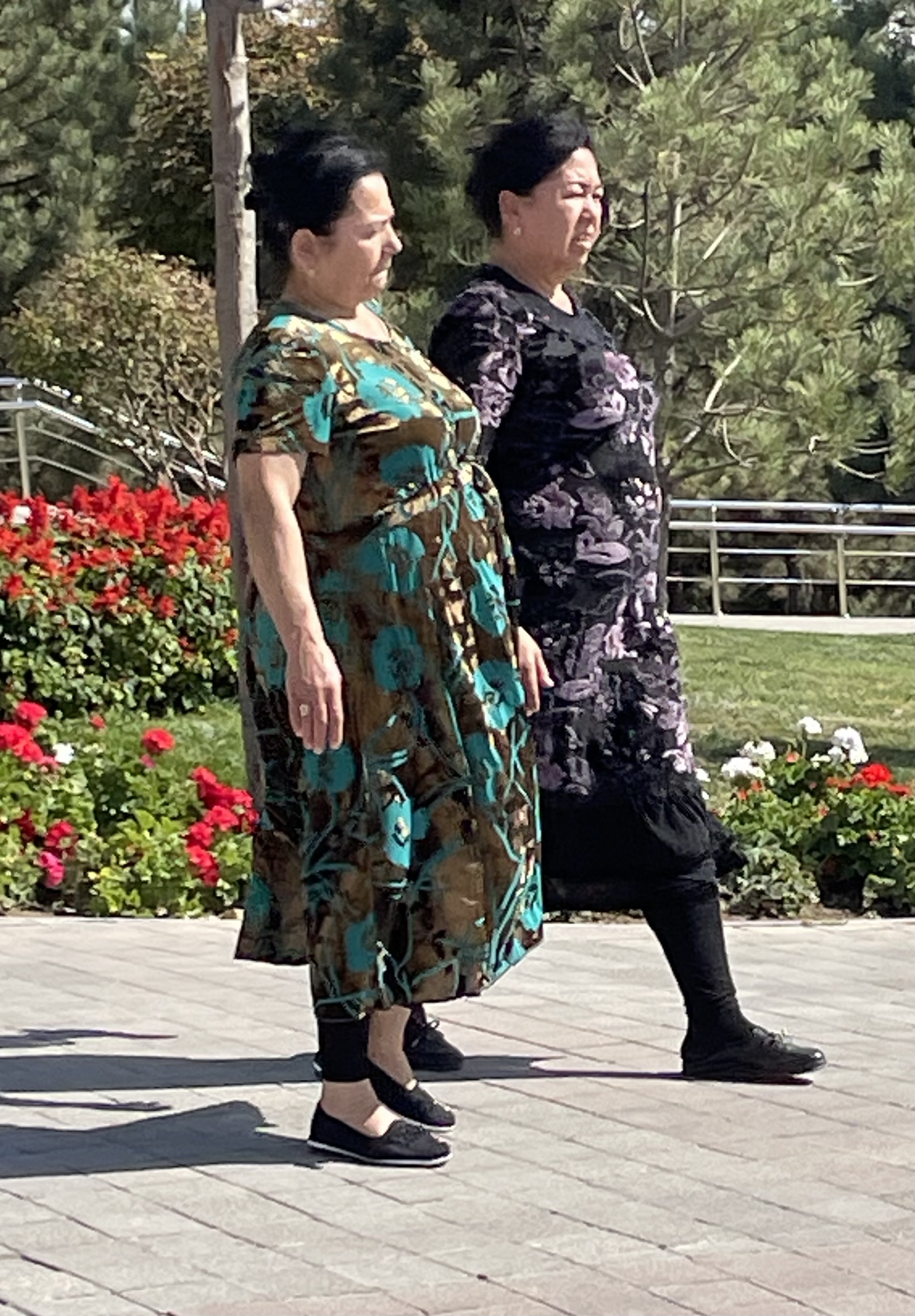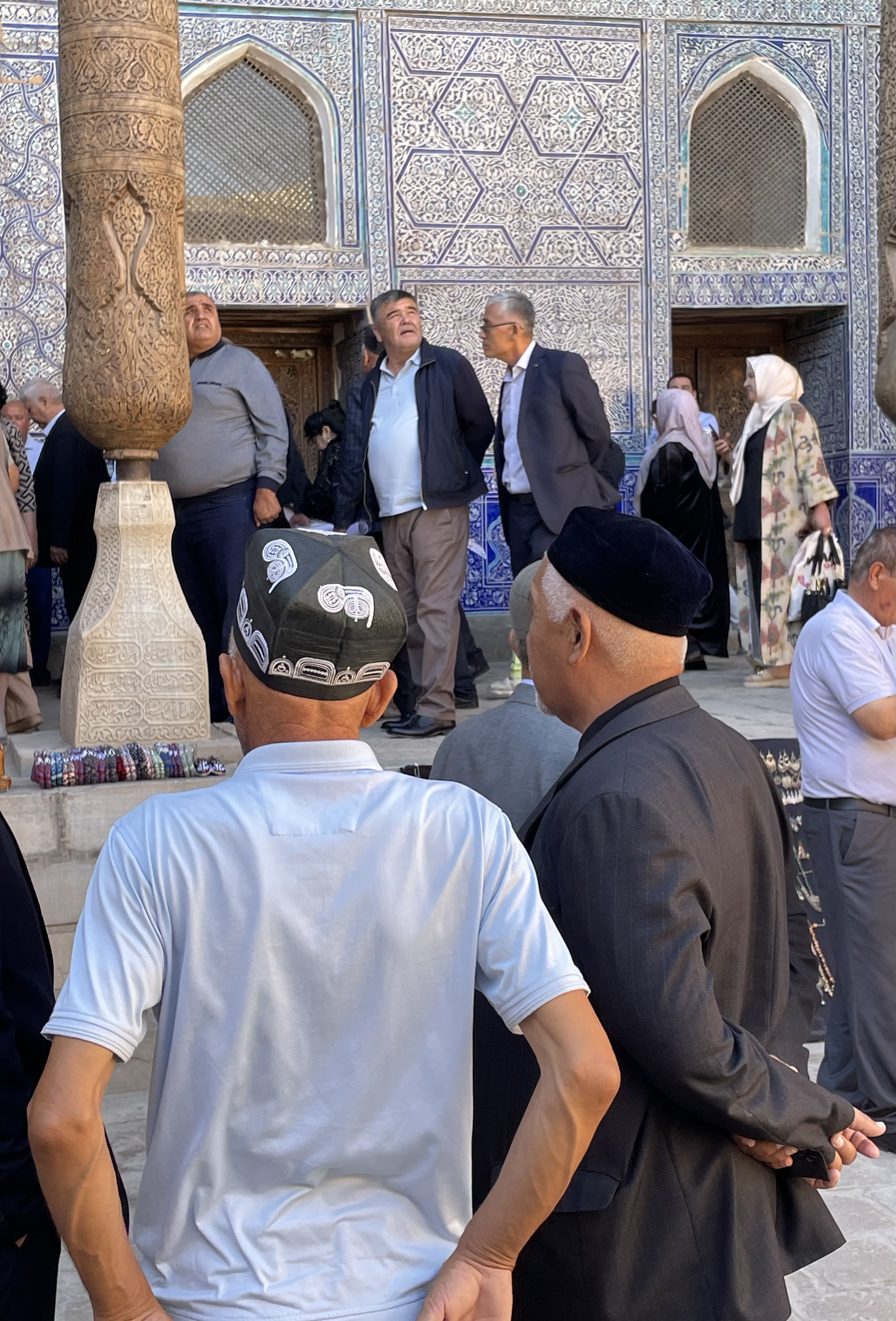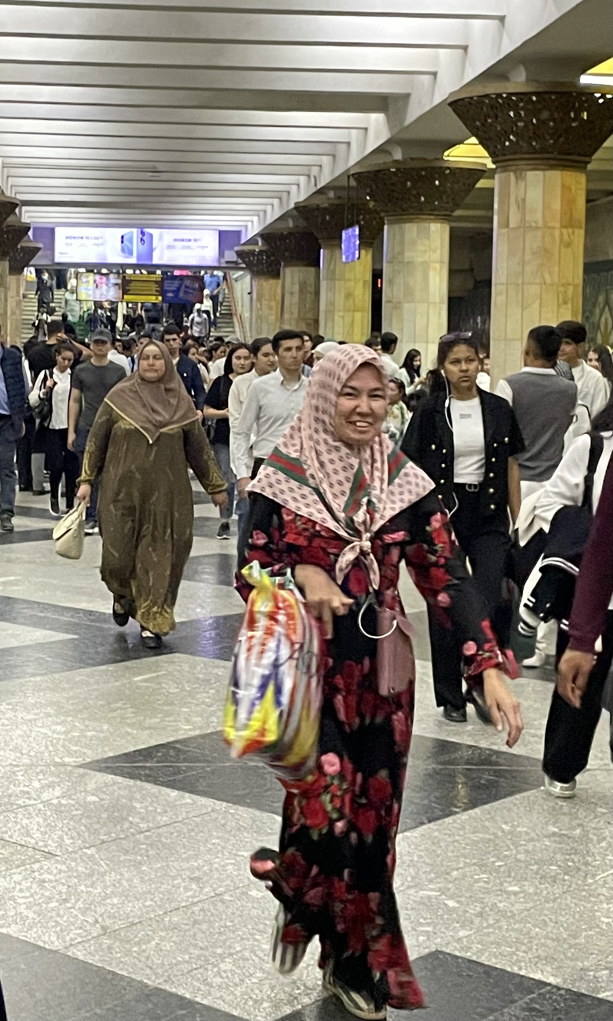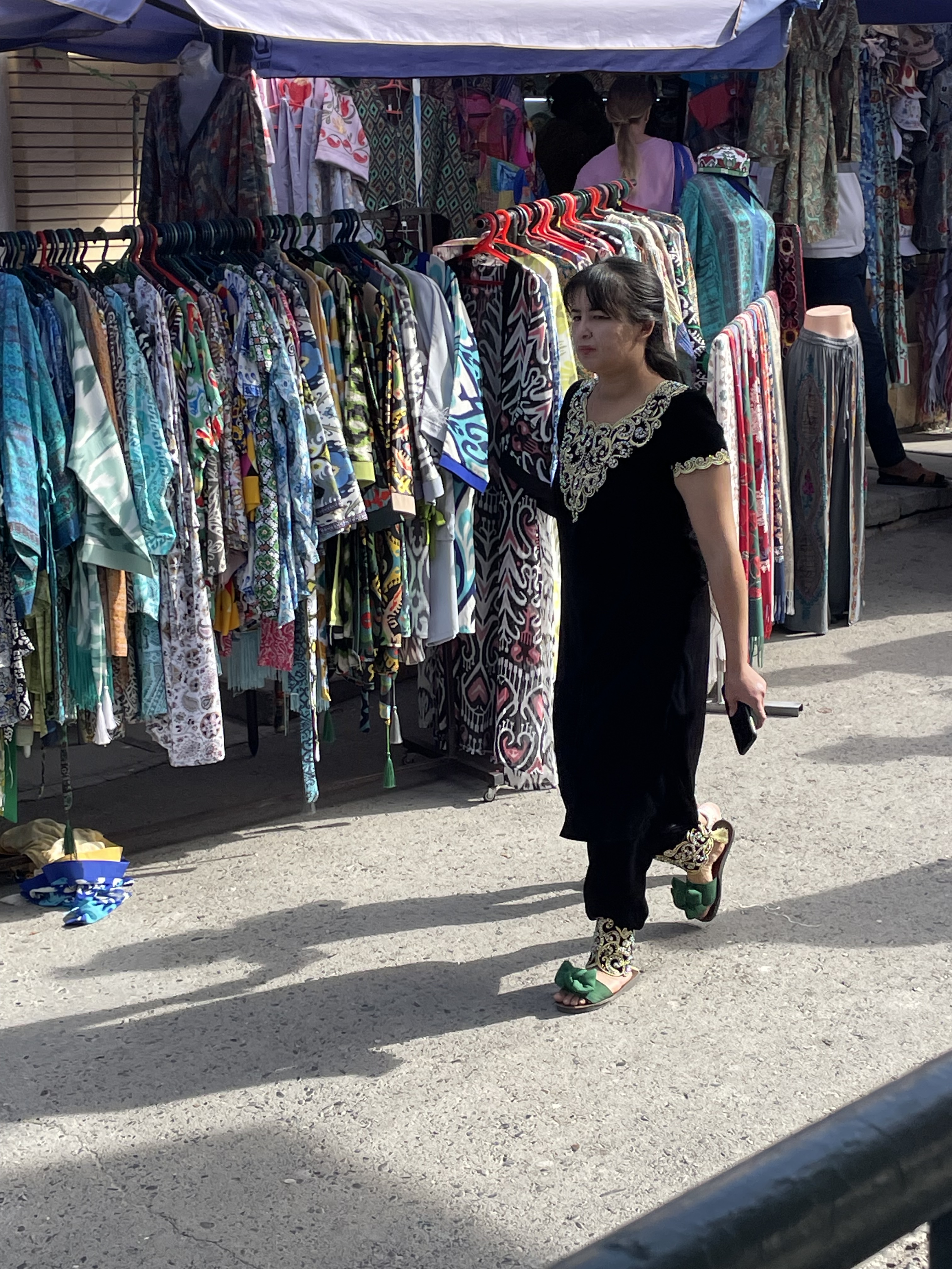 Uzbekistan is over 2600 years old. Once Zoroastrianism was the primary religion, but now the majority of its people are Muslim. However, it is a secular country which means the rules are much laxer here. Woman usually are wearing dresses that cover their knees or go to their ankles, some have their hair covered but much less than in Oman or Dubai. The dresses however have some bling! No drab black here. Velvet seems to be a popular fabric, but patterned with sparkles throughout. At first I just thought it must be some special occasion but no, women are wearing glittering robes everyday. Their traditional fabric is hard to describe, it’s multi-colored in a pattern sort of like a wood grain. The men are generally dressed in dark slacks with a collared shirt of some kind and a black embroidered skullcap. On the Silk Road, skullcaps were a way to tell where people came from as each region and country had their own version. Skullcaps are part of the traditional dress for the woman too but prettier. Of course, the younger generation are wearing more jeans.