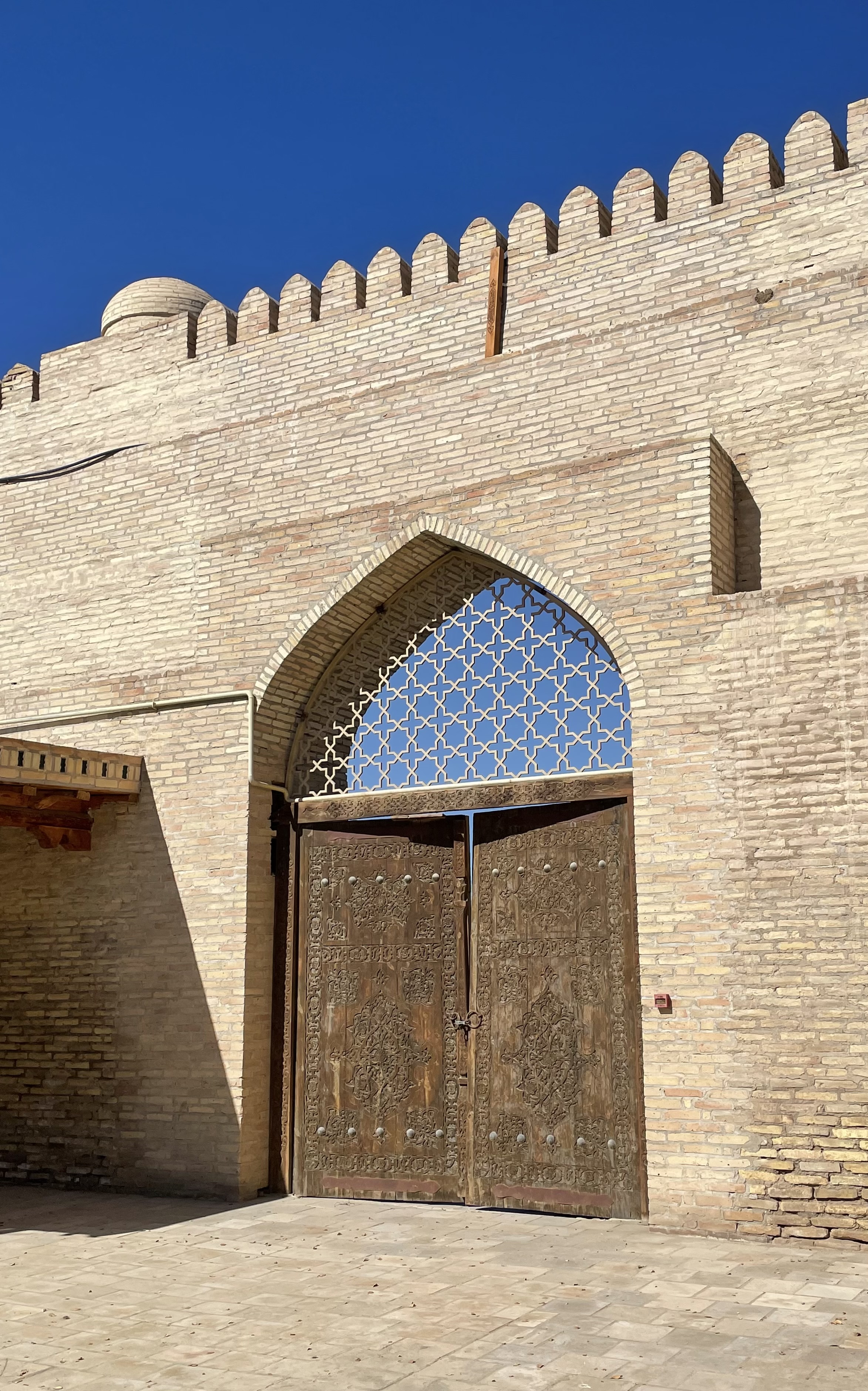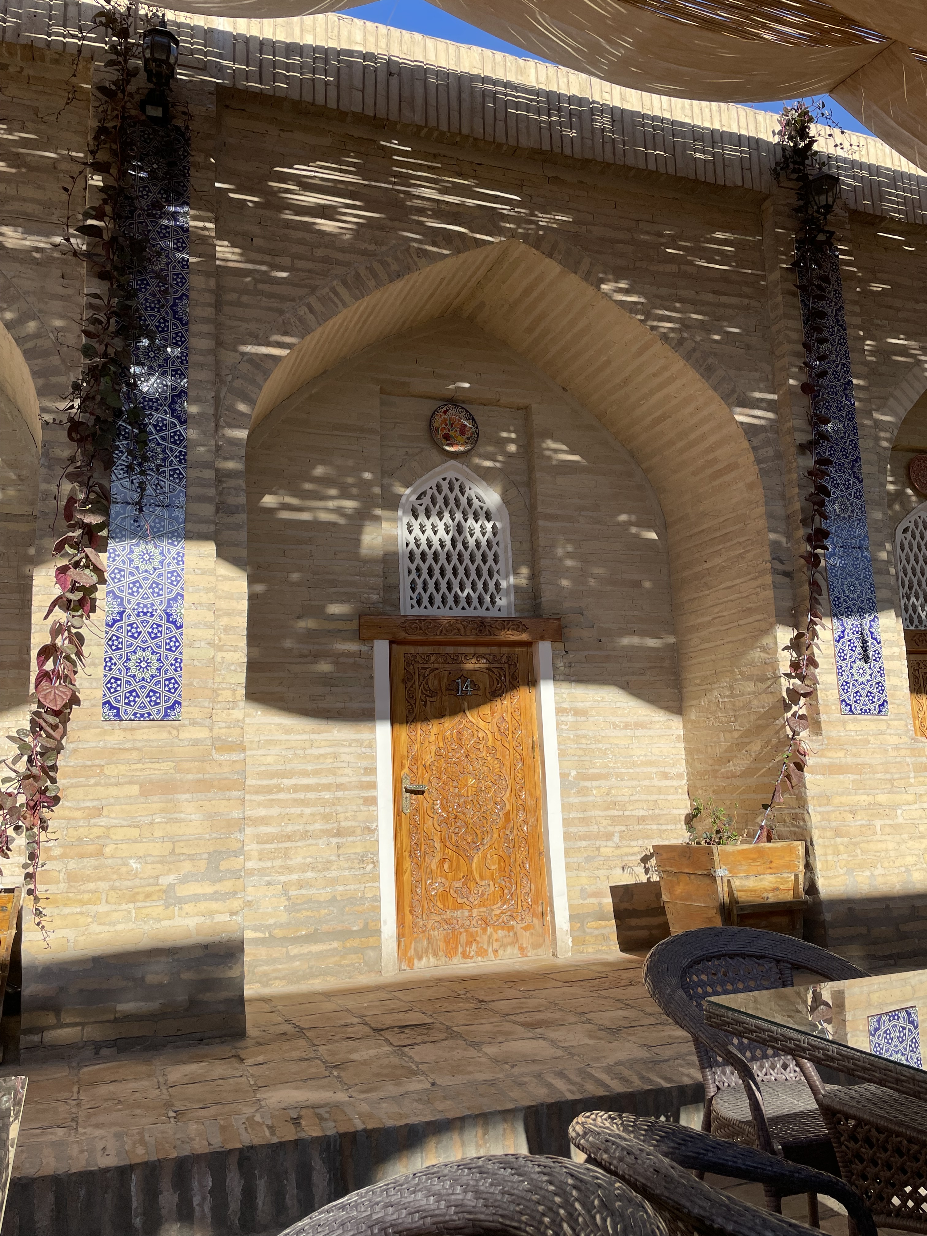 We visited more mosques, madrasas, palaces, mausoleums and caravansaries than I can count – some of them dating back to the 10th century, each of them stunning with their fabulous tile facades, decorated interiors, elaborate ceilings, and carved pillars and doors. The tiles come in thousands of designs incorporating stars, moons, flowers, geometric shapes, animals, etc in brilliant colors of cobalt blue, turquoise, white, yellow, green, gold and red. The large elaborate entryways are home to dozens of tile variations. The use of tile to decorate buildings is not limited to the historical sites but seen on buildings throughout the cities. Because of the climate here, the tiles need to be replaced every 15 to 20 years, providing the ceramic artisans a steady business. Two mausoleums from the 10th century were built modestly with just bricks, but the variation in the brick patterns was complex and delightful. One, was the first known time a round dome was built with square bricks. The aqua colored domes and minarets were enchanting, such a rich color, and seen throughout the country.