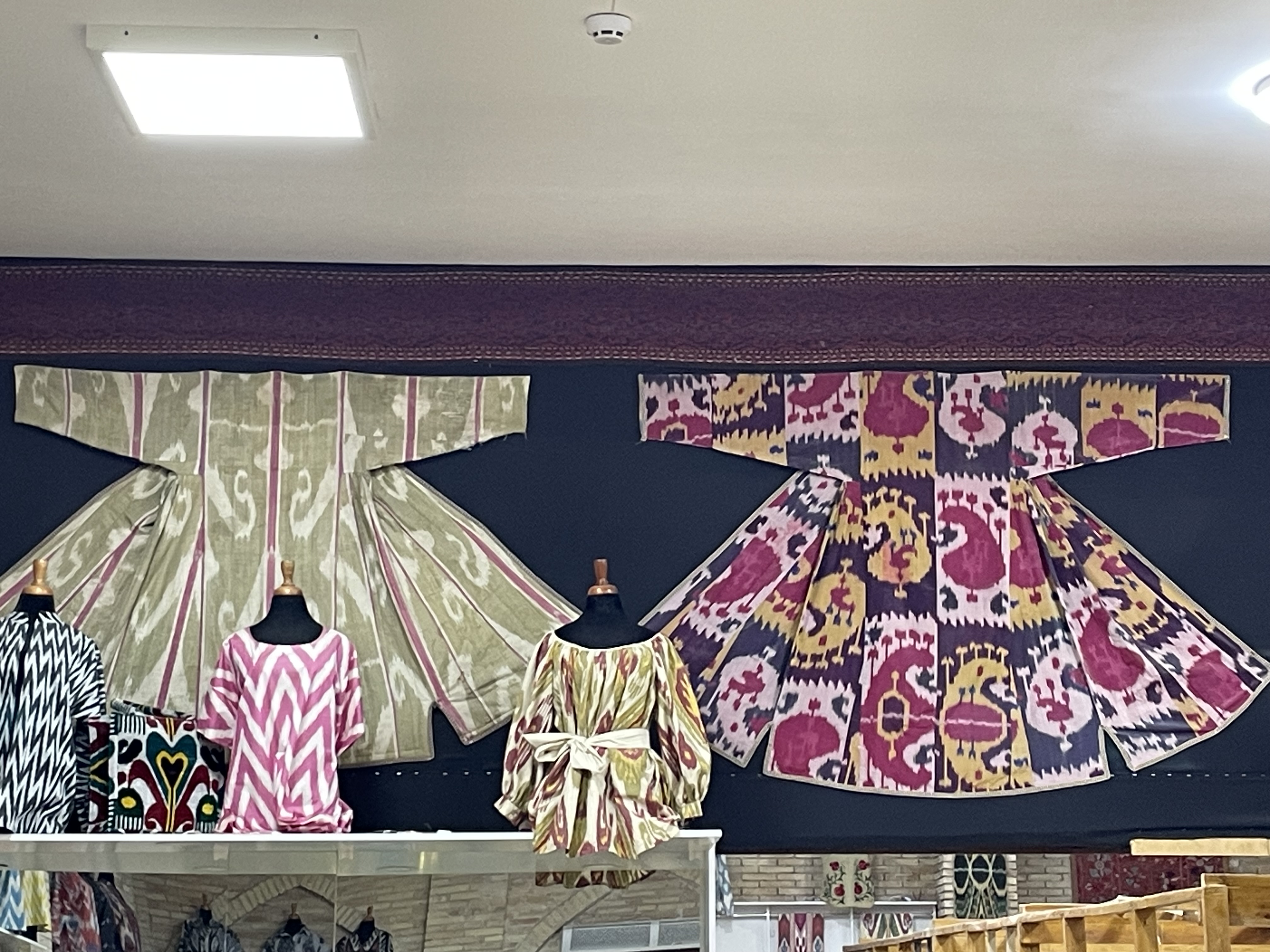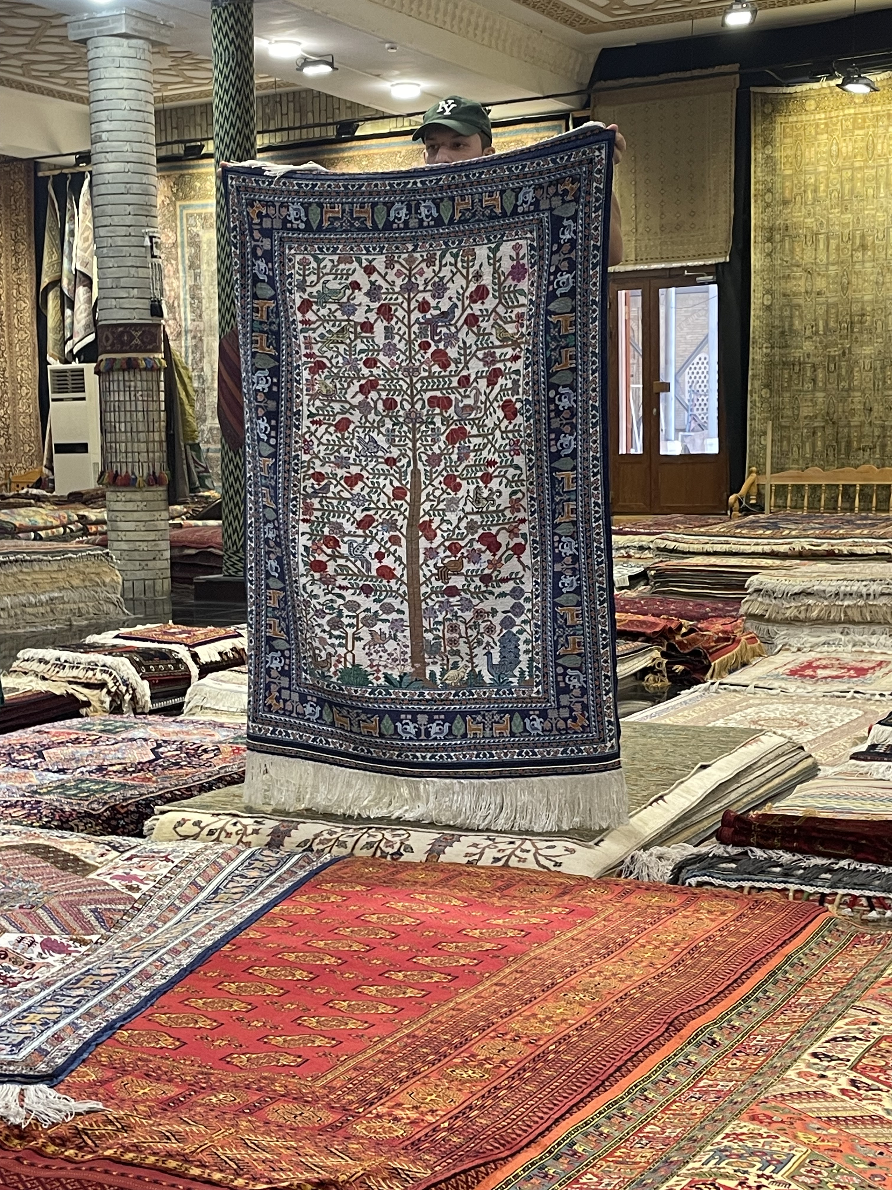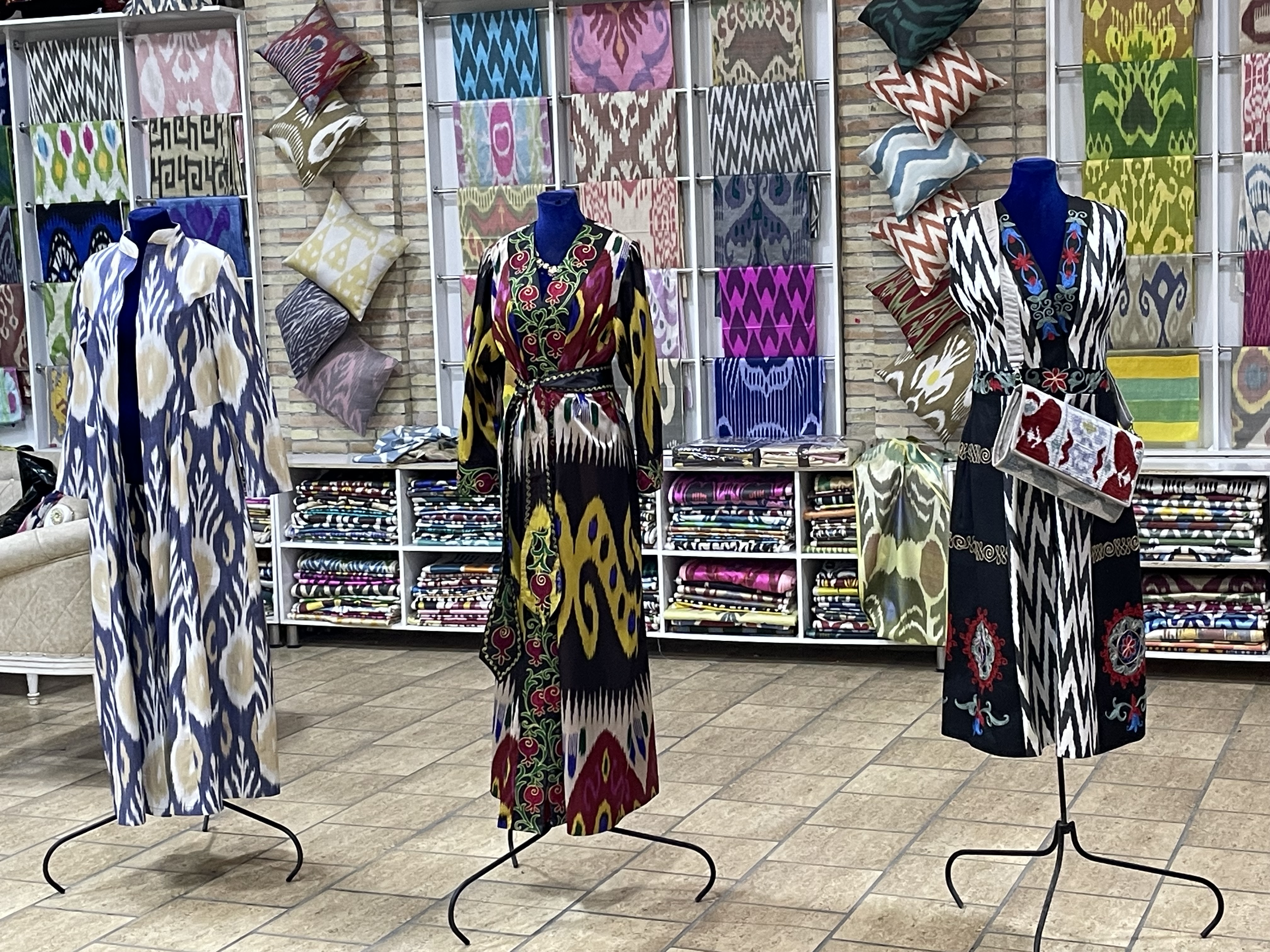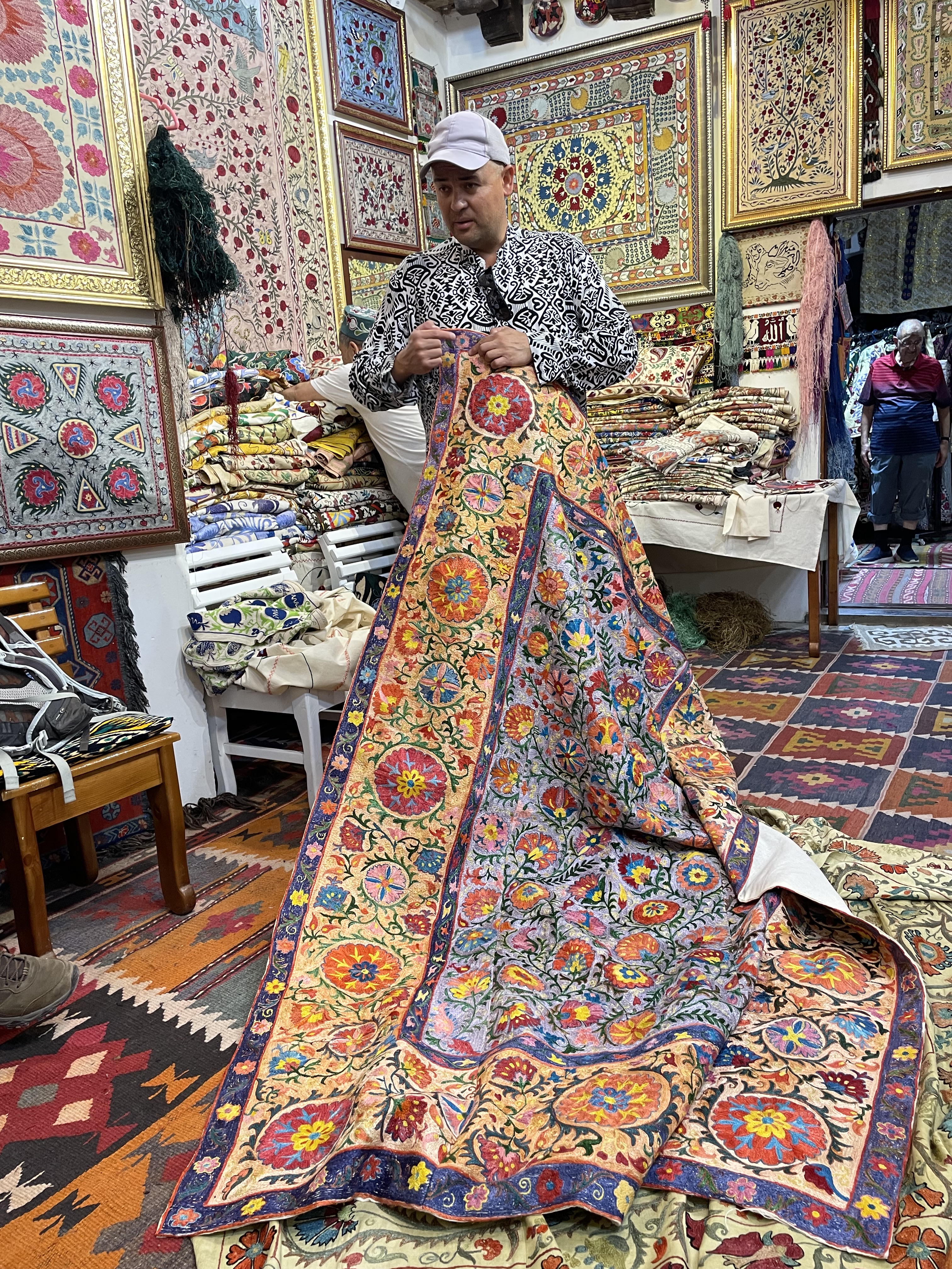 In some ways, the sites felt very touristy, as they were selling souvenirs everywhere, even in mausoleums. But it was also reminiscent of the past, when the Silk Road was active, as these places were trading centers and celebrated for their craftsmanship. The cities are filled with stores and workshops with handiwork of artisans, generations in the making. Many workshops are schools for new devotees to learn the crafts, more than a few starting from a very early age. Items for sale beyond the key chains and fridge magnets were: magnificent knives honed from titanium and Damascus steel; beautiful embroidered items such as wallhangings, pillow covers, tote bags, bedspreads called susani; splendid hand knotted silk and wool rugs; colorful ceramic tiles, platters, bowls, teapots, and cups; beautifully fashioned silk and cotton clothing; exquisite painted miniatures; and much more. I profess I bought more than one of these items and was tempted to make further purchases.