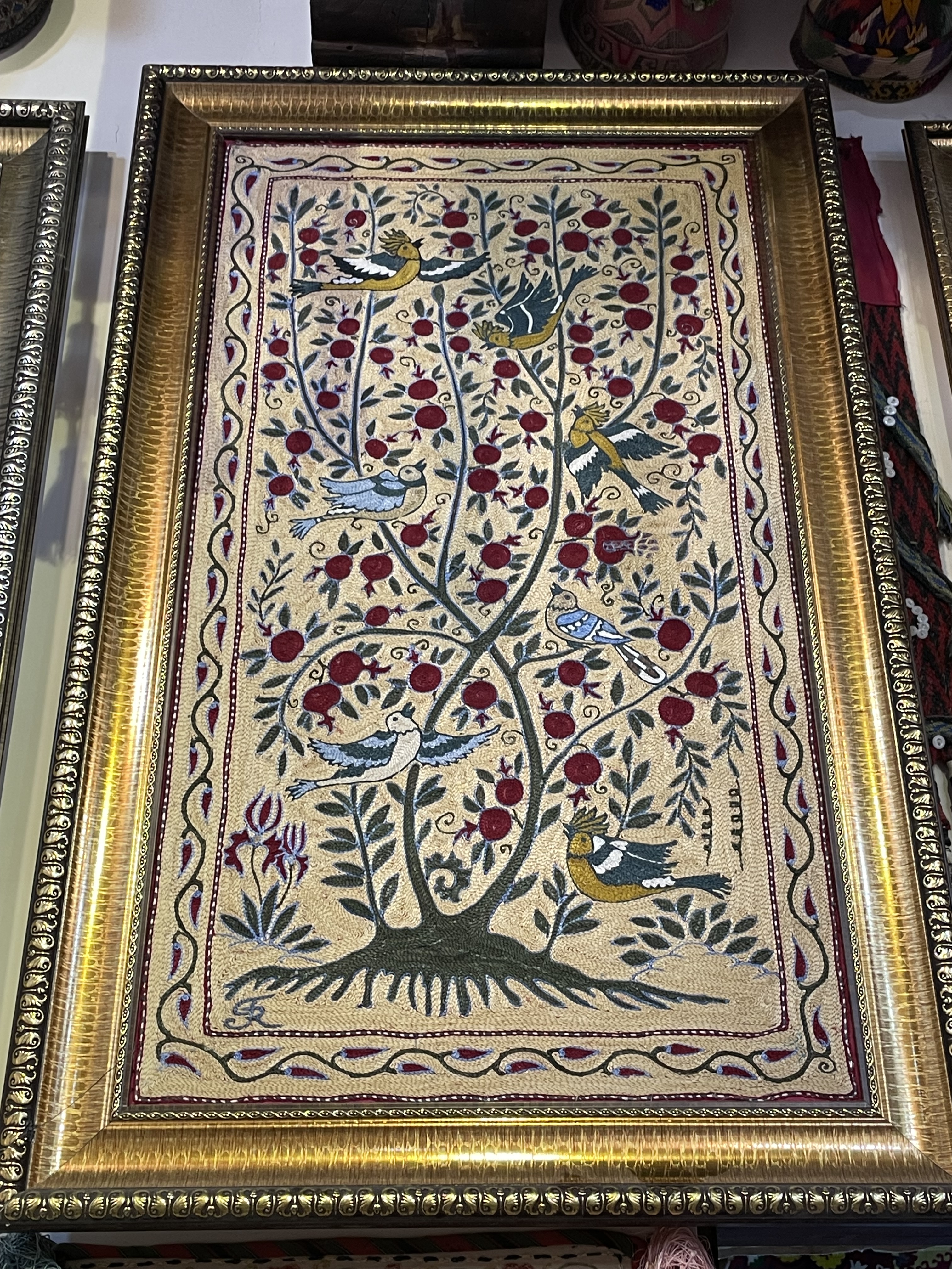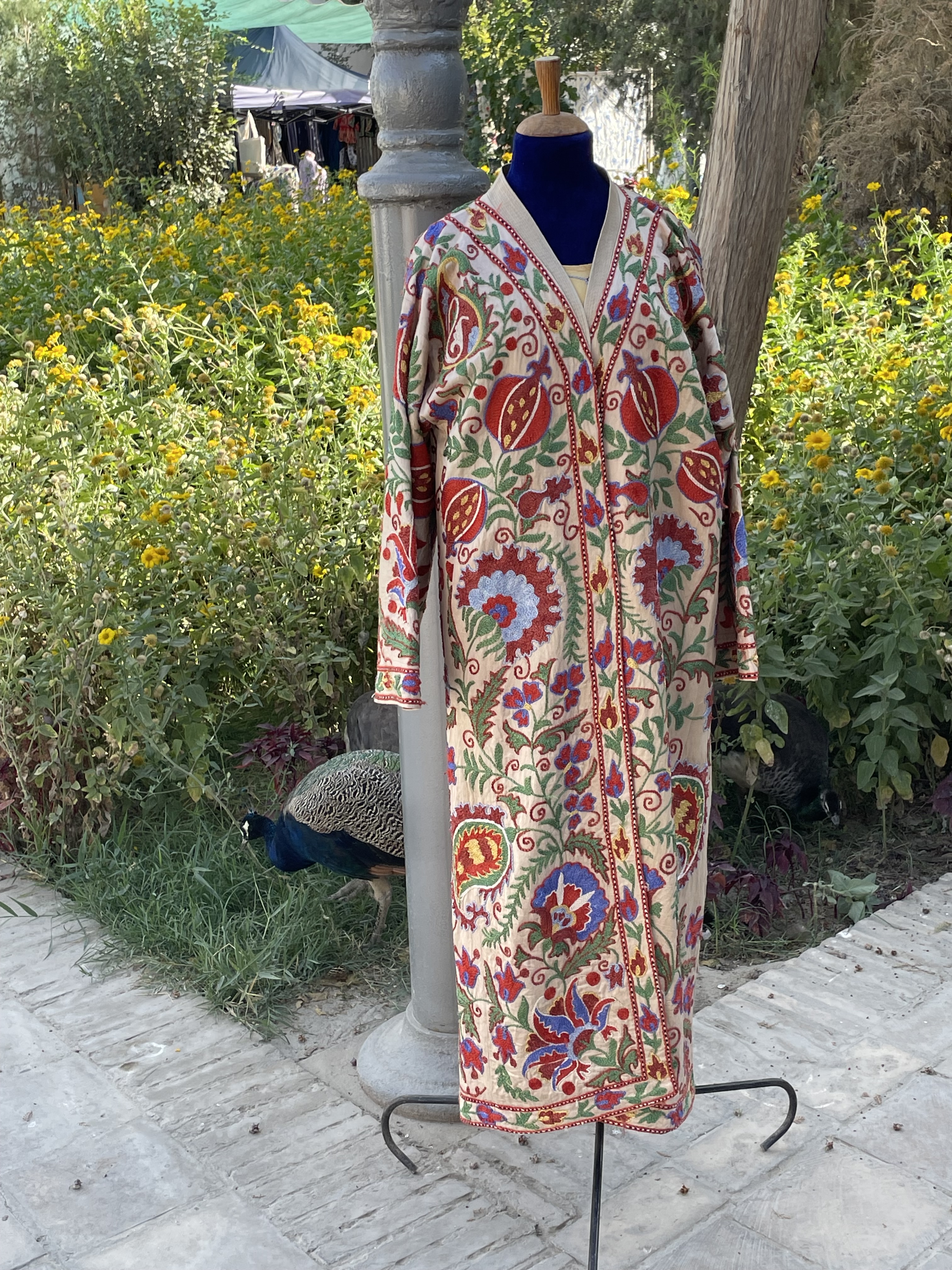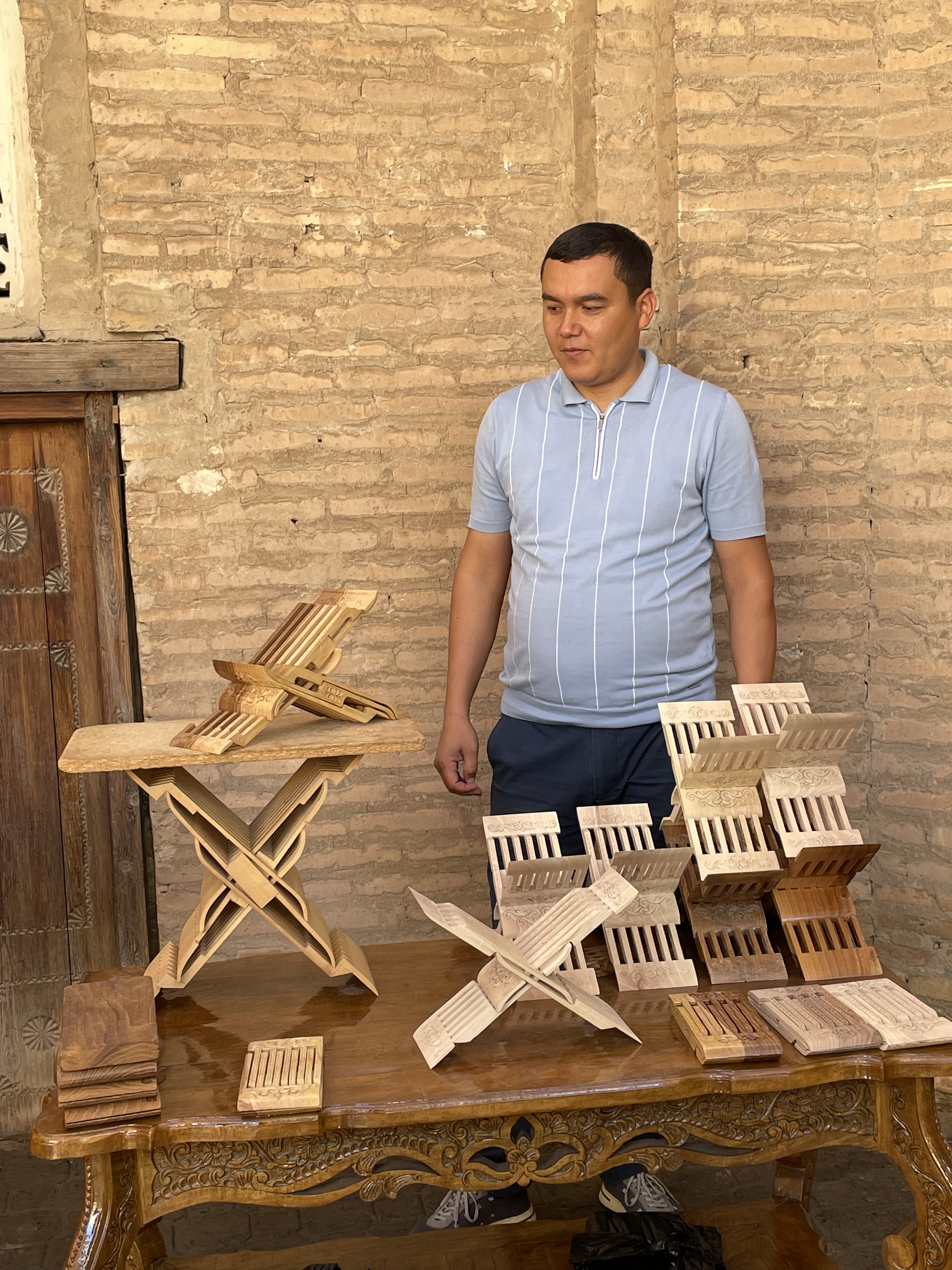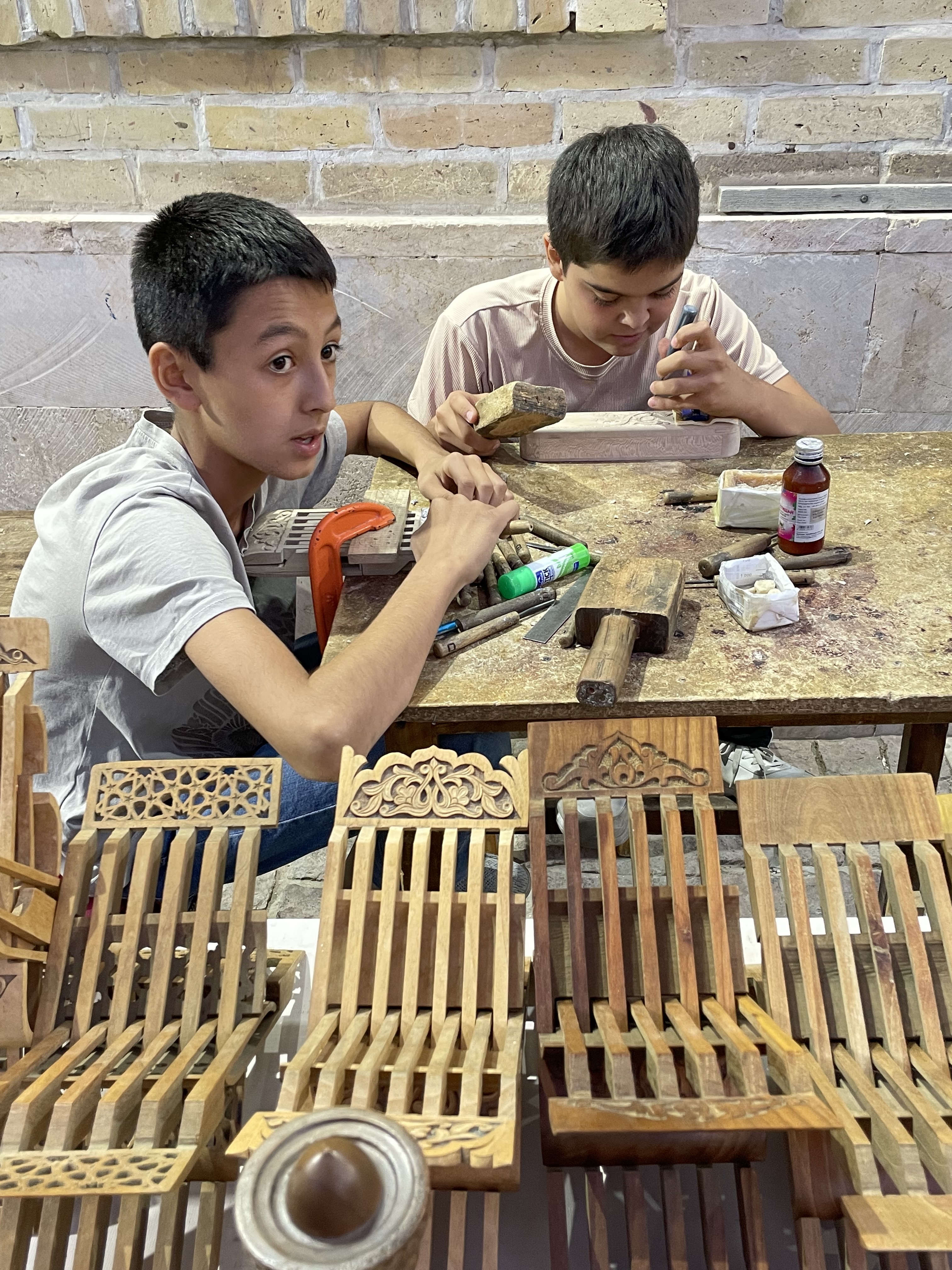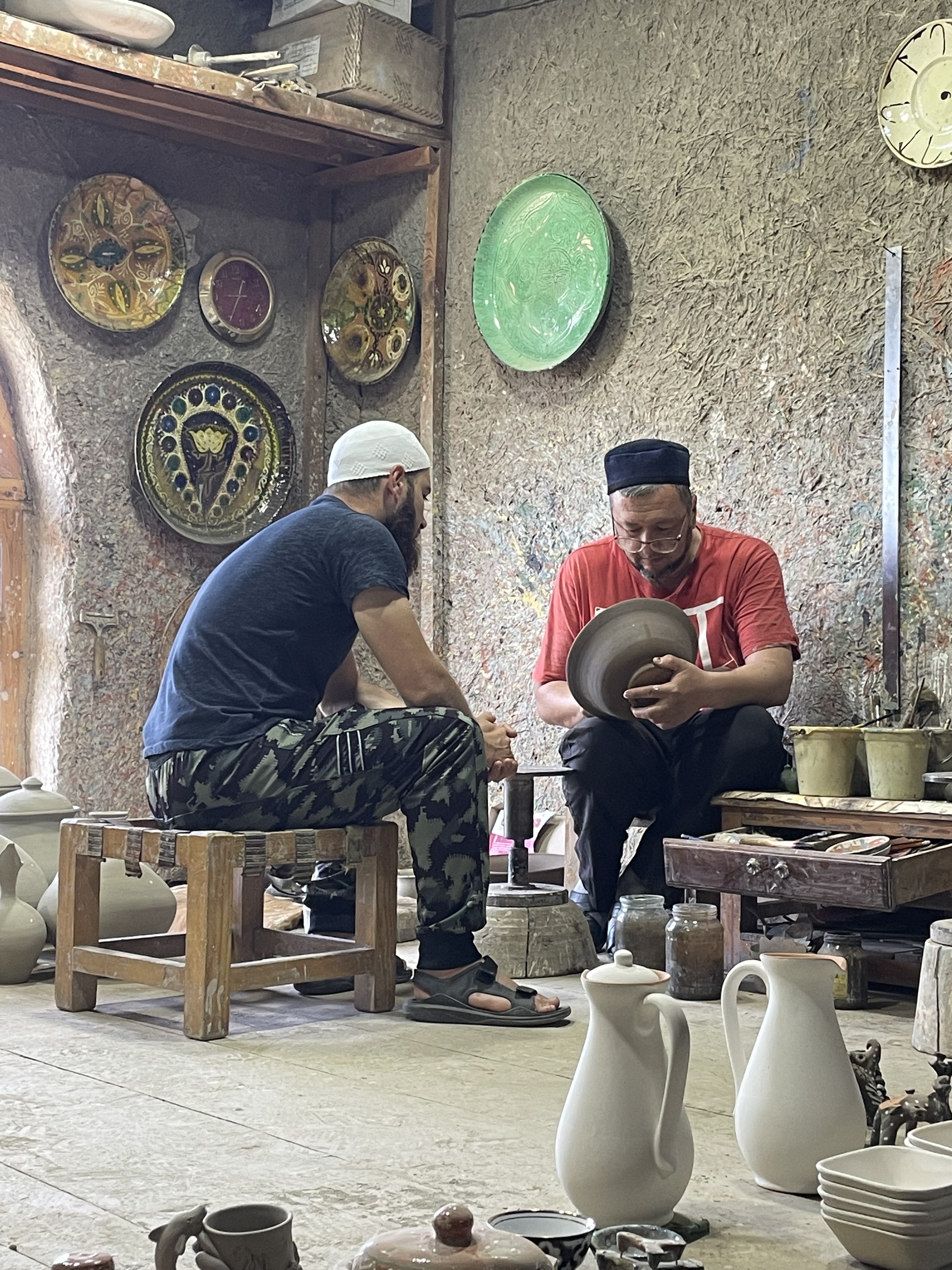 In some ways, the sites felt very touristy, as they were selling souvenirs everywhere, even in mausoleums. But it was also reminiscent of the past, when the Silk Road was active, as these places were trading centers and celebrated for their craftsmanship. The cities are filled with stores and workshops with handiwork of artisans, generations in the making. Many workshops are schools for new devotees to learn the crafts, more than a few starting from a very early age. Items for sale beyond the key chains and fridge magnets were: magnificent knives honed from titanium and Damascus steel; beautiful embroidered items such as wallhangings, pillow covers, tote bags, bedspreads called susani; splendid hand knotted silk and wool rugs; colorful ceramic tiles, platters, bowls, teapots, and cups; beautifully fashioned silk and cotton clothing; exquisite painted miniatures; and much more. I profess I bought more than one of these items and was tempted to make further purchases.