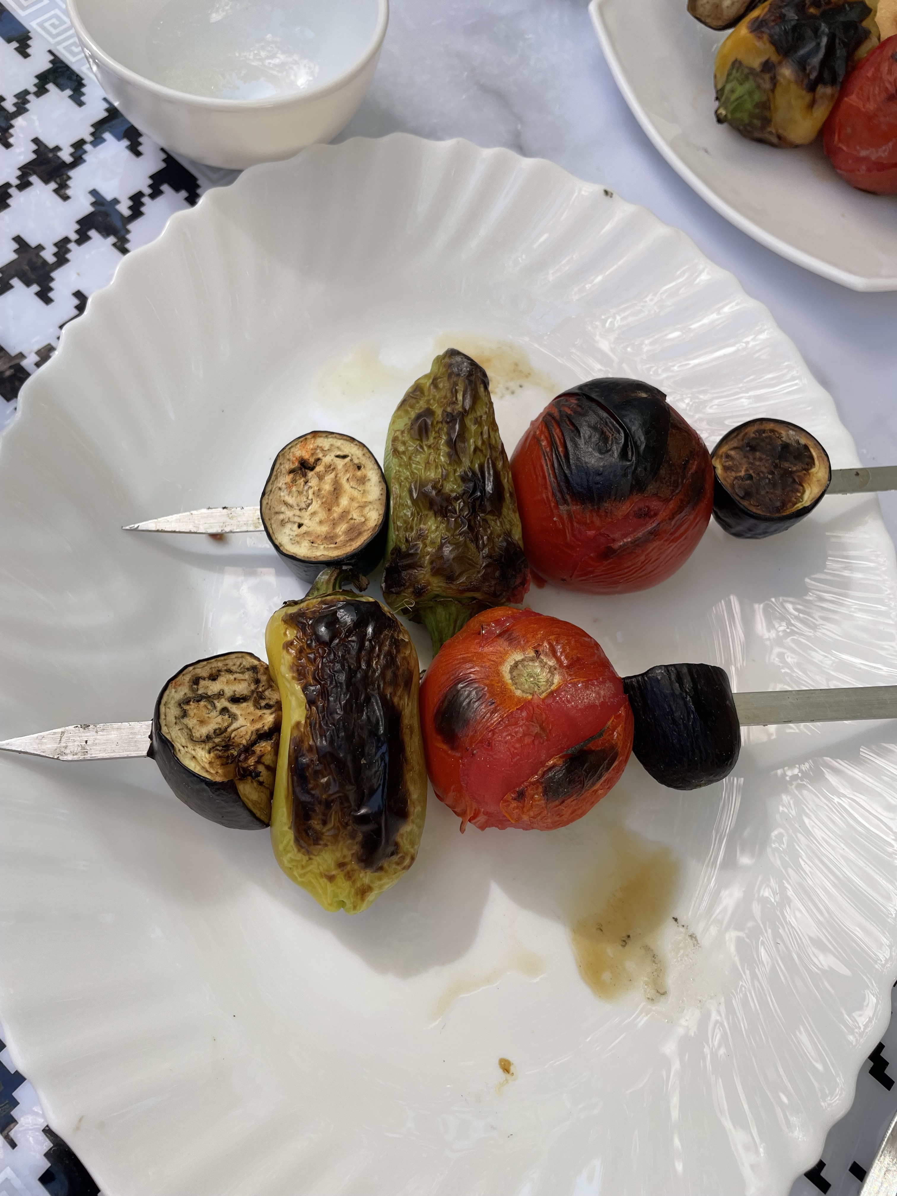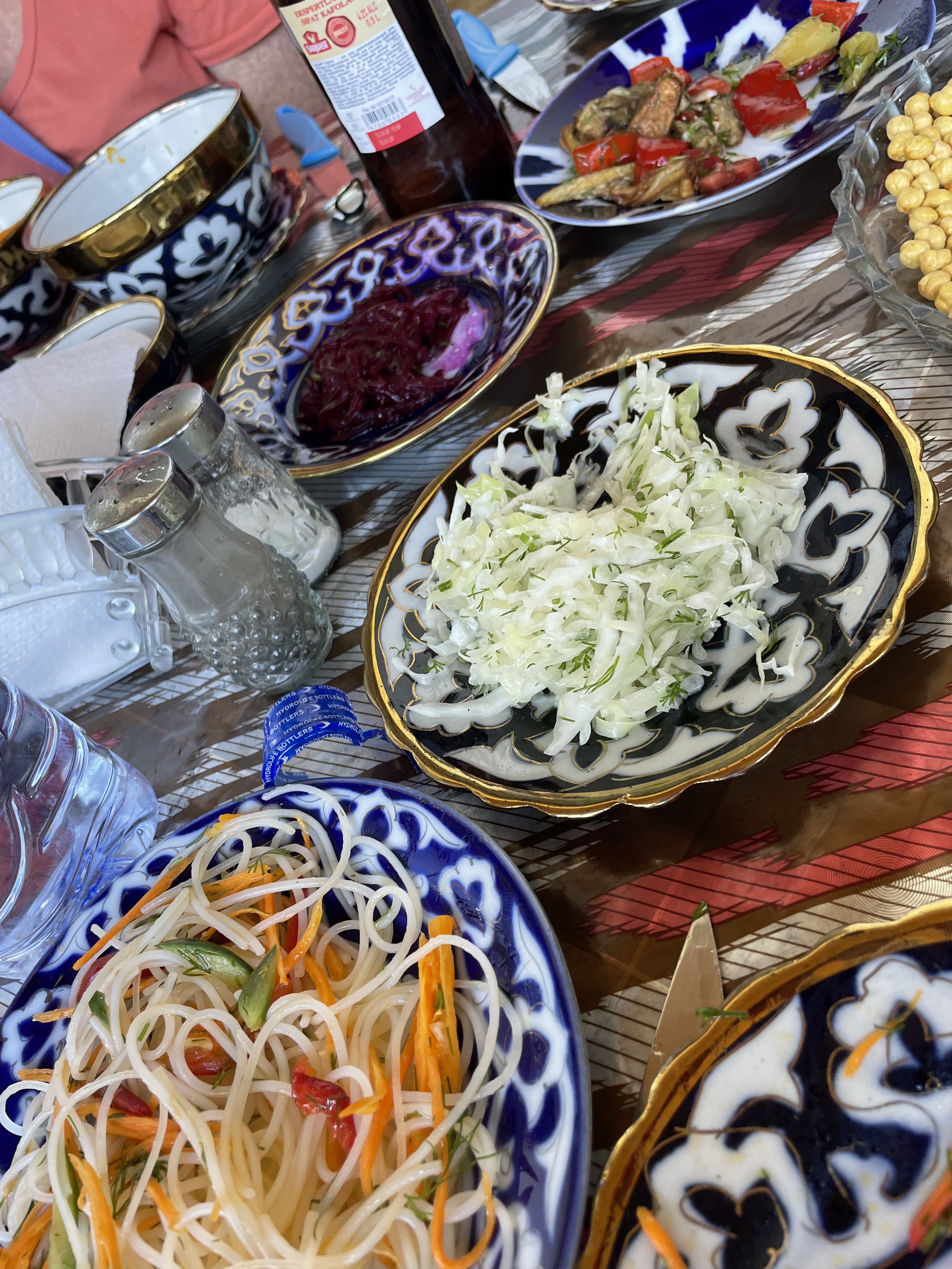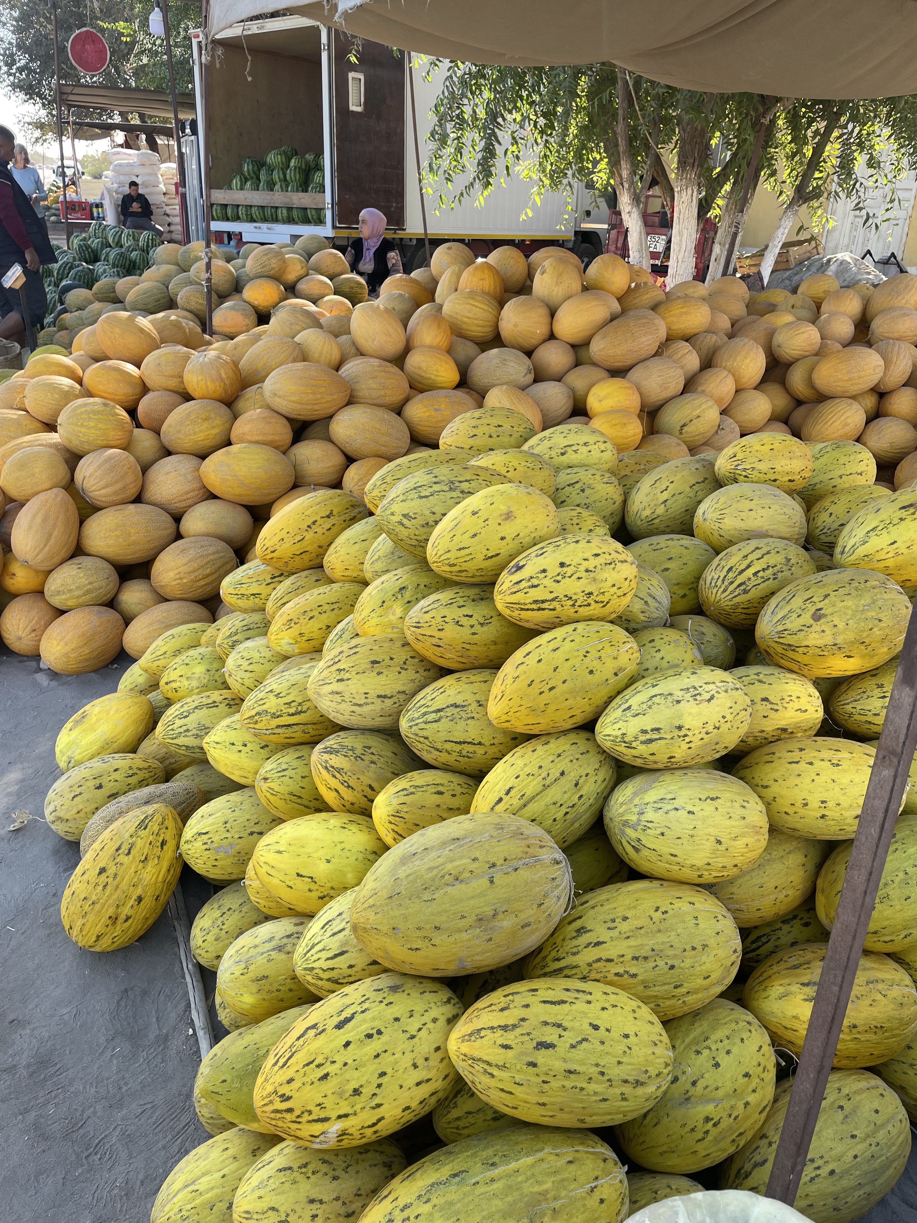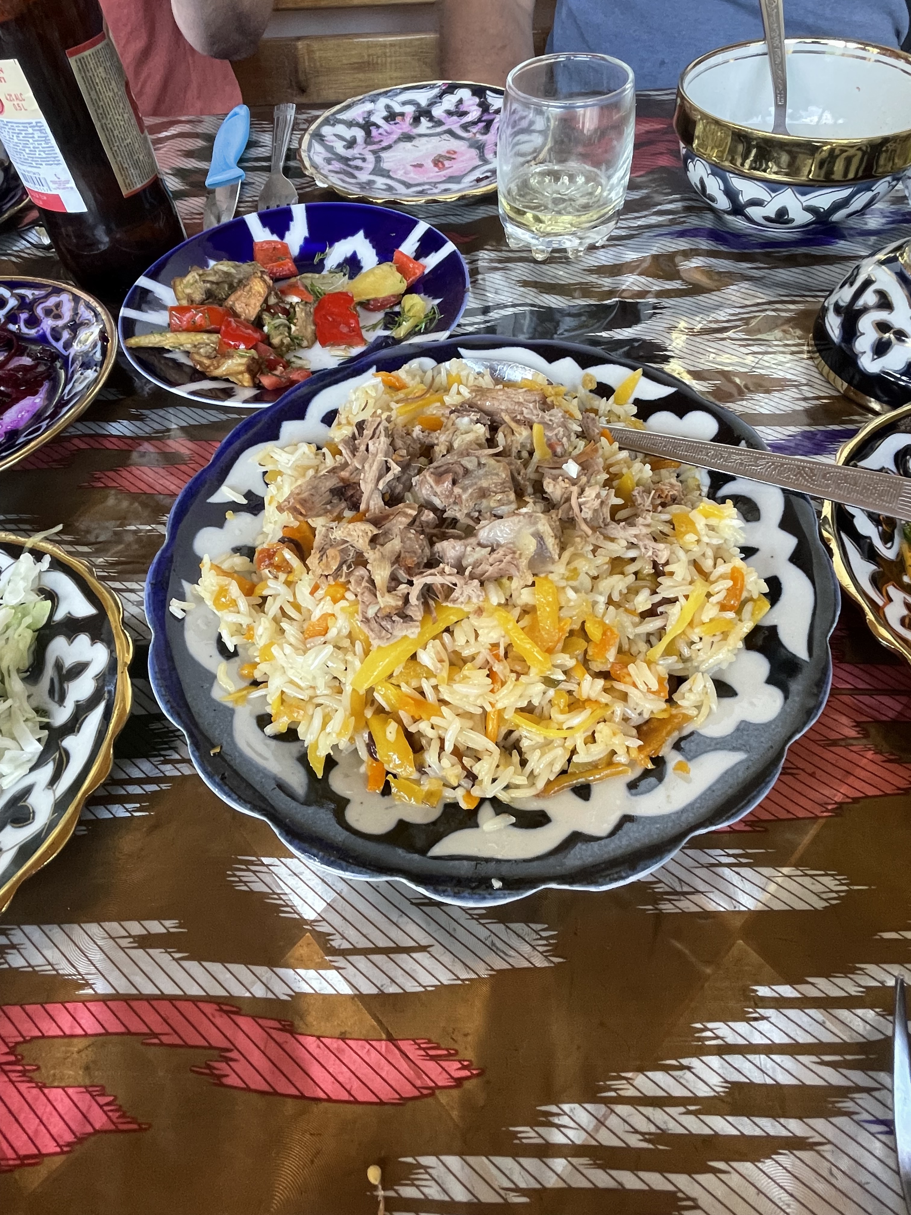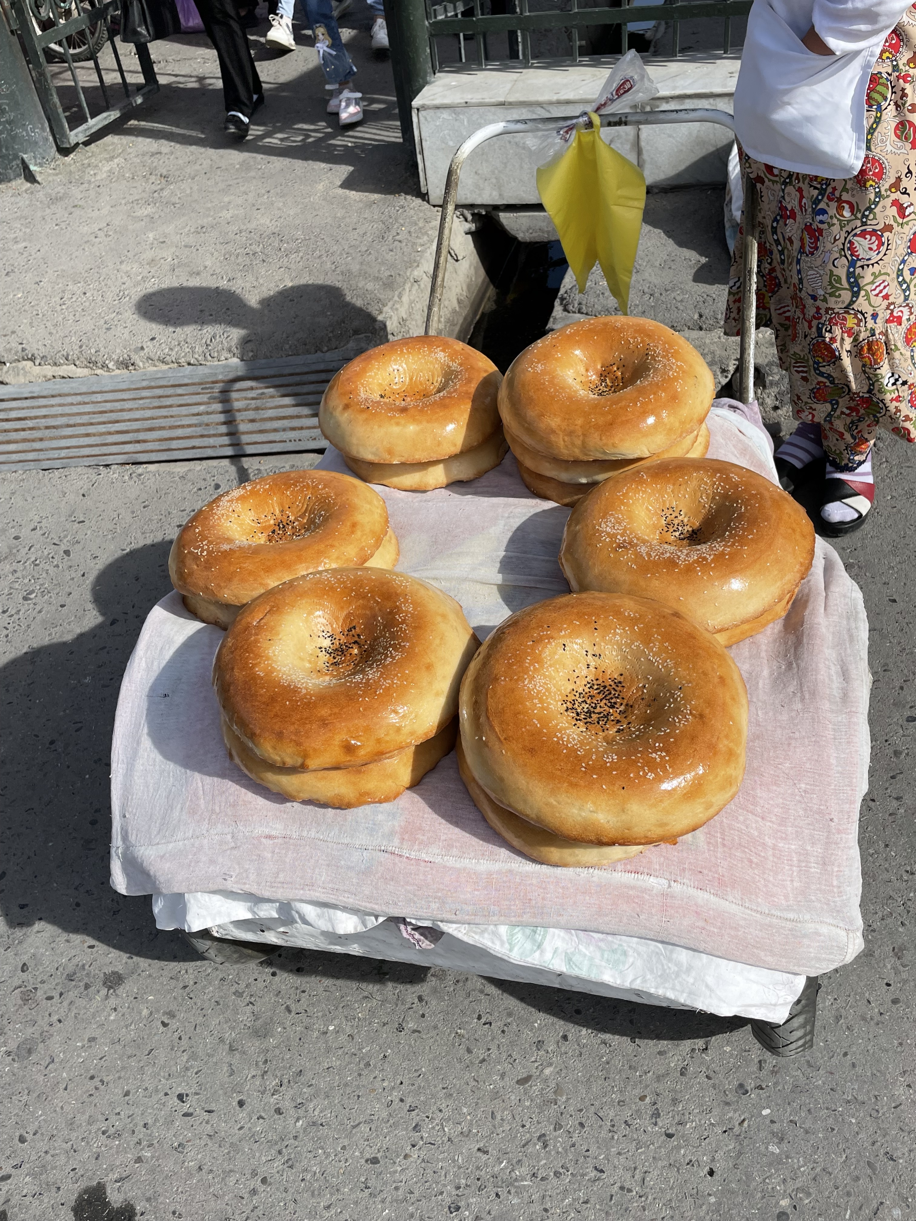 Although this is a very meat focused country, I was able to eat well. My first meal here was a pumpkin filled samsa which was delicious. They’re smaller than the size of my fist, baked in a tandoori oven and brimming with goodness – traditionally with meat but also pumpkin or cabbage. Kebabs were ubiquitous -lamb, beef, chicken, sometimes fish- though not often, mushrooms or vegetables-usually peppers, tomatoes and eggplant. Their national dish is plov. I loved the t-shirts with All You Need Is Plov written under images of the Fab Four with skullcaps on. I wish I had taken a picture. Plov is basically a seasoned rice pilaf but served with chucks of roasted beef or lamb on top. The vegetarian version is just as good. Dumplings are popular, filled with meat or pumpkin. We enjoyed a lot of salads – roasted eggplant and tomato, cucumber and tomato, shredded carrot or cabbage, beetroot, all of them very fresh and yummy. Soup is often served – creamy lentil seemed to be on most menus. Lagman is a regular restaurant offering, basically thick noodles cooked with meat and veggies, vegetarian version available occasionally. When we had dessert, which thankfully wasn’t often – I’m watching my waistline, it was fruit or an apple strudel. White melon, a variety I haven’t seen before is everywhere and very good, sweet but not with a big flavor like cantaloupe. And bread, bread is on every table, flat dense loaves which is served with a very soft white cheese. The breakfast buffets had some nice cookies on them, often shaped like a crescent moon, one of their state symbols.