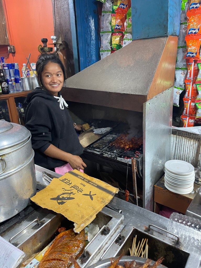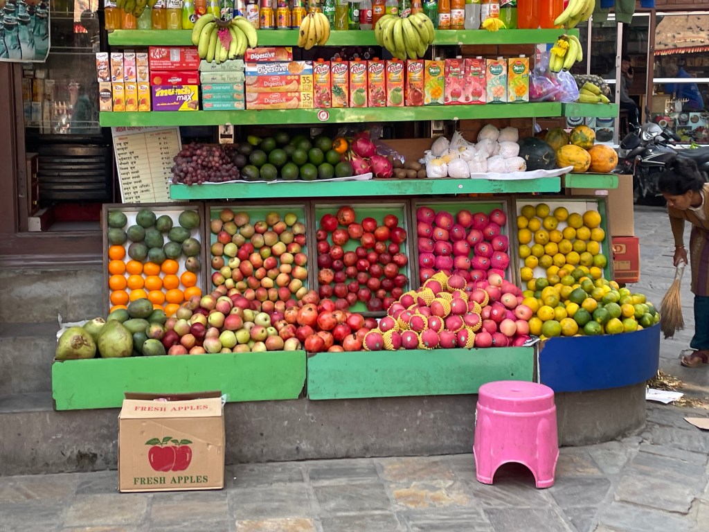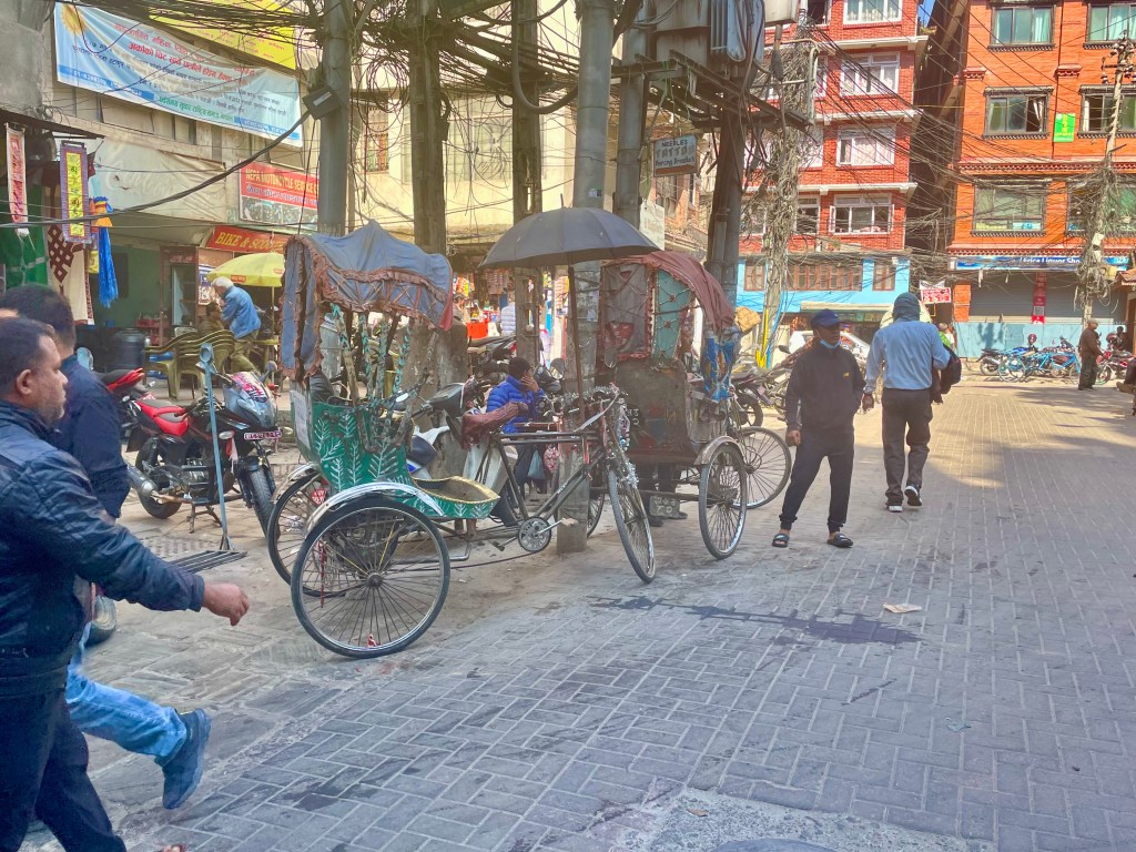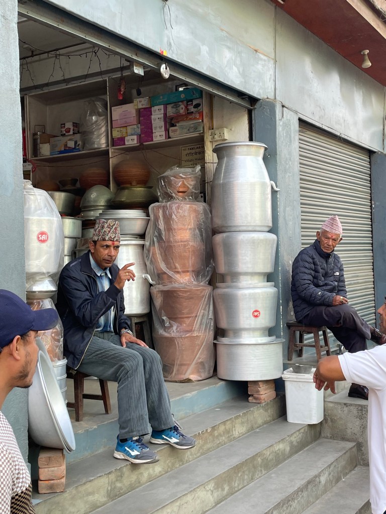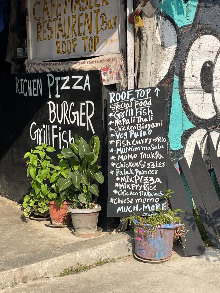 The restaurants here are mostly on the 3rd or 4th floors, occasionally a tiny one is squeezed in at street level and side alleys boast small hole in the wall places. I’ve eaten several times at a little place just across the street and down an alley – the food is good, the staff friendly and they have all the dishes the other joints serve. Most typical is a thali or thakali, similar to the ones in India- a plate with servings of rice, dal, a curry of some sort, curd, and pickles. Momos, or dumplings, are very popular here, filled with veggies, chicken or buff – buffalo. They really don’t eat beef in Nepal but you will find a lot of mutton and buffalo. Thukpa, a wide hand-rolled noodle served in a sauce or soup is very good, I had it both ways. Lo mein, chop suey and spring rolls show the Chinese influence on their cuisine. In Pokhara, which is on a lake, I had fish curry – made especially for me and my guide, and a fresh fish marinated and grilled over coals. You can find samosas, pakora, biryani, pani puri, lassi here as well. And other other type of food you want, as the city is home to people from many countries and they cater to travelers from around the world.