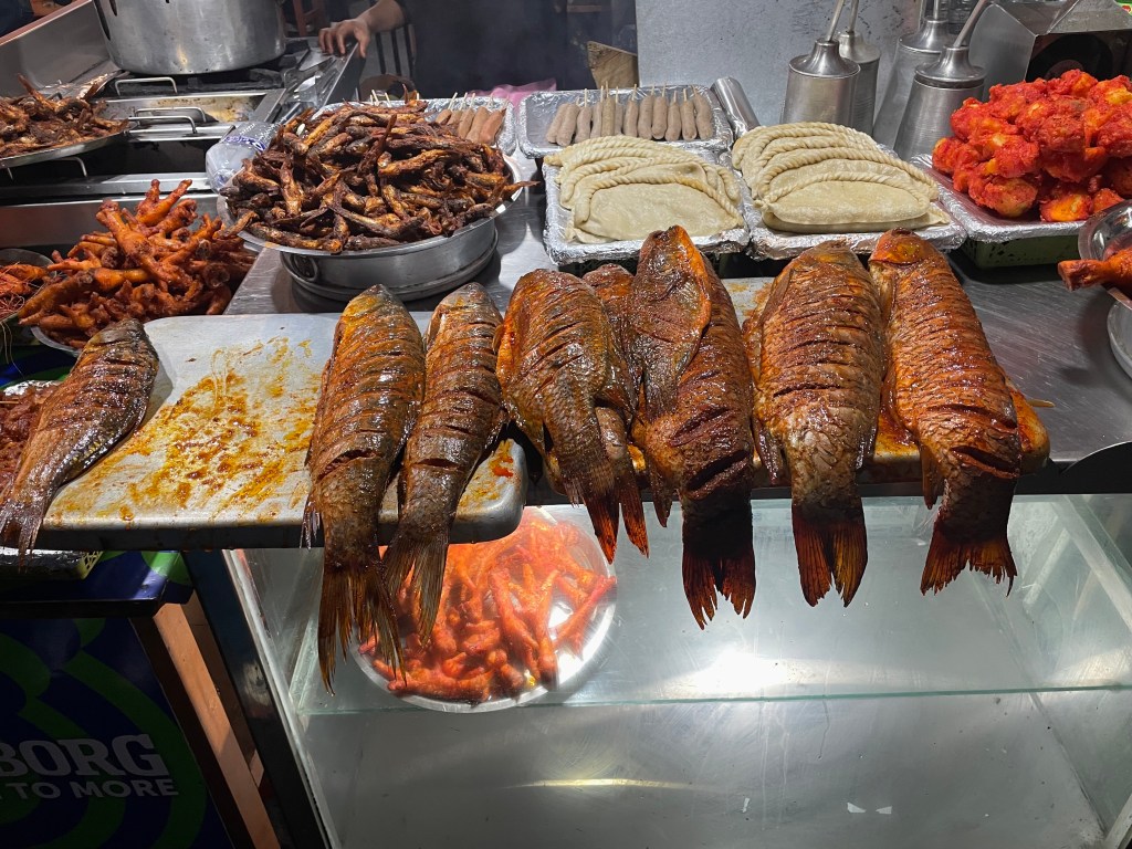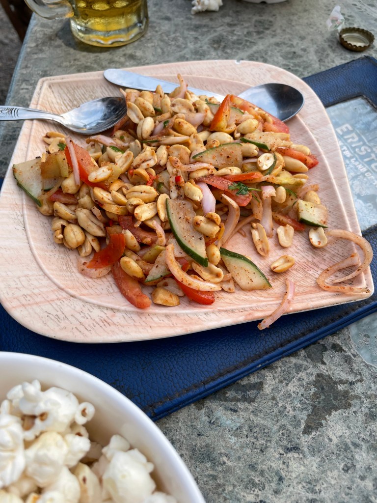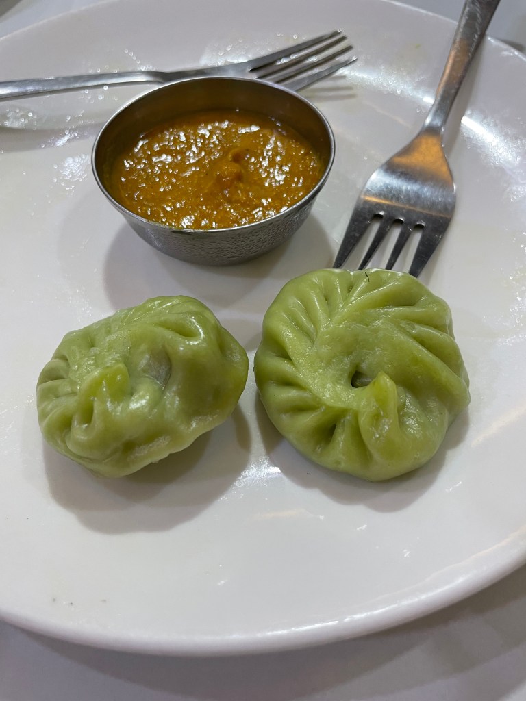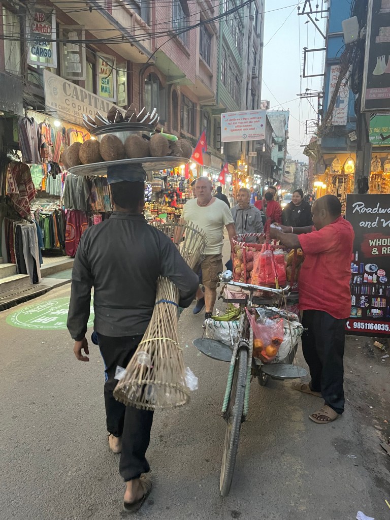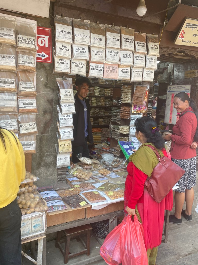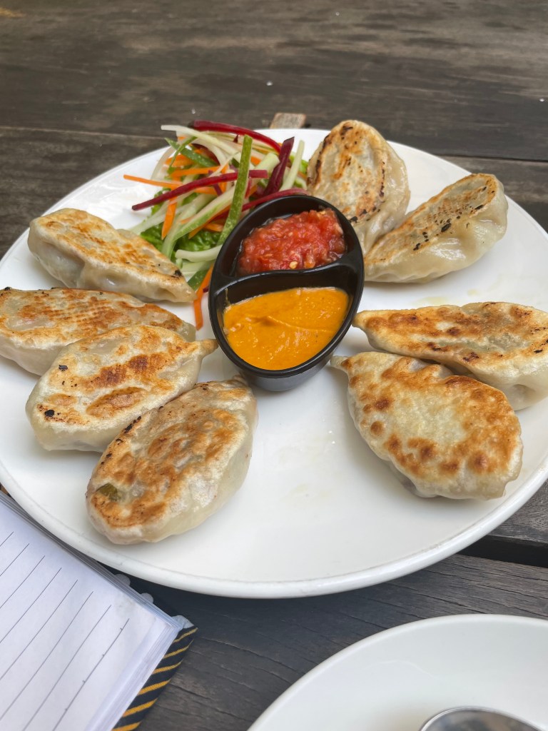 The restaurants here are mostly on the 3rd or 4th floors, occasionally a tiny one is squeezed in at street level and side alleys boast small hole in the wall places. I’ve eaten several times at a little place just across the street and down an alley – the food is good, the staff friendly and they have all the dishes the other joints serve. Most typical is a thali or thakali, similar to the ones in India- a plate with servings of rice, dal, a curry of some sort, curd, and pickles. Momos, or dumplings, are very popular here, filled with veggies, chicken or buff – buffalo. They really don’t eat beef in Nepal but you will find a lot of mutton and buffalo. Thukpa, a wide hand-rolled noodle served in a sauce or soup is very good, I had it both ways. Lo mein, chop suey and spring rolls show the Chinese influence on their cuisine. In Pokhara, which is on a lake, I had fish curry – made especially for me and my guide, and a fresh fish marinated and grilled over coals. You can find samosas, pakora, biryani, pani puri, lassi here as well. And other other type of food you want, as the city is home to people from many countries and they cater to travelers from around the world.