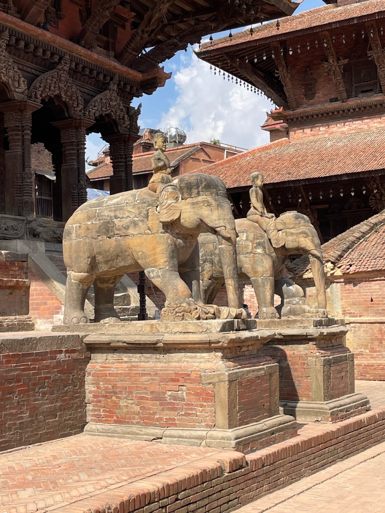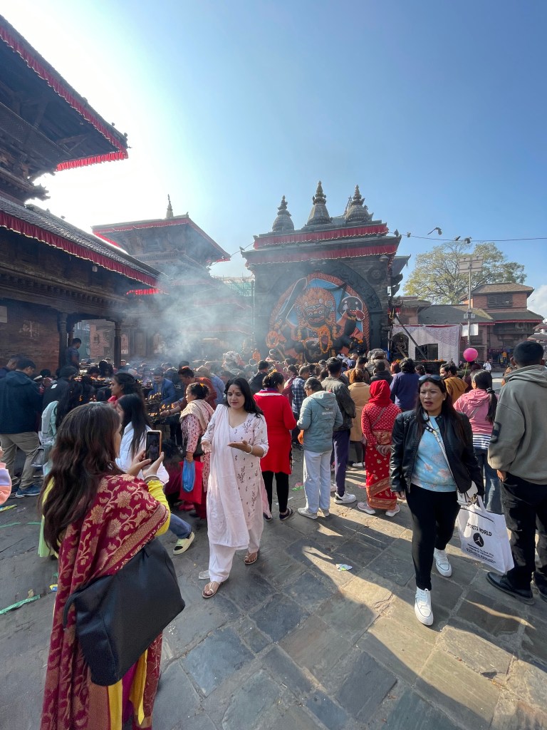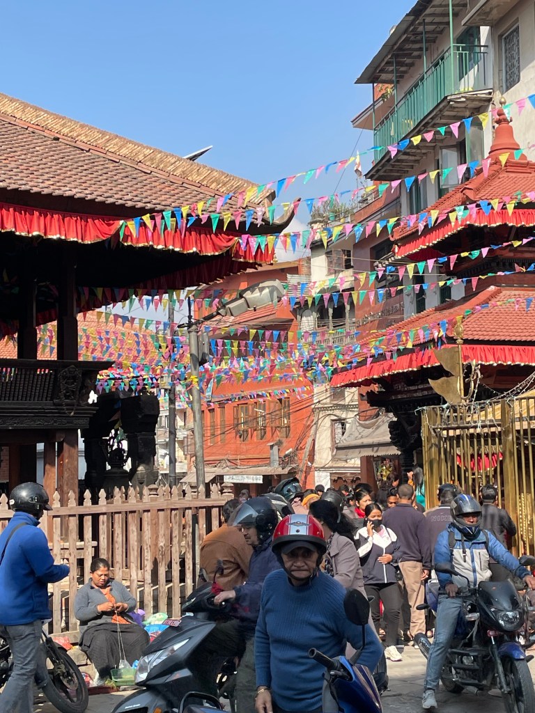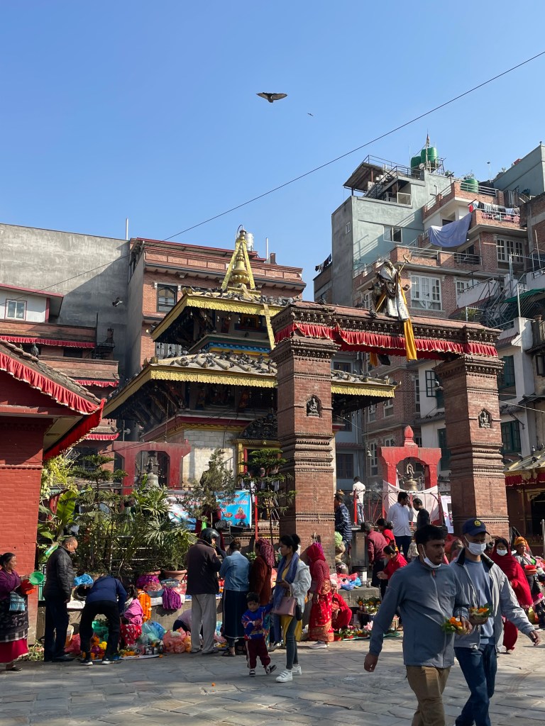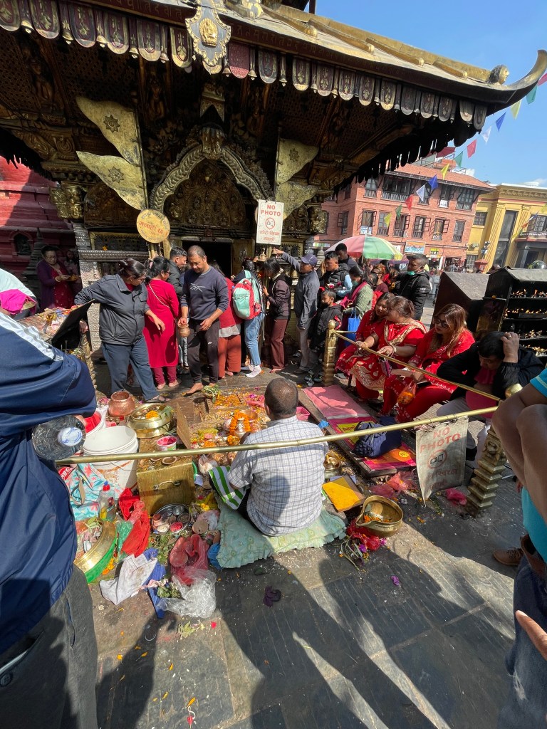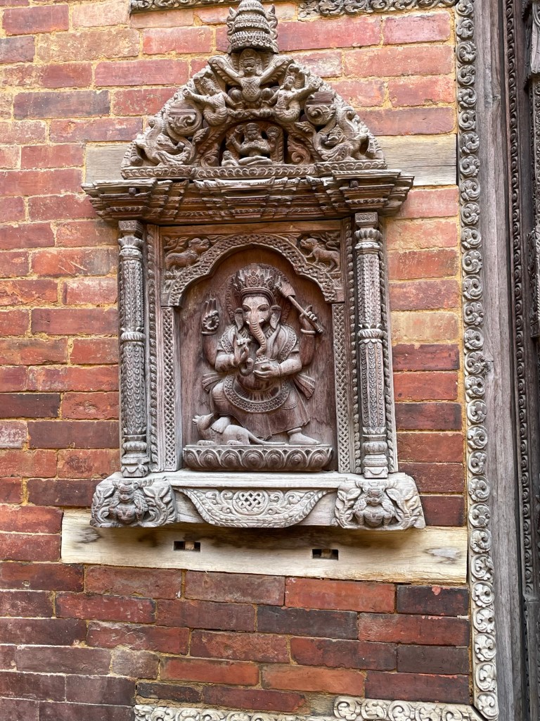 Kathmandu is the city of temples, the city of gods. You only need to walk a block or two to find one and in actuality you’ve most likely passed several more hidden in an alley or up on a rooftop. Many ancient ones are clustered together in squares, a temple for this god or goddess and that one as well, in their multiple incarnations. Buddhist and Hindu temples sit next to each other and some pagodas have images of both Buddha and a Hindu god. It’s a feast for the eyes – intricate carvings and diverse statues embellish all the buildings. I loved the Buddha eyes on the stupas, which I hadn’t seen before. I did a tour of 5 of the 7 UNESCO Heritage sites, each one made up of multiple temples, pagodas and stupas. Many of the temples were damaged during the 2015 earthquake, but with the help of China, America and others about 80% of them have been rebuilt using original material and methods. No improvements can be made and still have the UNESCO designation. Pagoda’s are a Nepali design, spreading to Tibet, China, Japan and beyond from here. Buddha was also born in Nepal. The majority, 82% of the population is Hindu, with another 8% Buddhist. The temples are well attended if the red dots and smears or Sindoor on people’s third eye -a blessing received after prayer, is any indication. The crimson marks are seen continuously throughout the city. The larger sites were crowded when I visited on a Saturday but any day of the week I saw people praying, leaving offerings, or adorning shrines with marigolds, often leaving with a petal on their head or in their wallet for good fortune. And yes, I got a blessing and some petals are in my purse.