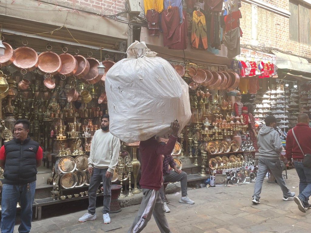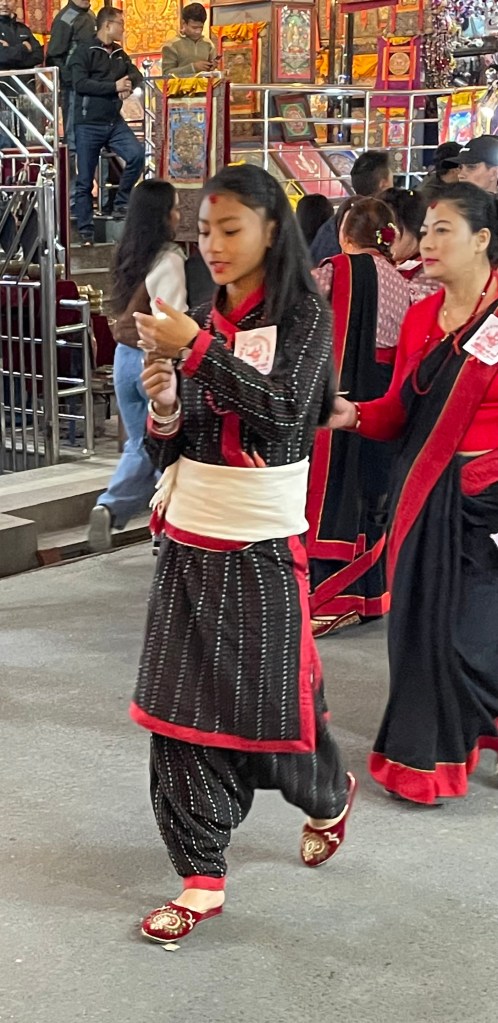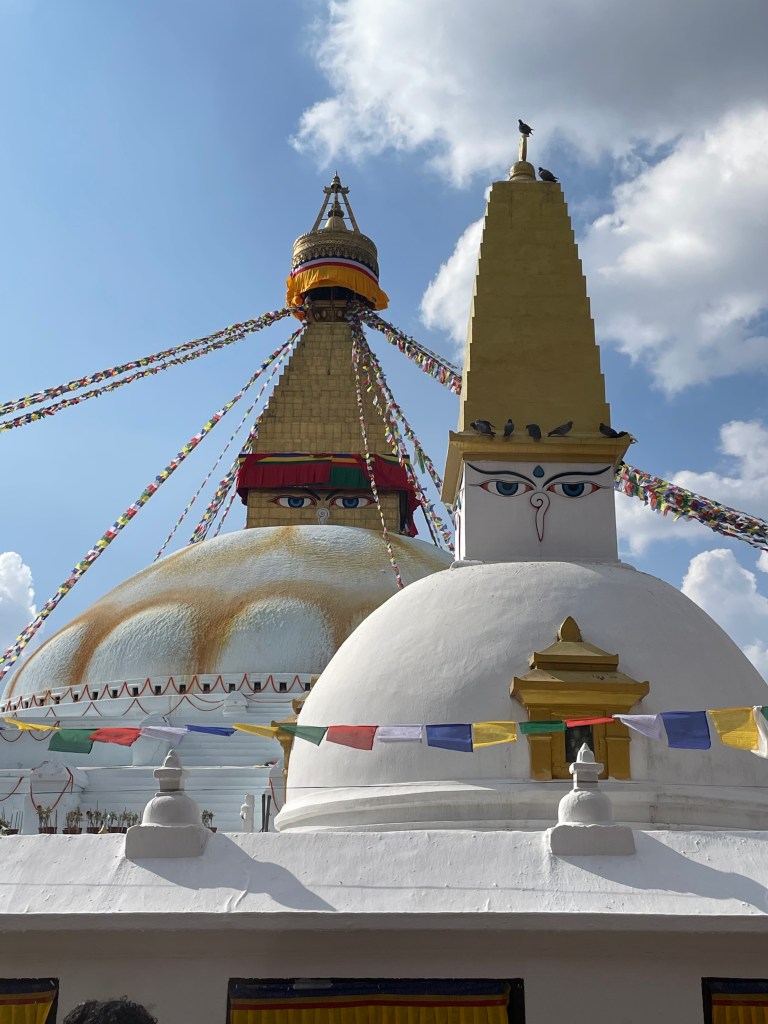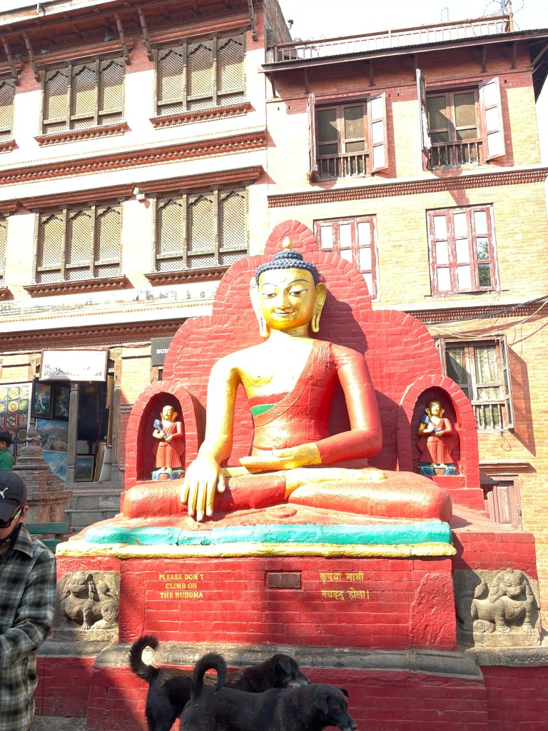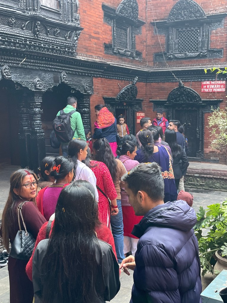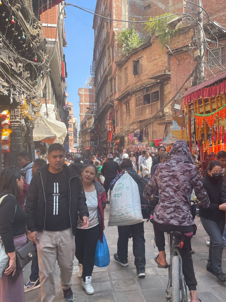 Kathmandu is the city of temples, the city of gods. You only need to walk a block or two to find one and in actuality you’ve most likely passed several more hidden in an alley or up on a rooftop. Many ancient ones are clustered together in squares, a temple for this god or goddess and that one as well, in their multiple incarnations. Buddhist and Hindu temples sit next to each other and some pagodas have images of both Buddha and a Hindu god. It’s a feast for the eyes – intricate carvings and diverse statues embellish all the buildings. I loved the Buddha eyes on the stupas, which I hadn’t seen before. I did a tour of 5 of the 7 UNESCO Heritage sites, each one made up of multiple temples, pagodas and stupas. Many of the temples were damaged during the 2015 earthquake, but with the help of China, America and others about 80% of them have been rebuilt using original material and methods. No improvements can be made and still have the UNESCO designation. Pagoda’s are a Nepali design, spreading to Tibet, China, Japan and beyond from here. Buddha was also born in Nepal. The majority, 82% of the population is Hindu, with another 8% Buddhist. The temples are well attended if the red dots and smears or Sindoor on people’s third eye -a blessing received after prayer, is any indication. The crimson marks are seen continuously throughout the city. The larger sites were crowded when I visited on a Saturday but any day of the week I saw people praying, leaving offerings, or adorning shrines with marigolds, often leaving with a petal on their head or in their wallet for good fortune. And yes, I got a blessing and some petals are in my purse.