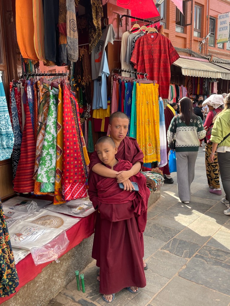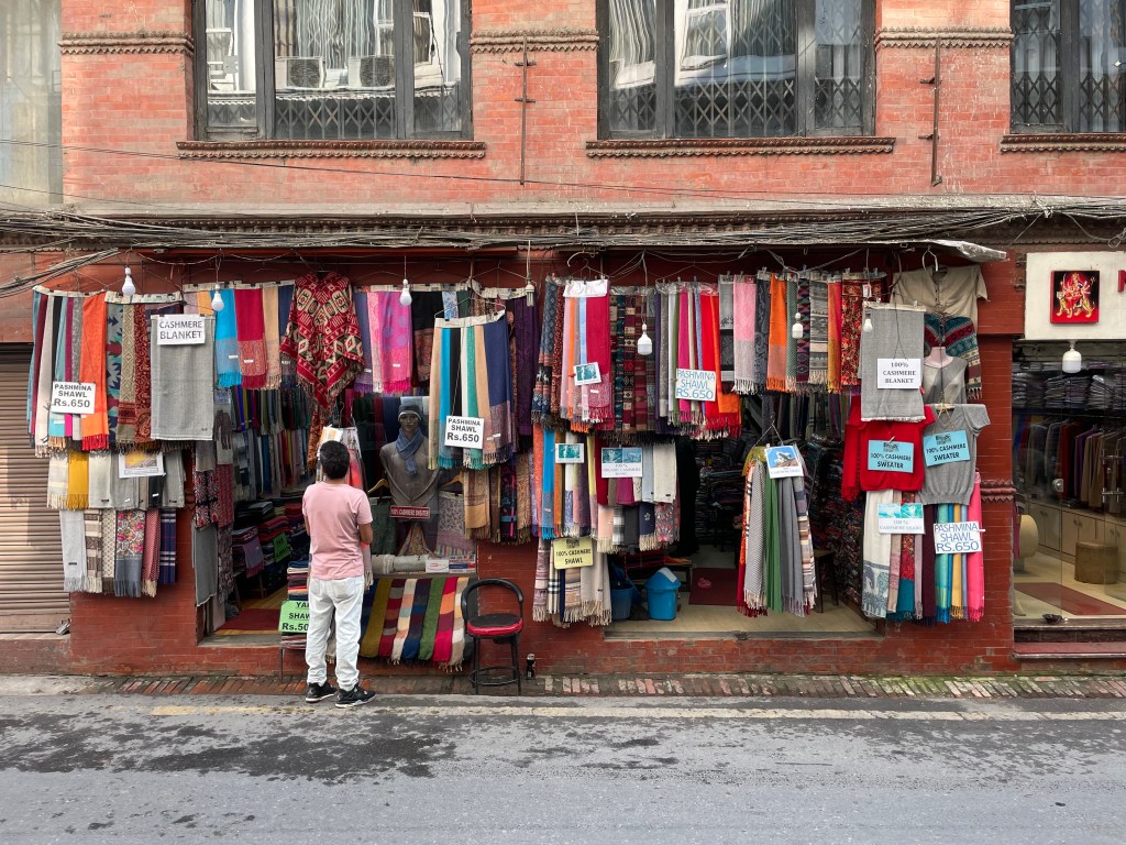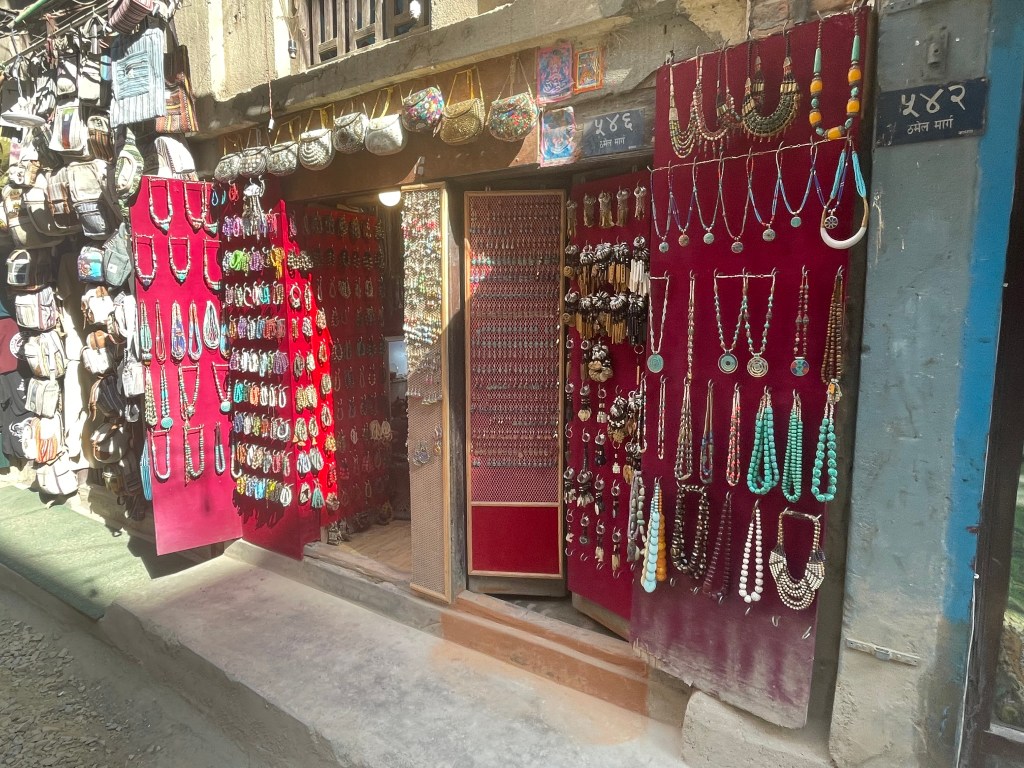The shops, like in many of the developing countries, are mostly small, family owned, on the first floor of a multi-story building, usually smaller than a one car garage. A few are larger and fancier, selling fair trade products and fine designs. The myriad of stores selling outdoor gear is a clear indication that trekking is the bread and butter of this town – you can get a down jacket for less than $25. It’s probably a North Face knock-off from China, but who can tell the difference. More stores selling pashminas and cashmere sweaters than I can count, shops with silver jewelry, brass items, mandala or Thanka paintings, bright cotton clothing, and t-shirts lined the lanes of the tourist areas. I would love to shop, if I only had room in my suitcase, well maybe I can squeeze in a cashmere sweater and a t-shirt or three for my grandsons.
