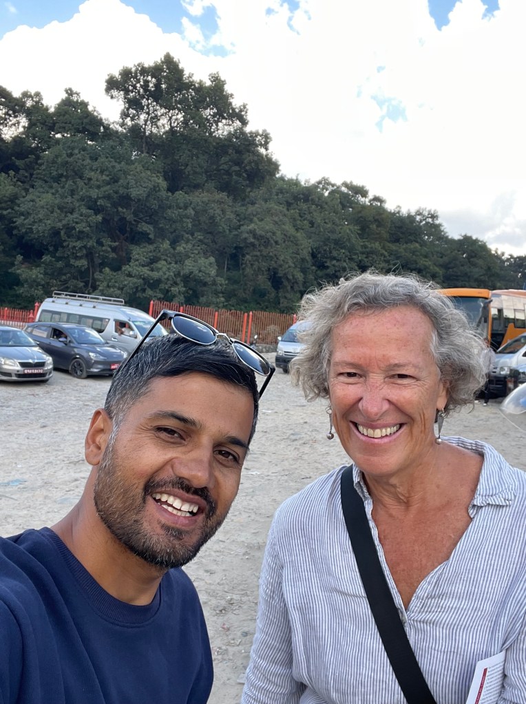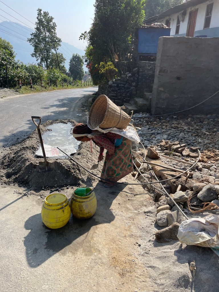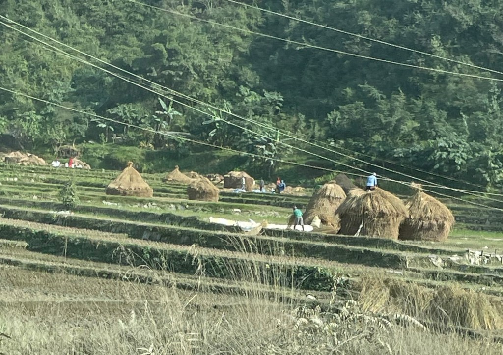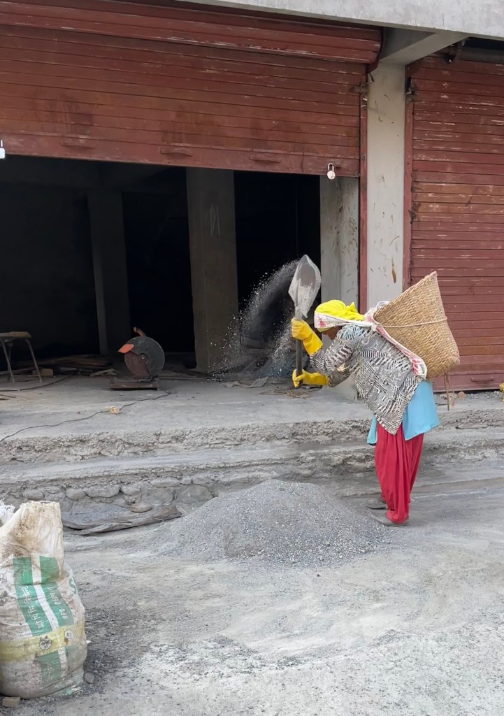 I enjoyed observing the countryside however. Seeing the snow capped mountains in the distance was spectacular. I also took a plane to view Mount Everest which was breathtaking. The rural areas have amazing terraced fields on steep hills, green with the fall crops, some filled with bright yellow and orange marigolds. Rivers large and small rushed by. Nepal is 97% hydro-electric and if developed further could provide a good source of income, they already export power to India and hope to sell to China and Bangladesh in the future. The houses sprinkled on the hillsides and in the towns and village were attractive with bright colors, tiled facades, and terraces on multiple levels. A grain was being harvested, all by hand, so watching them work was intriguing. In one field, a woman stood with a big basket on her back, a cloth stretched across the crown of her head supporting it, while her husband shoveled great clods of dirt into it. I came across other women carrying rocks and gravel in the same fashion. The woman with the gravel was loading the stones herself, throwing them over the top her head.