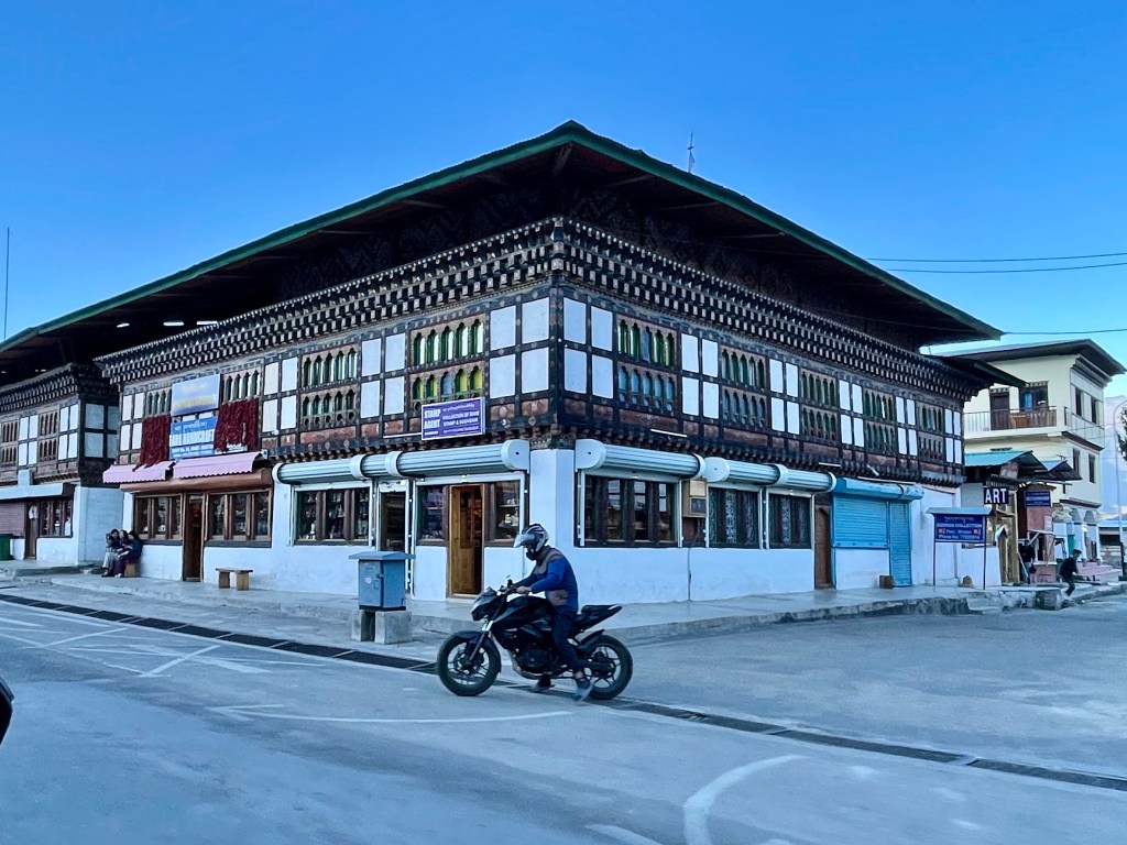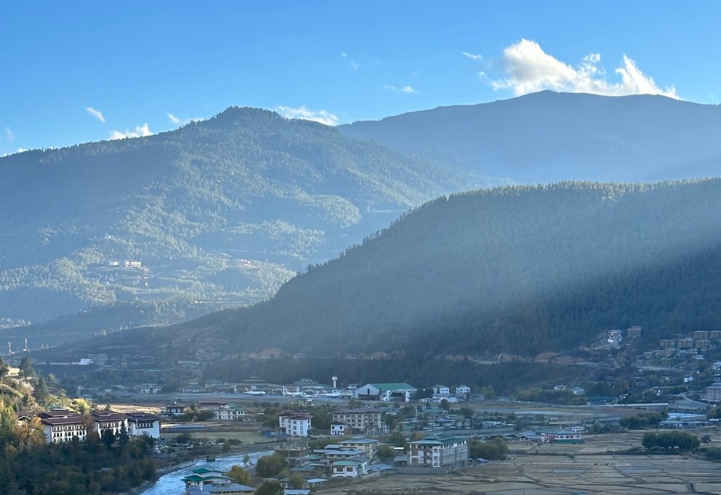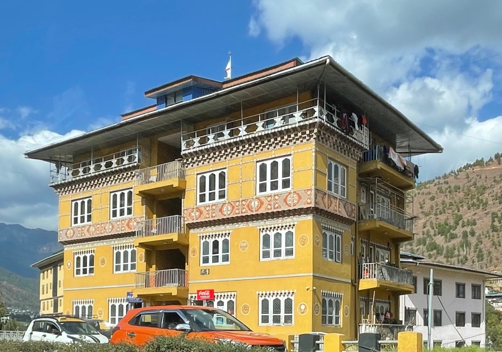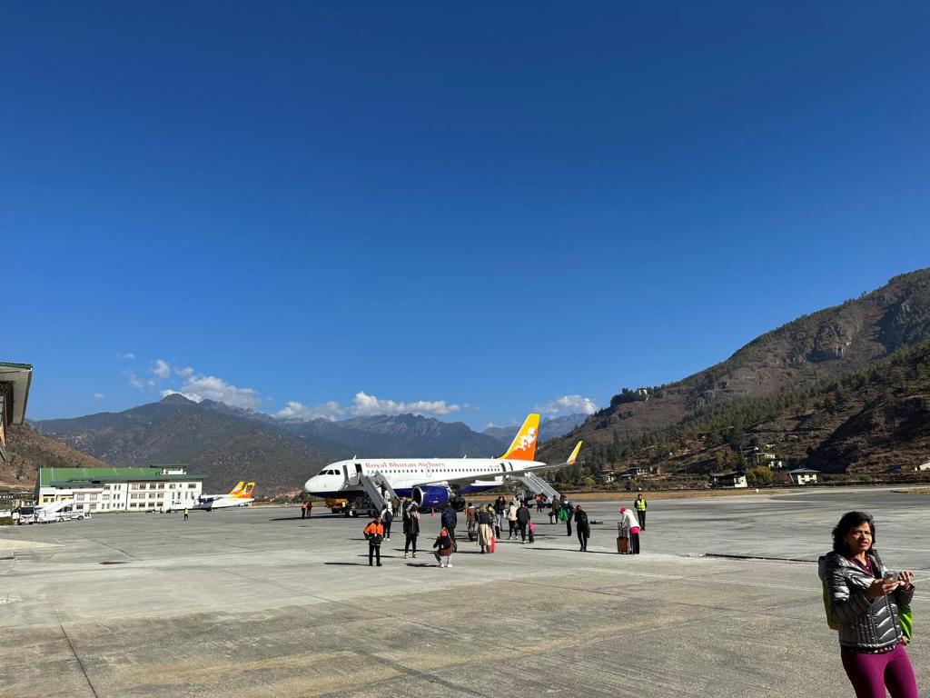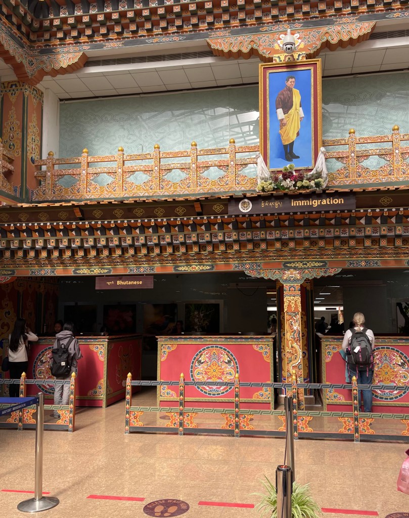 When Brad and I first landed in Paro, we loved everything we saw. We were grateful for landing safely at an airport where only a very few pilots can land or takeoff. There is no radar at the airfield, high mountains surround the runway, the altitude of over 7,000 feet restricts the performance of the aircraft, the pilot can only see the runway for a few brief minutes before landing, and they use different instrumentation then other airports – all making it one of the most dangerous airports in the world. We stepped off the airplane to beautiful blue skies and majestic mountains where ever we looked. The terminal was very pretty, built in the Bhutanese manner which we would see repeated throughout the country, multiple levels of notched and carved wood along the eaves and around the doors and windows, painted in array of brightly colored symbols. As we approached immigration, one open desk quickly grew into 3 then 5 and we expeditiously and politely got our passports stamped. The building was very clean and everything we needed was right there – rest rooms and ATM’s.