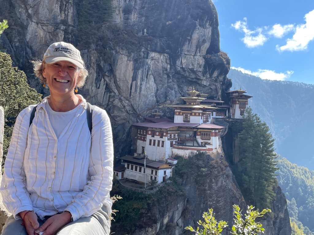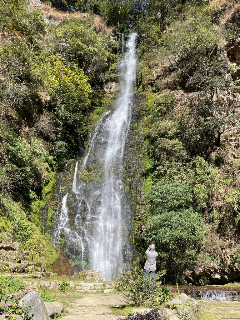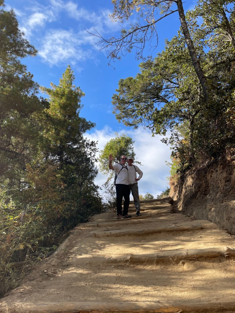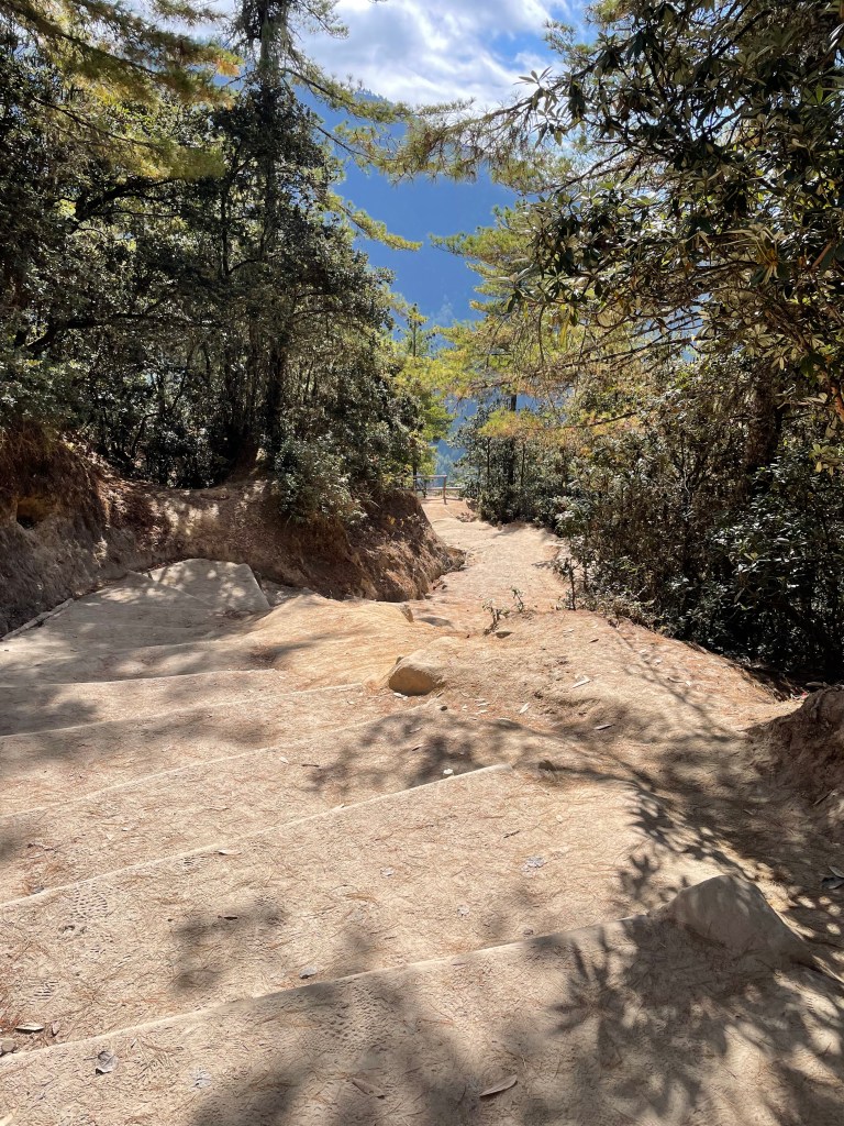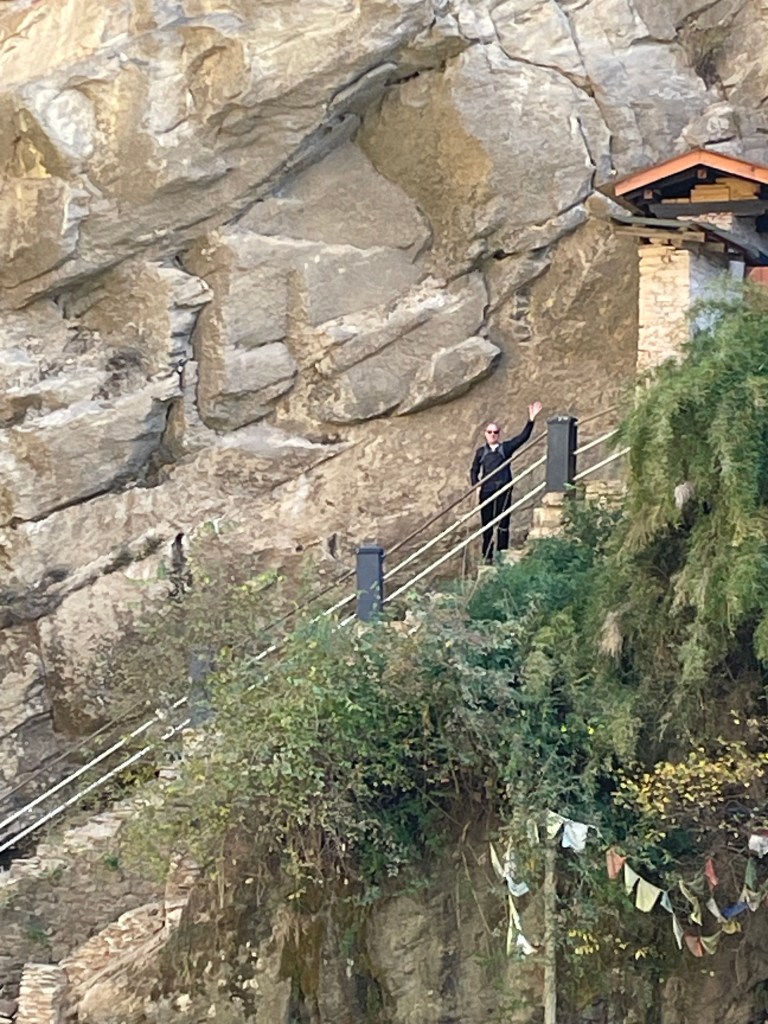 We did several hikes while we were here. The first one just after visiting a black necked crane winter nesting site. We ended up close to 10,000 feet but there wasn’t a lot of elevation gain. Still we panted due to the altitude. We hiked to one of the newest stupas – built for the current king by his mother to offset that fact that he was born in the year of the monkey. Apparently, that’s not a good year for kings to appear on earth. That excursion was a little steeper and really good training for our big hike. Other than needing to stop occasionally to catch my breathe, I didn’t have any issues until we climbed the three flights of stairs to the top of the building, then I got light-headed. Thankfully, I recovered quickly. Our final hike was to Tiger’s Nest, a set of temples built into the side of a mountain just over 10,000 feet up but with about 4,000 feet elevation gain. Brad and I agreed we would take it slow and enjoy the views as we trekked up the path. Chungdu was very patient as he strolled up with his hands behind his back or while texting on his phone, when he wasn’t taking amazing pictures of the views or of us. The full trip was only about 6 miles but the altitude provided a little harder workout than six miles at home. Just before we got to the temples, we went down 770 steps and then back up 100 or so more. I tried not to think about having to go backup those 770 steps, but it wasn’t too bad as a lot of people were coming down and we had to wait for them to pass. I was grateful for the delays. We walked under old man’s beard, a light green lichen that only grows when the air is pure. It was another one of the beautiful, warm days with bright blue skies that we enjoyed the whole time we were in Bhutan, making it a very pleasurable endeavor.