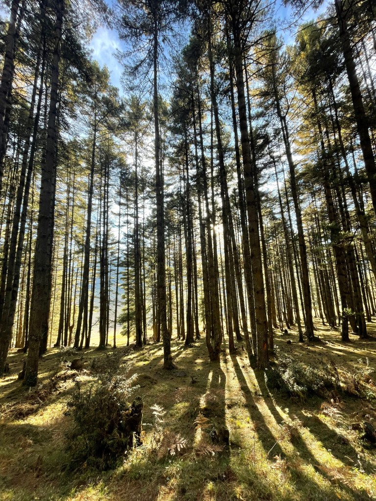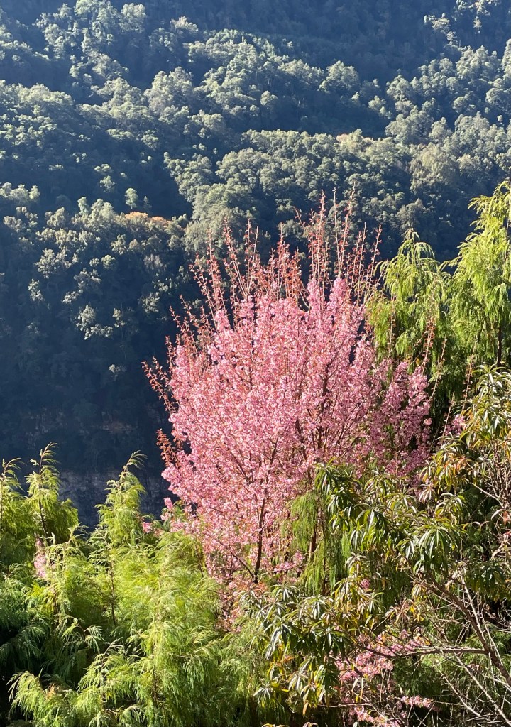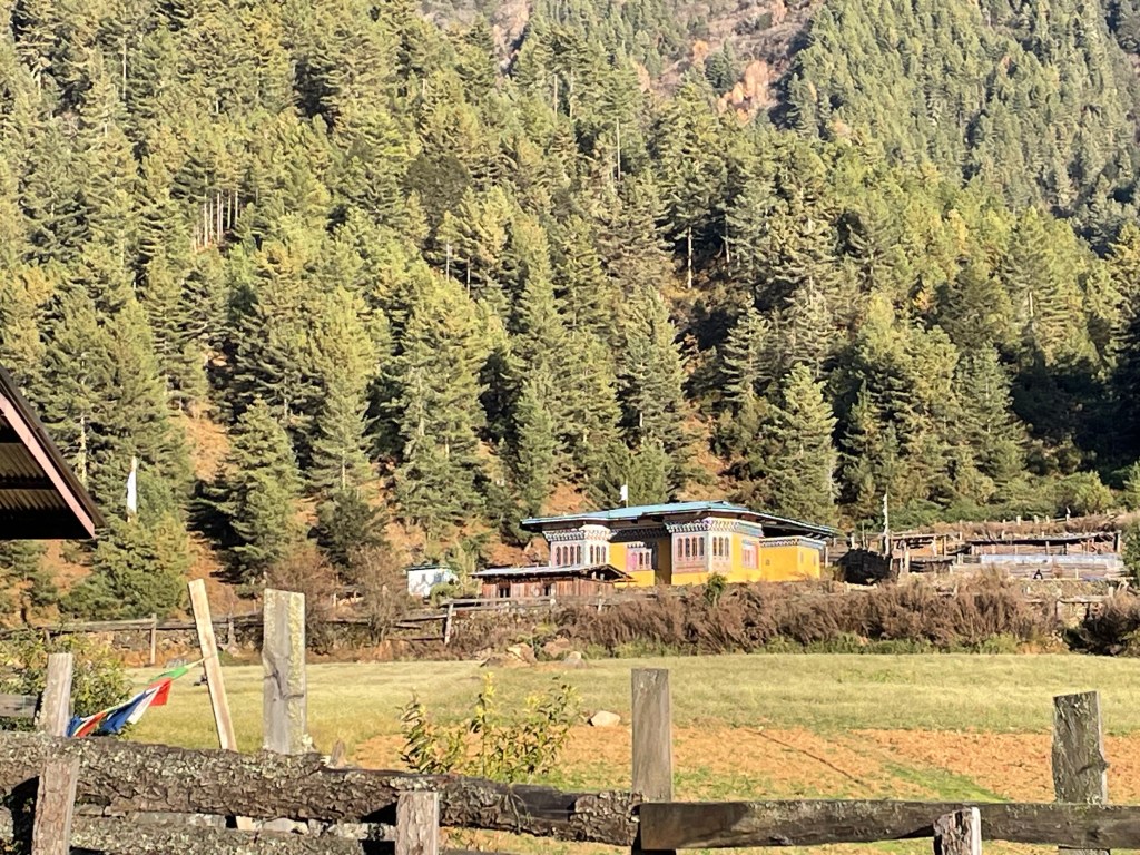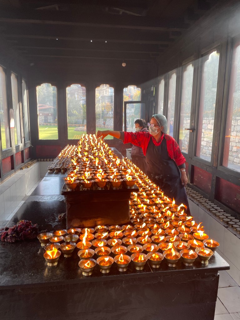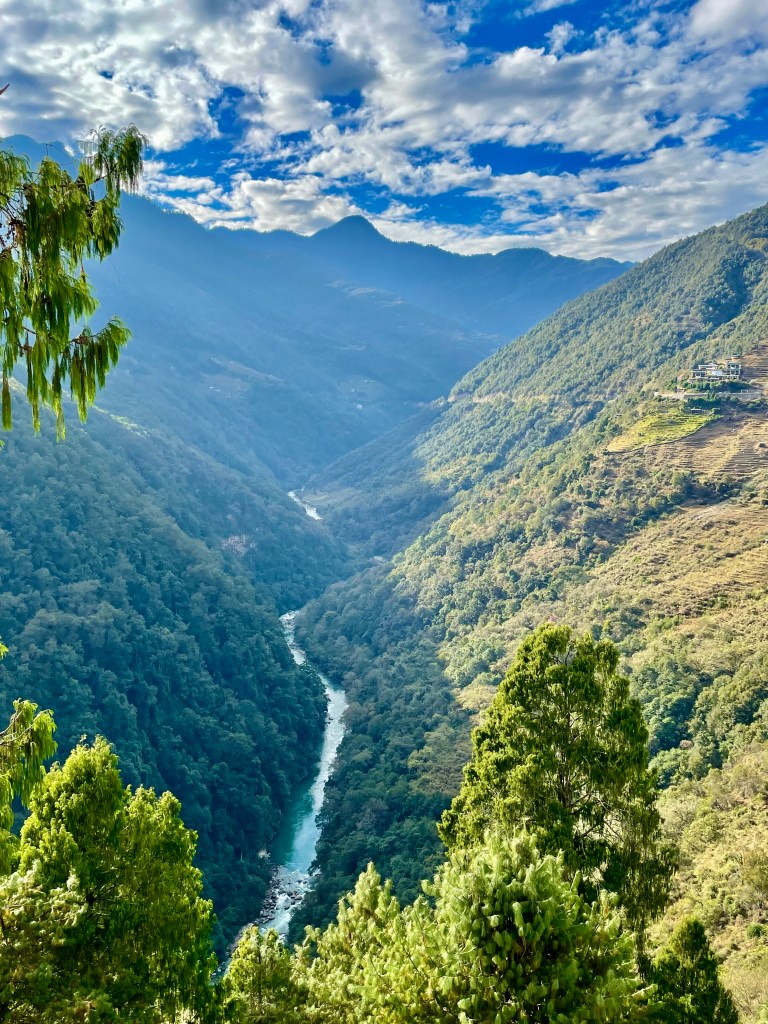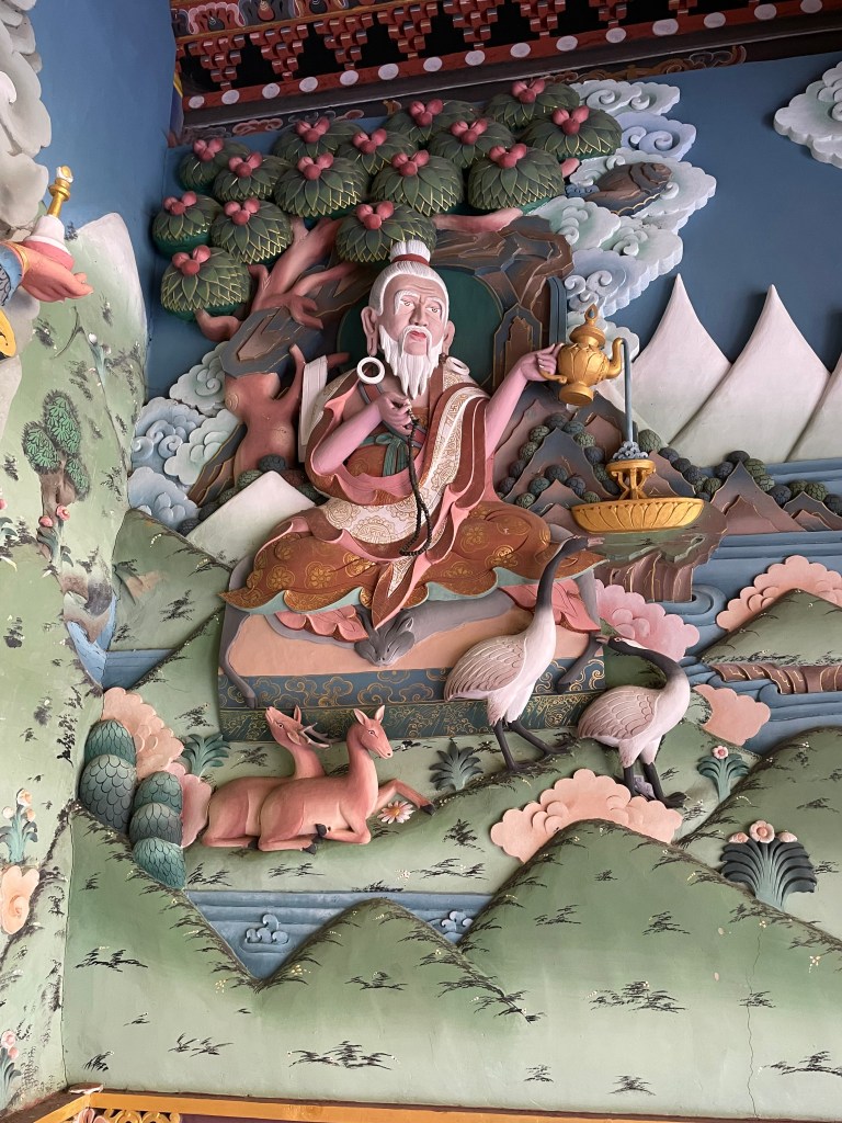 We did several hikes while we were here. The first one just after visiting a black necked crane winter nesting site. We ended up close to 10,000 feet but there wasn’t a lot of elevation gain. Still we panted due to the altitude. We hiked to one of the newest stupas – built for the current king by his mother to offset that fact that he was born in the year of the monkey. Apparently, that’s not a good year for kings to appear on earth. That excursion was a little steeper and really good training for our big hike. Other than needing to stop occasionally to catch my breathe, I didn’t have any issues until we climbed the three flights of stairs to the top of the building, then I got light-headed. Thankfully, I recovered quickly. Our final hike was to Tiger’s Nest, a set of temples built into the side of a mountain just over 10,000 feet up but with about 4,000 feet elevation gain. Brad and I agreed we would take it slow and enjoy the views as we trekked up the path. Chungdu was very patient as he strolled up with his hands behind his back or while texting on his phone, when he wasn’t taking amazing pictures of the views or of us. The full trip was only about 6 miles but the altitude provided a little harder workout than six miles at home. Just before we got to the temples, we went down 770 steps and then back up 100 or so more. I tried not to think about having to go backup those 770 steps, but it wasn’t too bad as a lot of people were coming down and we had to wait for them to pass. I was grateful for the delays. We walked under old man’s beard, a light green lichen that only grows when the air is pure. It was another one of the beautiful, warm days with bright blue skies that we enjoyed the whole time we were in Bhutan, making it a very pleasurable endeavor.