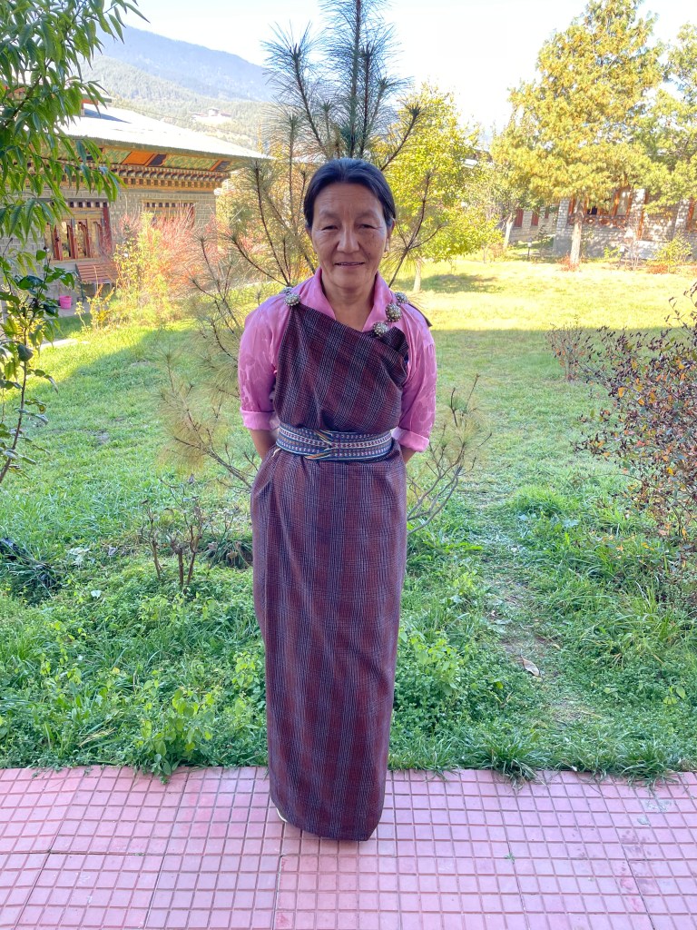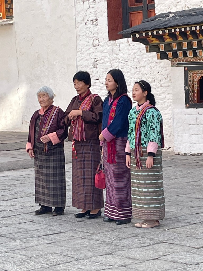 I loved the traditional clothing the people wear. Western clothing is seen but the Gho for men and Kira and Toego for women are the accepted and sometimes required business attire. They are also worn in schools and when visiting temples and. government offices. Even small children don the colorful apparel. The Kira is a long woven cloth wrapped around the body and traditionally secured with silver clasps over the shoulders, then an embroidered or woven belt is cinched at the waist. A toego is a short jacket, usually of silk, worn on top. More modern Kiras only go to the waist and are held in place by a hook and eye or maybe buttons. The Gho is a robe, again made of woven material, it crosses over the front, pleated in the back and held tightly with a woven belt. The front top of the garment is loose and used as a pocket for your cell phones, papers and other items. The gho hangs just to the bottom of the knees and knee socks or half socks, as they are called here, complete the ensemble. When entering the fortresses or any government building they also wear a shawl over one shoulder, which dips below the waist on the other side. Both forms of dress come in a variety of colors and patterns, some for ceremonial days quite elaborate. Our guide said the Gho is very comfortable, except the belt needs to be very tight in order to be used effectively as a pocket, so it feels good when you remove it.