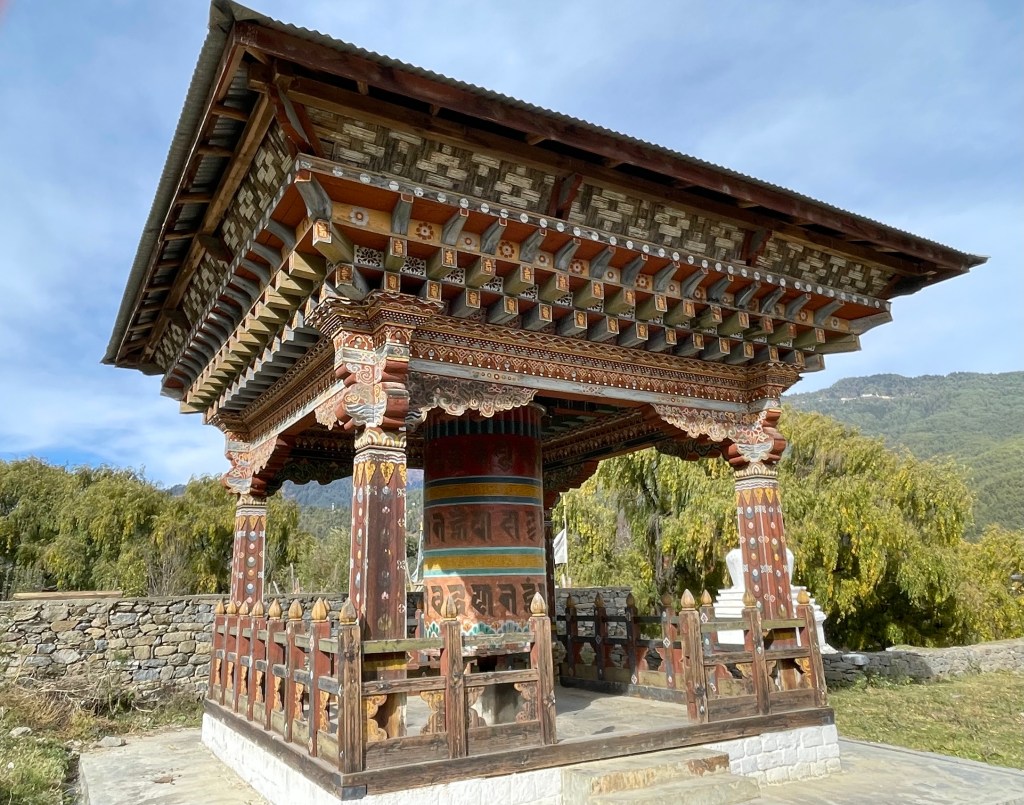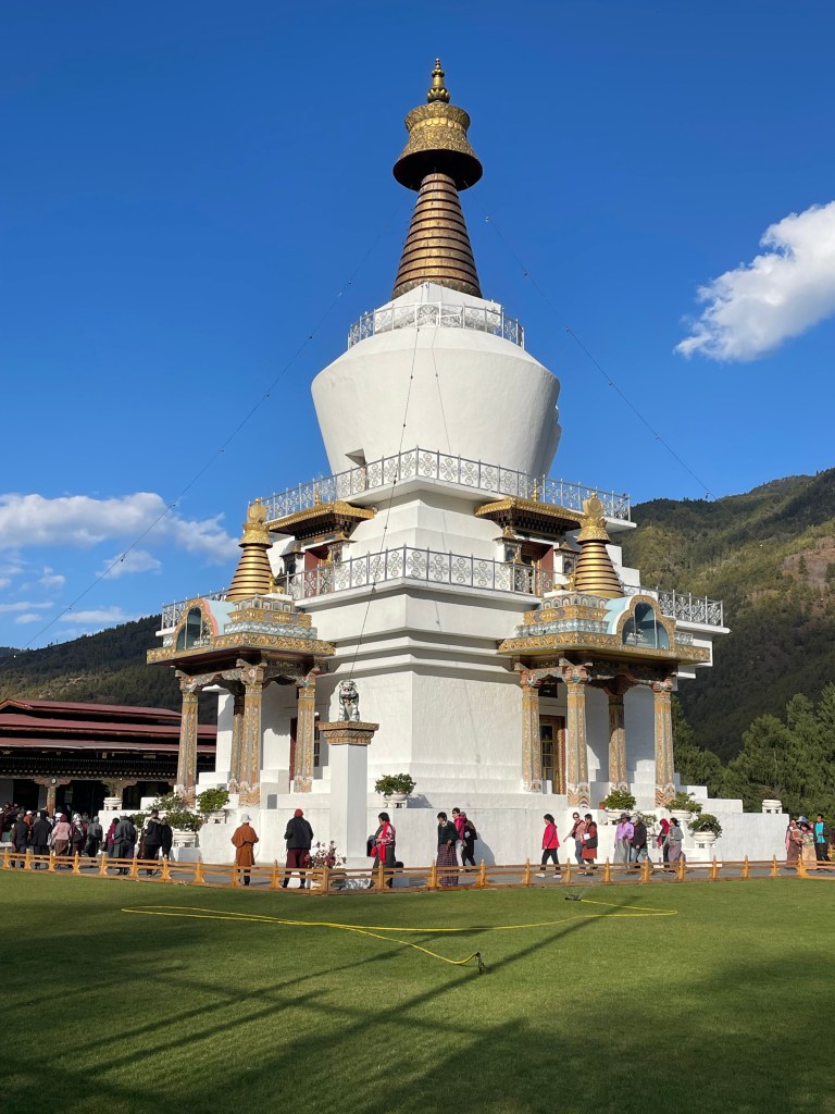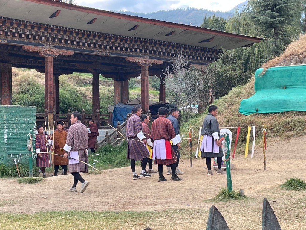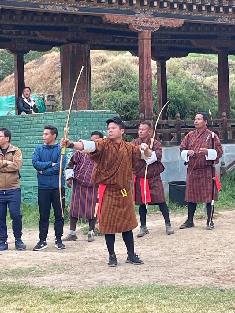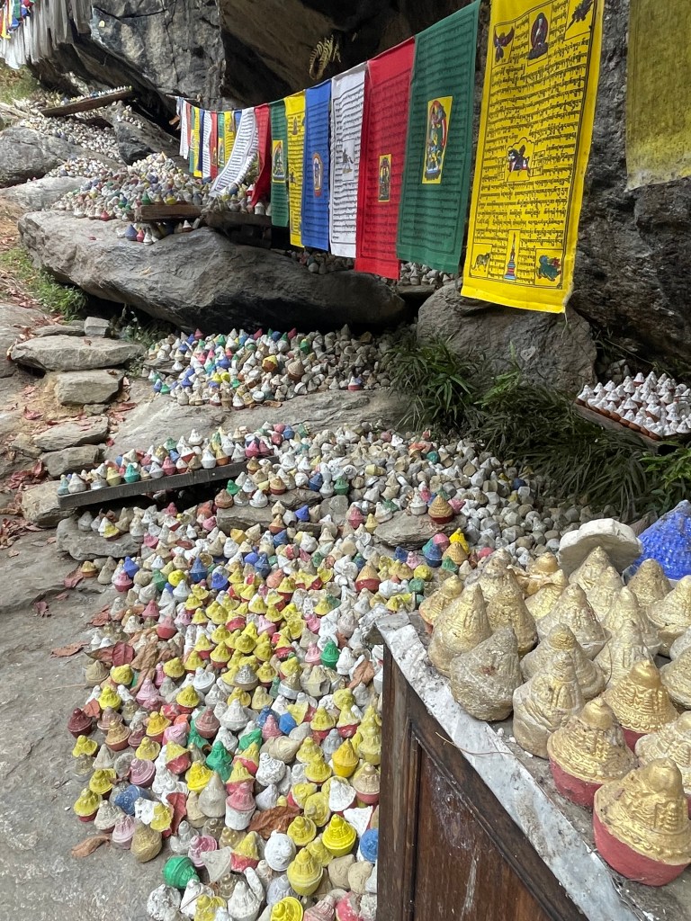 A few fun facts. Bhutan means high land. The country used to be called Druk which means dragon. It’s the only country whose capital doesn’t have a stop light, instead a uniformed officer directs traffic, from a small round covered building, through its main intersection. Archery is Bhutan’s national sport. We watched a match which was quite impressive. The small target they’re aiming at is 476 feet away and they hit it sometimes! When they do, the team members do a little victory dance. There are 5 national languages and 21 dialects are spoken. They got their first TV’s in the late 1990’s. Throughout the country there are 4 types of flags flying everywhere. One, are white flags posted on top of people’s homes for protection and good fortune. It is replaced once a year. Two, are 108 white flags planted in clusters on hillsides to honor those who have died. Three, are red, green, white, blue, and yellow prayer flags, usually hung on mountain tops so that the prayers can fly and spread. They come in various shapes and sizes. Red symbolizes fire, green water, white air and wind, blue sky and space, and yellow the earth. Chungdu told us all the prayer flags had been removed from the path to Tiger’s Nest just two weeks before we hiked, but yet the mountain was covered with them. And the final type of flag are ceremonial flags. All around the country you see little clay, cupcake looking things, called tsatsas tucked in crevices in the rocks, along side the road. They come in a variety of colors and are placed there as an offering for those that are sick. They have prayer wheels that are powered by fast flowing streams so they are on a constant cycle of invoking the loving and unconditional qualities of compassion.