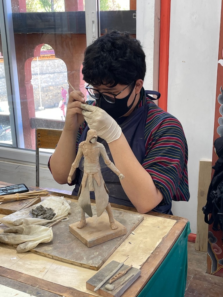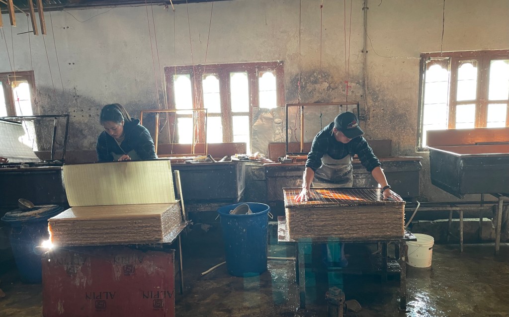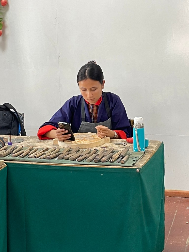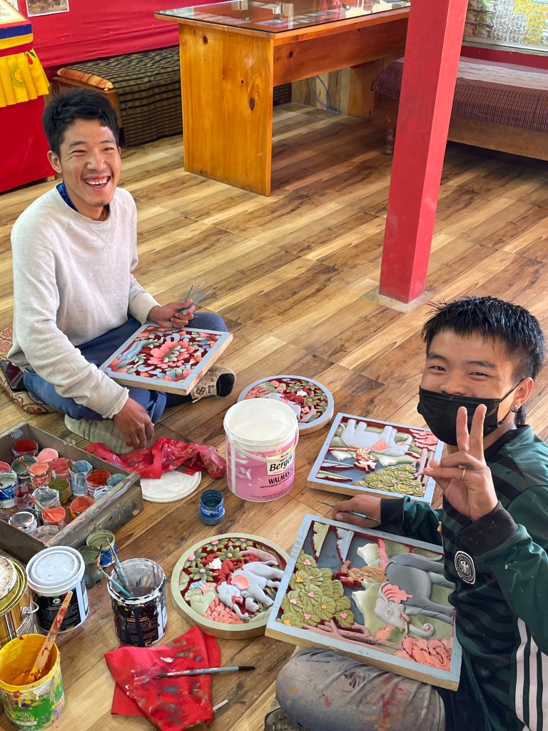 We visited the school where Namgay teaches and saw the students not only painting but also doing wood carving, sculpture, and tailoring. The school teaches 13 different crafts but the most studied are ones that have an economic future for the pupils. Students here go to school through 10th grade before choosing a course of study – science, commerce or art. We saw back brace weavers at work and learned how they make the various colors of yarn for the projects – again focusing on natural materials to dye the threads. They make paper by hand here using the bark of tree. The bark is softened, shredded, turned into pulp, shuttled over a frame until it settles into a flat sheet, and then dried.