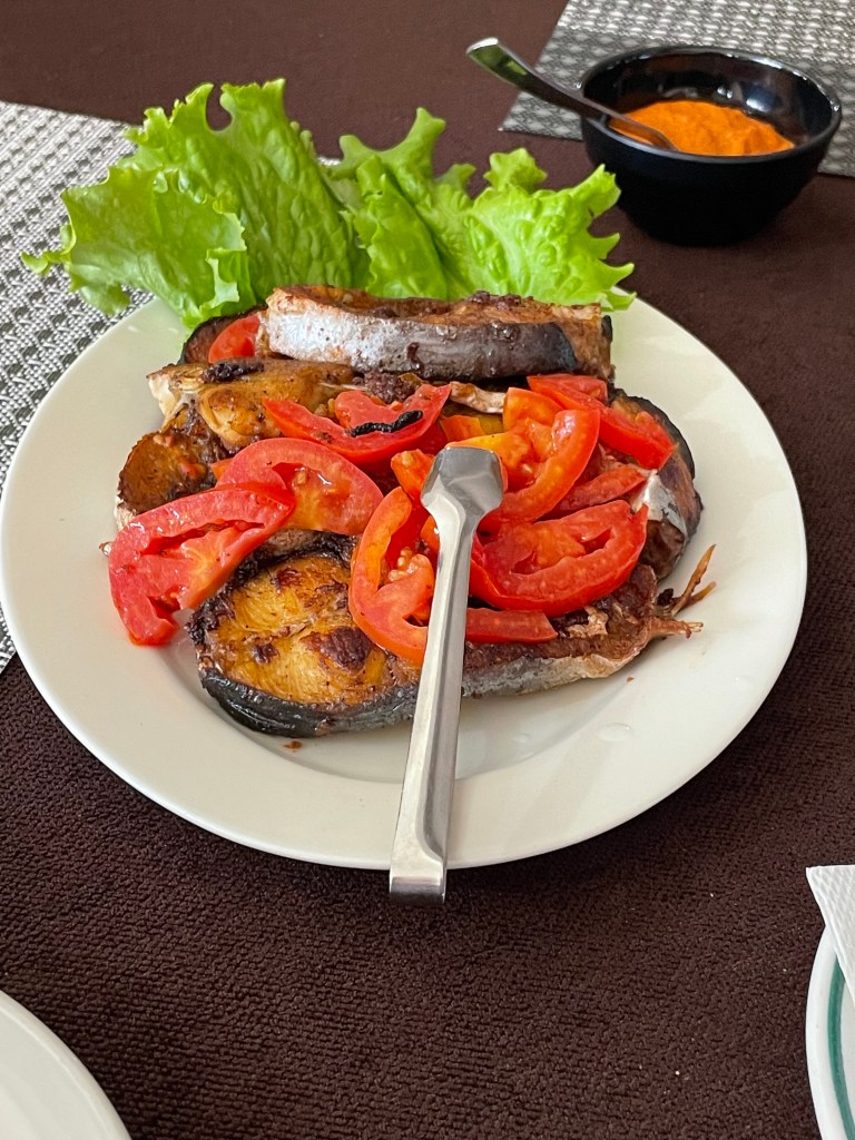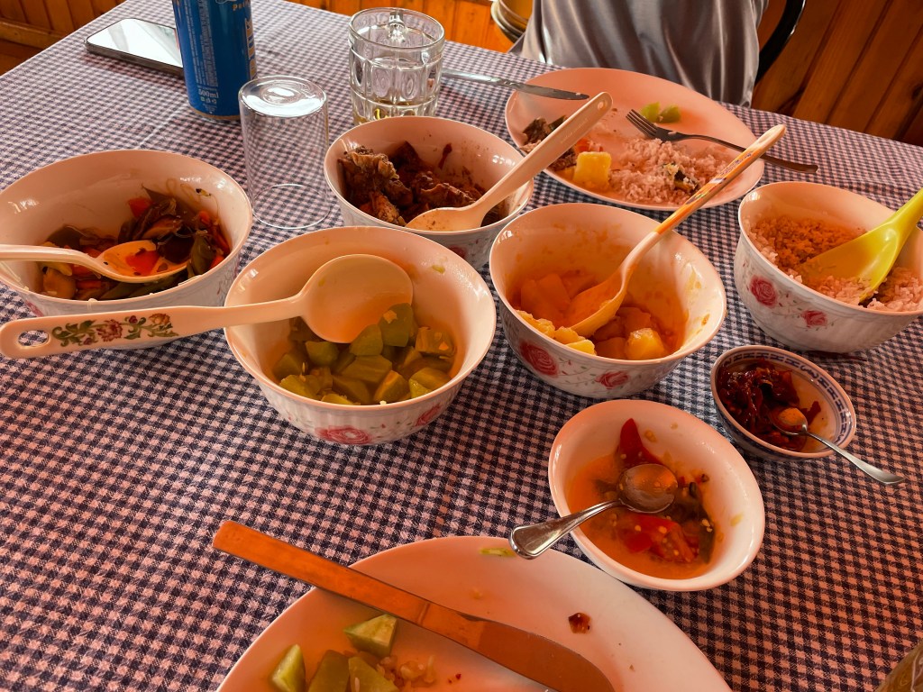 Although meat was readily available throughout Bhutan, many people are vegetarians, as Buddhists are not allowed to kill any living thing. They import most of their food from India, including meat and fish. Most of our meals were made up of rice, mixed vegetables, some type of meat or fish in a sauce, momos -dumplings, noodles, with fruit for dessert. Guavas were in season, so we had them more than once. Yum. At one lunch, we had banana fritters which were really good. Often the rice was red, a nuttier, tastier version of its white counterpart. It’s grow here and is a major source of income for farmers. Also, on the table was ema datse – chilis and cheese. It’s something you mix into your rice – though you can put it on anything, it can be quite hot however so best to start with a small portion. I liked it, even when my mouth was on fire. As in other places I have visited, our meals were feasts compared to the typical meals of the Bhutanese.