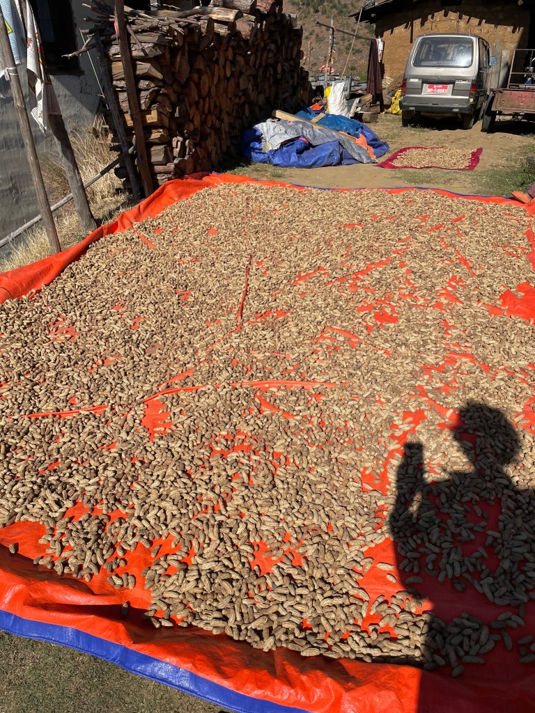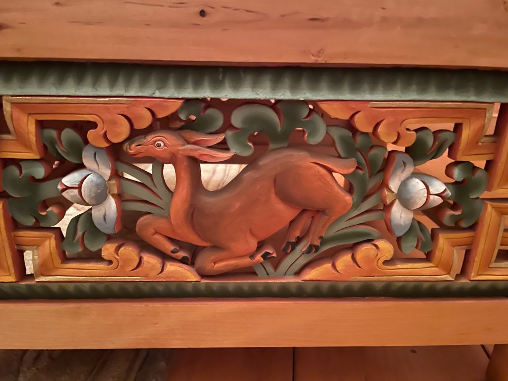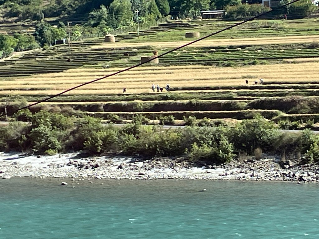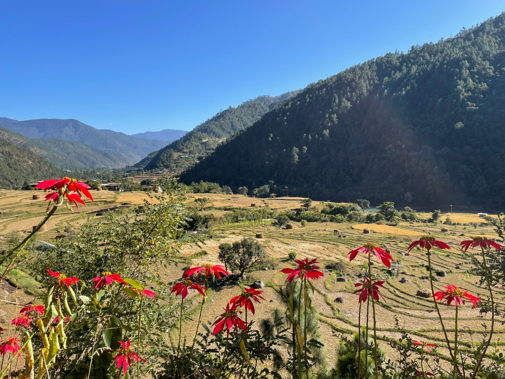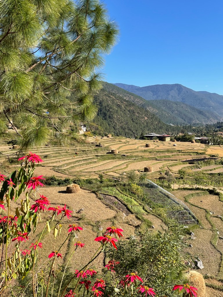 There are so many things I like about Bhutan and its people. It’s a gorgeous place with its mountains and valleys. Even in mid-November flowers were blooming-roses, cherry blossoms, bougainvillae, poinsettias -reminded me of Christmas, and others. I thought I would miss fall this year, my favorite time of year, but it felt like Bhutan was just entering that season. Leaves were beginning to change color; rice, potatoes, chili peppers, peanuts and turnips were being harvested; and the nights were cool – well cold actually. There was frost on the ground at least one morning. And of course it coincided with the nights where our hotel rooms were heated with wood burning stoves. I’m actually pretty good at keeping a fire going – well, after some instruction. I like the decorated houses and the rushing rivers. I find it fascinating that their national animal, the takin, was created by a Divine Madman from the head of a goat and a body of a cow. I applaud the country philosophy of happiness and although they may not be high on the happiness scale as measured in the global view, trying to achieve a balance between the four elements is admirable. I chuckled viewing phallus symbols displayed everywhere, but here it’s a sign of good luck. I adore that they love and respect their king. I appreciate the struggle they’re going through to modernize the country without losing who they are. It’s sits in the middle of two large and powerful nations – China and India, so straddling those tensions must be hard, But they have hundreds if not thousands of monks praying each day for peace and so far it seems to be working. It’s a land that believes in mystery and magic. The people were very kind and patient. The majority seemed to respect their traditions but unfortunately this is changing. I resonated with a lot of the Buddhist philosophy as it was told to me.