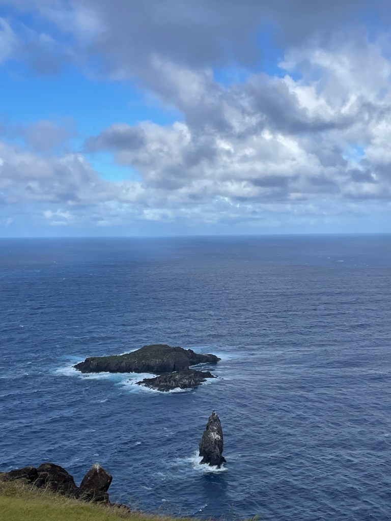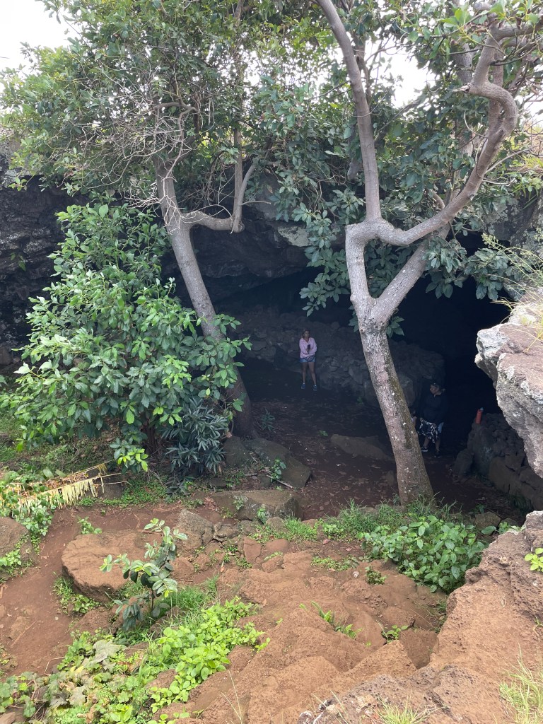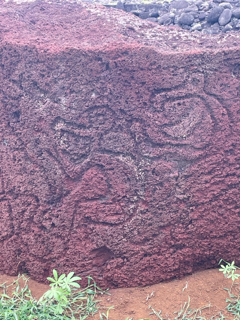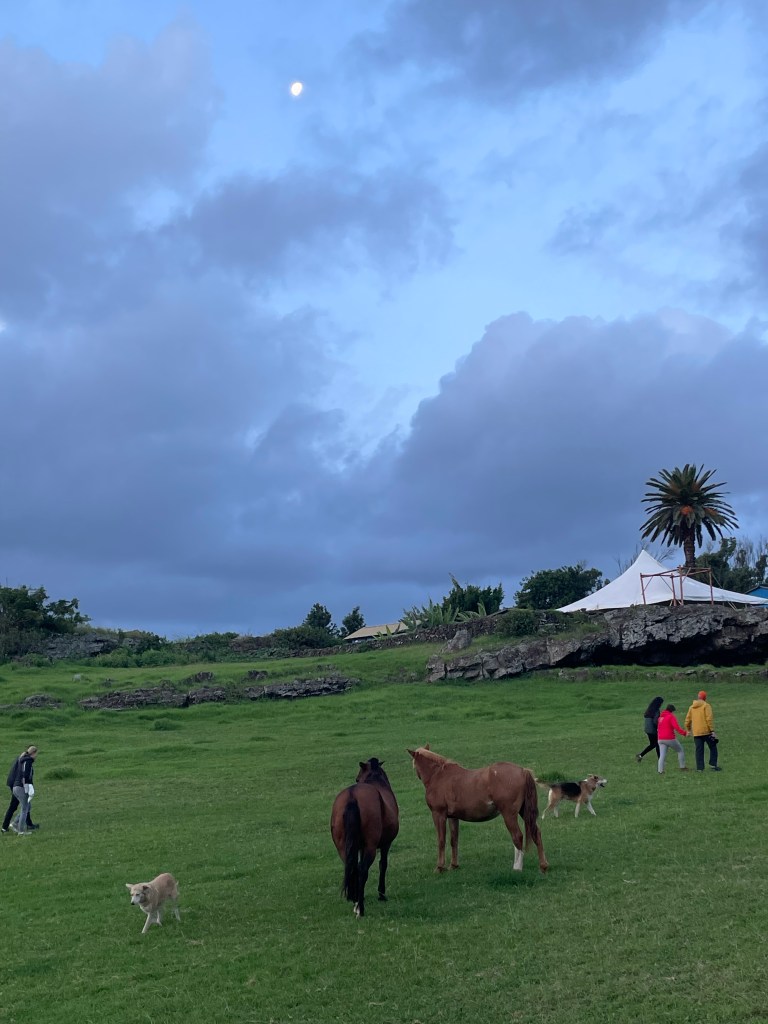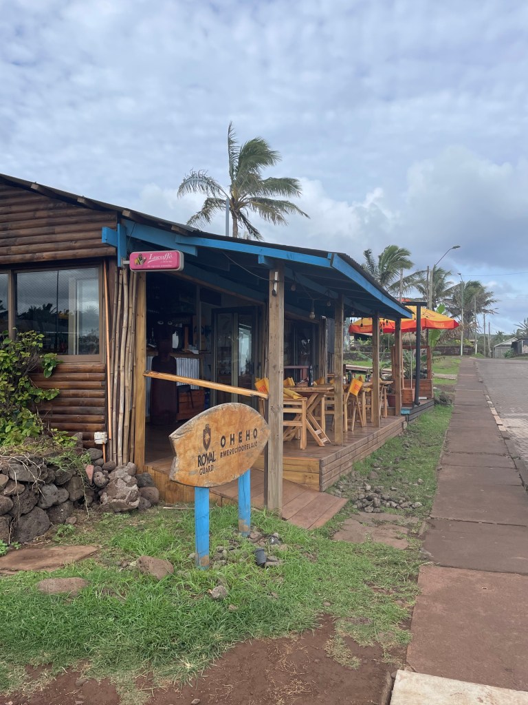 Walking to the cave we went through a wild guava field. The bushes had some ripe fruit which we ate while we walked. Yum. The island was adorned with blooming hibiscus, one of my favorite flowers, and other colorful blooms. Dog and horses run freely over its 63 square miles. The only town, Hanga Roa, is small but was filled with cute boutiques, souvenir shops, grocery stores and marts, as well as many restaurants. I stayed at a boutique hotel – as far as I could tell I had the only room, but there were also cottages behind the building. Each day breakfast was served in a dining room that spilled out onto the patio overlooking the ocean. Paula, the manager, always had a wonderful spread of fresh local fruit and juices, a selection of meat, cheeses and breads, yogurt and cereal and eggs to order. Papas frites were readily available in most of restaurants often topped with cheese sauce and bbq meat. Empandas were everywhere and I managed to find several vegetarian versions. Ceviche was wonderful and fresh. Tuna is a specialty, in the past there were times that royals were only allowed to eat it. Now however, you find it in tacos, empanadas, ceviche, sushi, and grilled. I had shrimp fajitas one night and a poke bowl another. I also enjoyed the picante sauce that they serve with bread instead of butter. Muy bueno.
