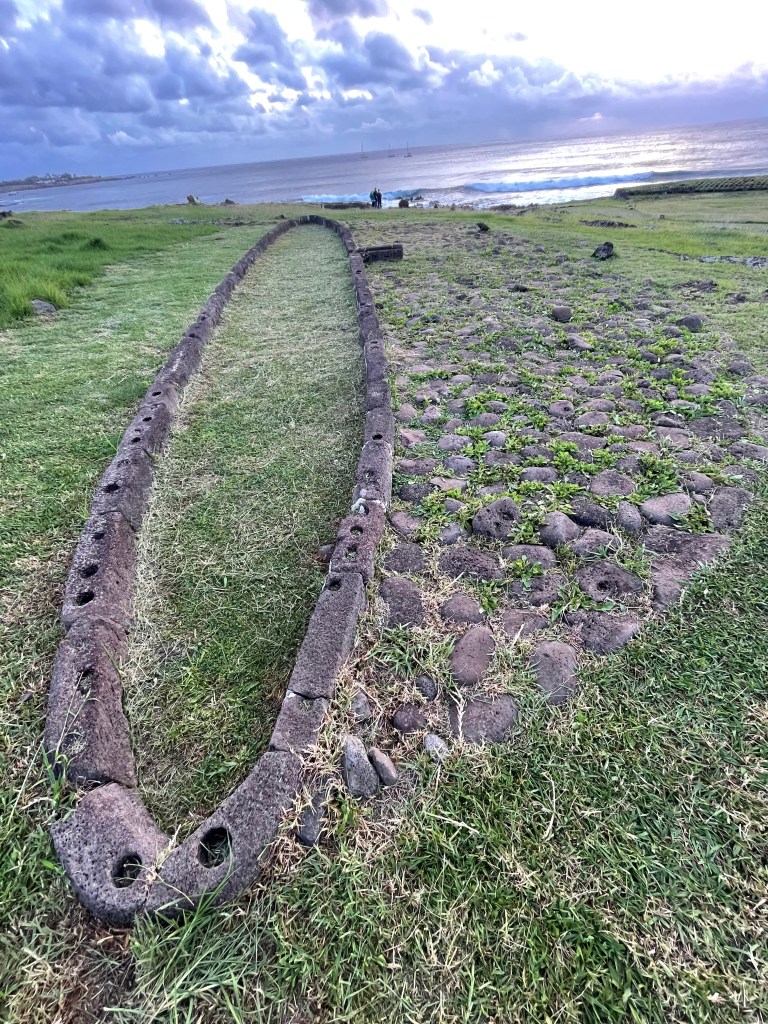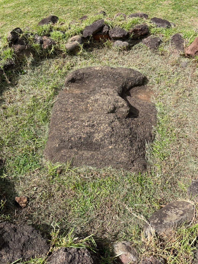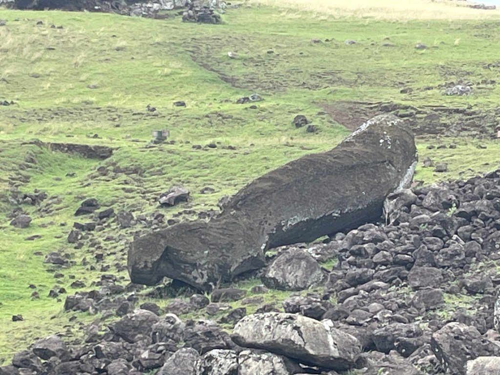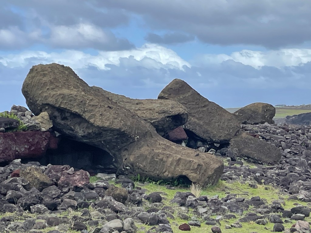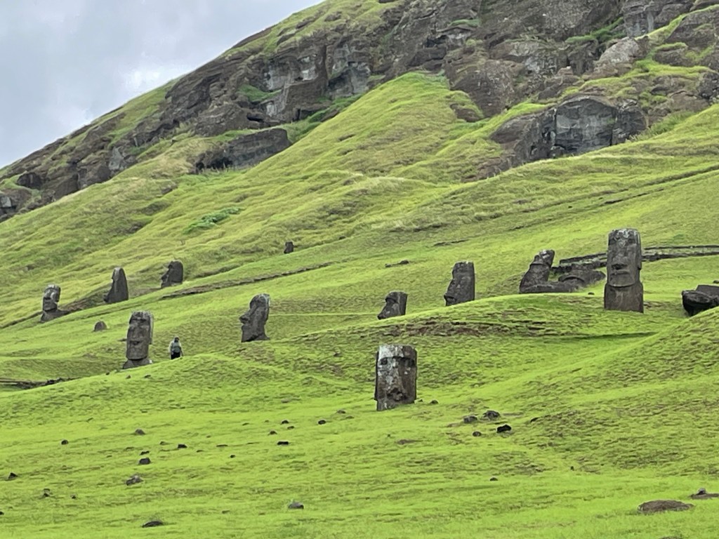 The moai were carved – chiseled? between 1100 and 1650 AD and there are over 1,000 of them on the island. The vast majority of them are still at the quarry, where there were made, in various stages of completion. The Rapa Nui carved them from the rock face using stone tools. It’s really amazing to see them outlined in the hillside, partially ‘freed’ from the rock. Large numbers of them are up to their neck in the dirt. The statues range in size from 6 to 37 feet tall. Many are erected in various locations across the island, situated on platforms called ahu. Dozens are scattered over the island en route to their final destinations. The biggest mystery is how they got the figures from the quarry to the perimeter of the island where many of them are located. The method most embraced by the Rapa Nui is that they were ‘walked’ across the land using ropes, similar to how you would walk a refrigerator from its space in the wall. Moai were carved and erected to honor the spirit of their ancestors, at least those of their leaders. Once placed on the pedestals, coral eyes were set in the sculpture which imbued the figure with the mana or energy of the chiefs and shamans they represented. This mana was believed to protect the people and assure that they had the resources they needed. Without the eyes, they held no power. In the late 1700’s, the island’s population had grown so much that resources on the island were scarce, causing intertribal wars. It’s suggested that the moai were toppled during this period as their power was no longer protecting or providing for the island.