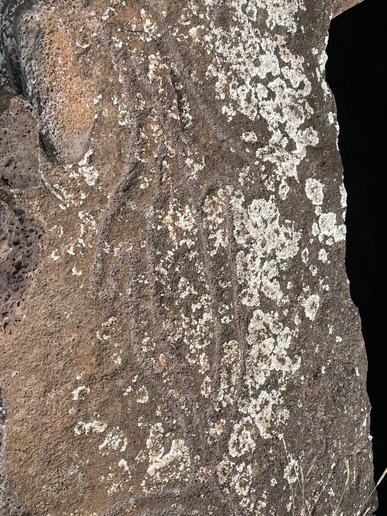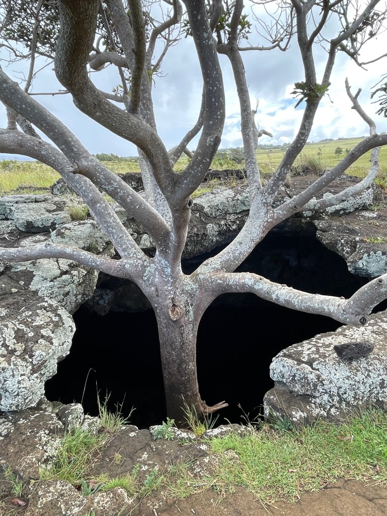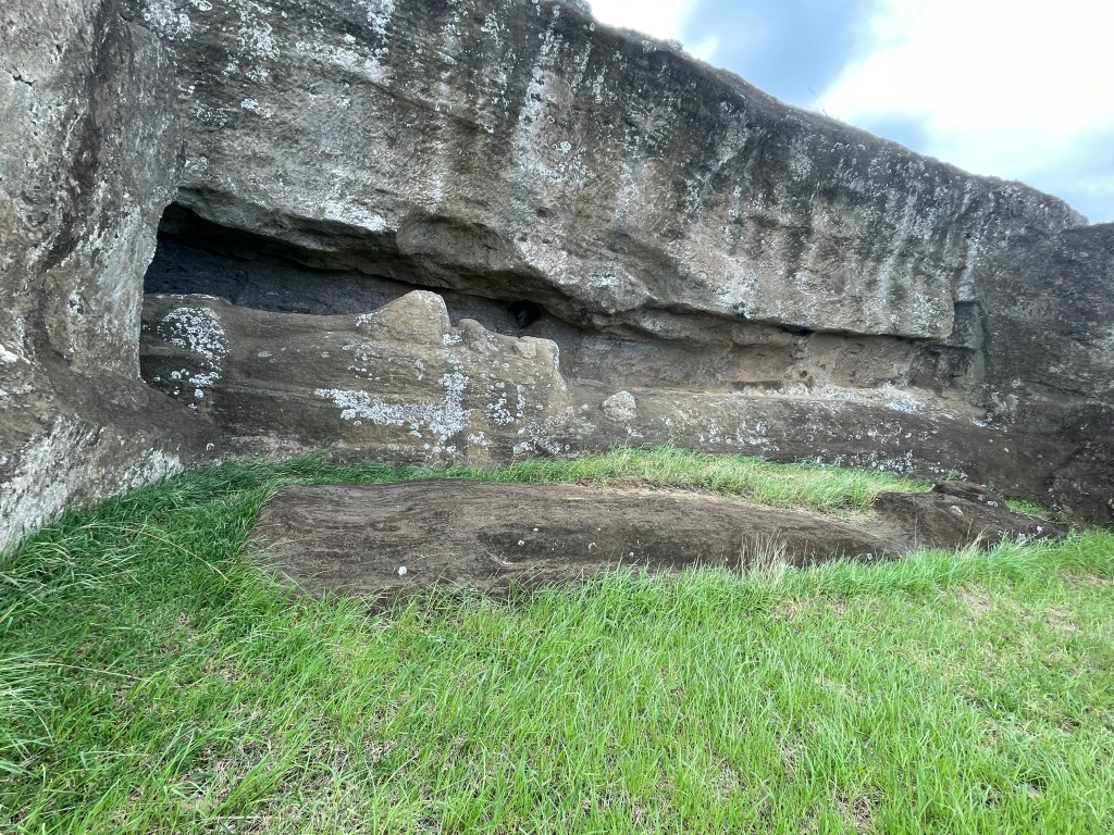During the time of the intertribal wars, a Birdman competiton was started. Competitors, who came from various tribes, had to swim to a small island off the coast, through treacherous water of strong tides and sharks, to find the first egg laid by the sea birds on their spring migration. The return of the birds signaled a time of plenty. The winning competitor or his chief would then rule the country for that year, allocating the resources among the tribes. It was an attempt to contain the constant fighting over food to a single event. There are petroglyphs of the birdman across the island. There are also reconstructed stone buildings at various sites, once used for homes and chicken coops. Foundation stones of others are found quite often at locations around the island. Many of the Rapa Nui lived in caves for many years. We toured a cave, climbing through its various rooms. It was too dark for me but I was told their eyes got used to it. There was usually water there and in the openings they created gardens. Wind and water are eroding both the petroglyphs and the moai and there has been a lot of discussion on how to preserve them but there doesn’t seem to be a good answer. They also struggled with re-erecting the Moai, due to the cost and determining if it is the right thing to do. Some have been repaired and returned to the ahu and others are left in their tumbled down state.