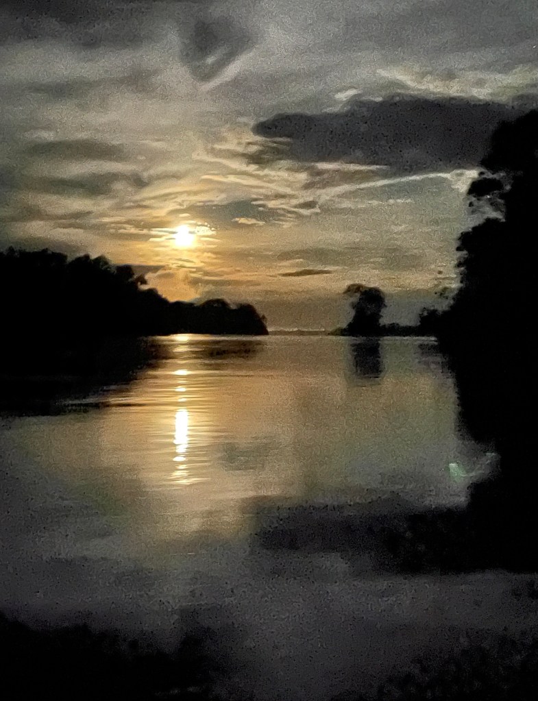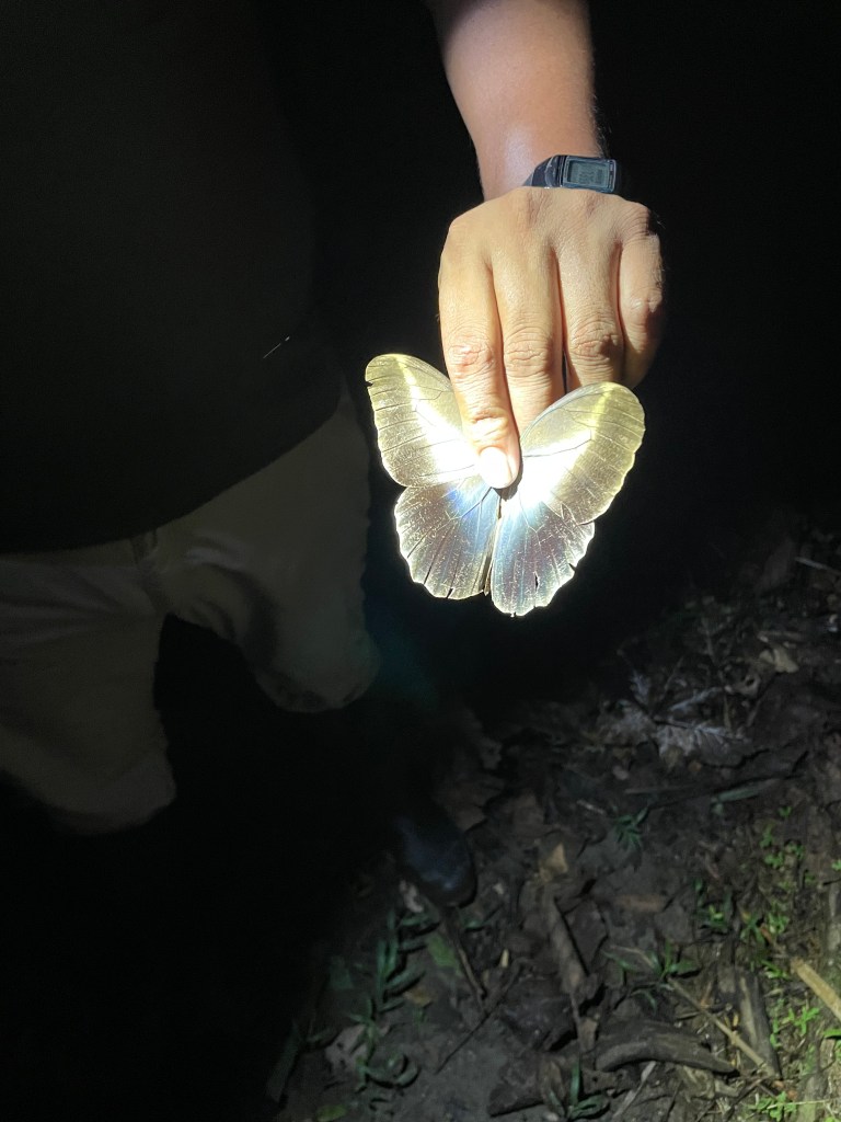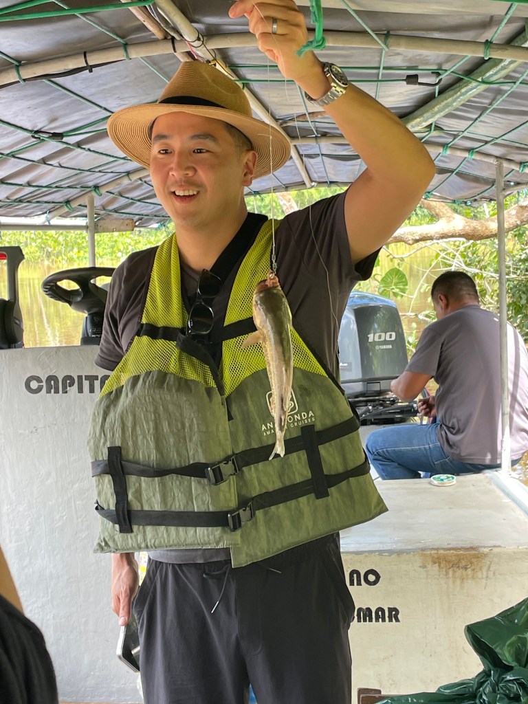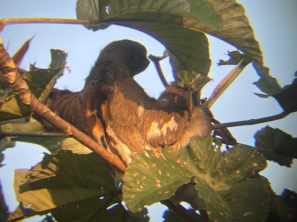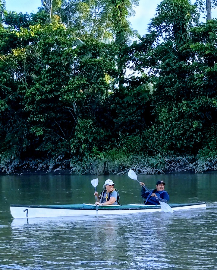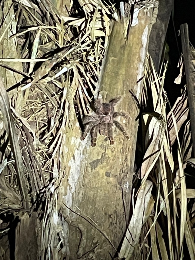 We used that big canoe several times a day, loading and unloading as the pilot hugged the side of the bigger boat, our life jackets strapped on tightly. Kevin, our naturalist guide, accompanied us as we explored tributaries, shoreline, and trails in search of wildlife. Pink river dolphins and kara kara or falcons where the first animals we spotted. High up in the trees, we saw at least four different varieties of monkeys including the white faced capuchin, golden mantle tamarin, wooly and howler. I’m not sure we would have seen them without the sharp eyes of our guide, the monkey’s movement from branch to branch then helped to focus our eyes on their location. We scouted the shore while we kayaked for an anaconda but never saw one – much to everyone’s disappointment. We did however catch piraña one day and had it for dinner. It was very tasty. High up in a tree we spotted a three-toed sloth lazing in the branches. On a night cruise, we startled a capybara as he nibbled on some reeds, it was like spotting for deer with our flashlight sweeping the shore. We also saw a pink-toed tarantula on a night hike, along with a huge owl moth and lots of bugs.