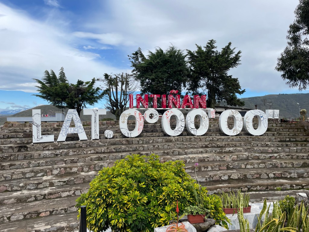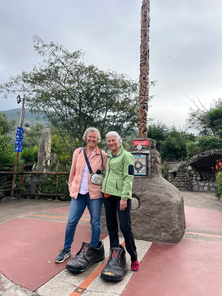 Quito proper is situated high on a hill at 9,350 ft elevation. We stayed in two different locations. The first, near the Mariscal neighborhood- once an enclave of the rich outside of downtown but now the beautiful houses have been turned into offices and shops and the area has lost its luster. The second, in the newer north end of the city, is filled with malls and fancy, tall, condo buildings. We took a bike tour of the old town, on Sunday morning when the traffic was light, enjoying the vibrant city center filled with people strolling the pedestrian streets after church. Street vendors were selling their wares – from art work to meringue, a popular sticky, sweet treat. Ecuador is primarily a Catholic country. Ninety percent of the people in Cuenca are Catholic but only 80% in Quito. In Cuenca, there are 17 churches in El Centro – one every two blocks. In Quito, there are 43 churches in the old town area, including two huge Gothic style edifices. The streets in some areas are very hilly, requiring me and occasionally the others to walk our bikes. No trip to Ecuador would be complete without visiting the equator, so we hired a cab for the thirty minute ride to experience the Coriolis Effect.