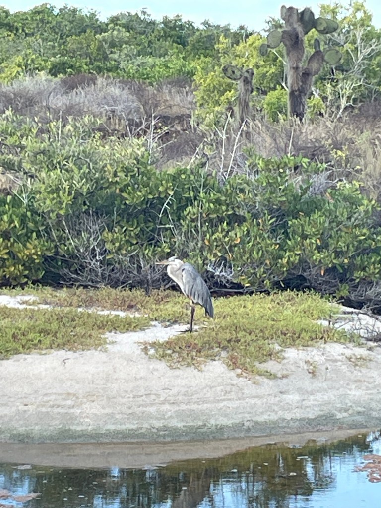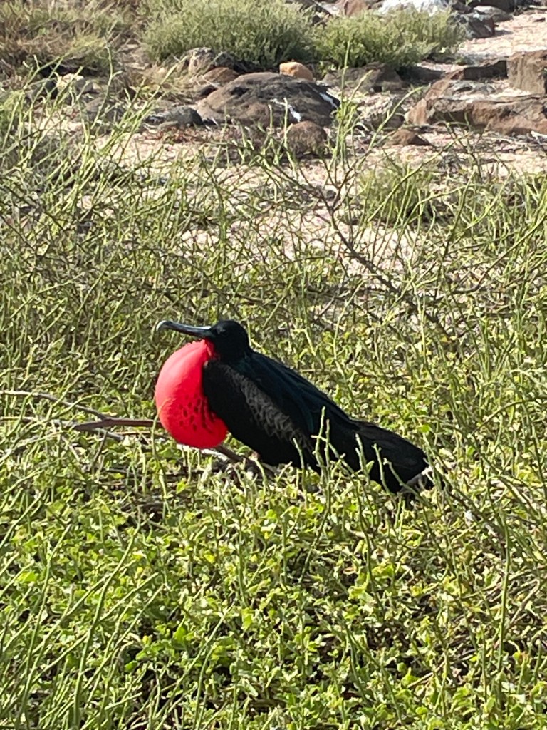 On our daily hikes we saw some fabulous wildlife, which is what the Galapagos is all about. Our first day, we experienced the dance of the blue footed boobies. It was their mating season so once there got close to a potential partner, they had show each other their beautiful blue feet, then the male flapped his wings and they pecked at each other. The male then proceeded to find small sticks to present to the lady in question, hoping to impress her. Since they nest in the dirt, it’s not clear what the sticks were for however. If accepted they continued on to copulation. In the midst of all this dancing, huge land iguanas crawled by unimpressed. Scattered among the dancing partners were bushes full of frigate birds, the male’s bright red necks inflated to attract a worthy companion. On other hikes, we saw thousands of the prehistoric looking marine iguanas piled up on top of the lava rocks, warming in the sun. We also saw great blue herons, pelicans, penguins, Darwin finches, egrets, terns, flamingos, red eyed gulls, Galapagos hawks, and others. We also experienced the varied landscapes of the island, from black lava fields to calderas. Some islands were covered with vegetation and others close to barren.
