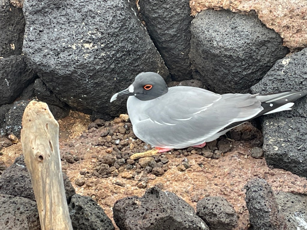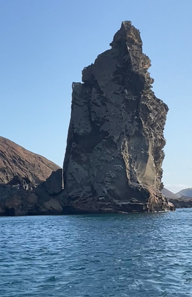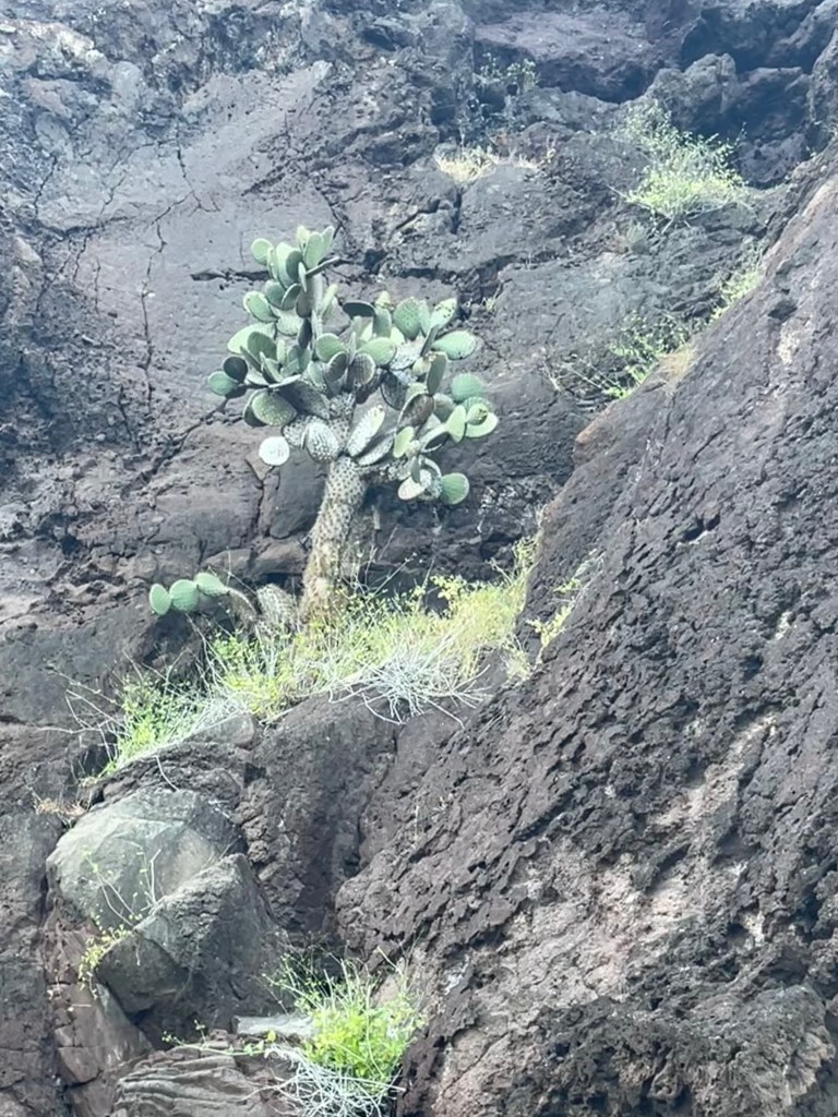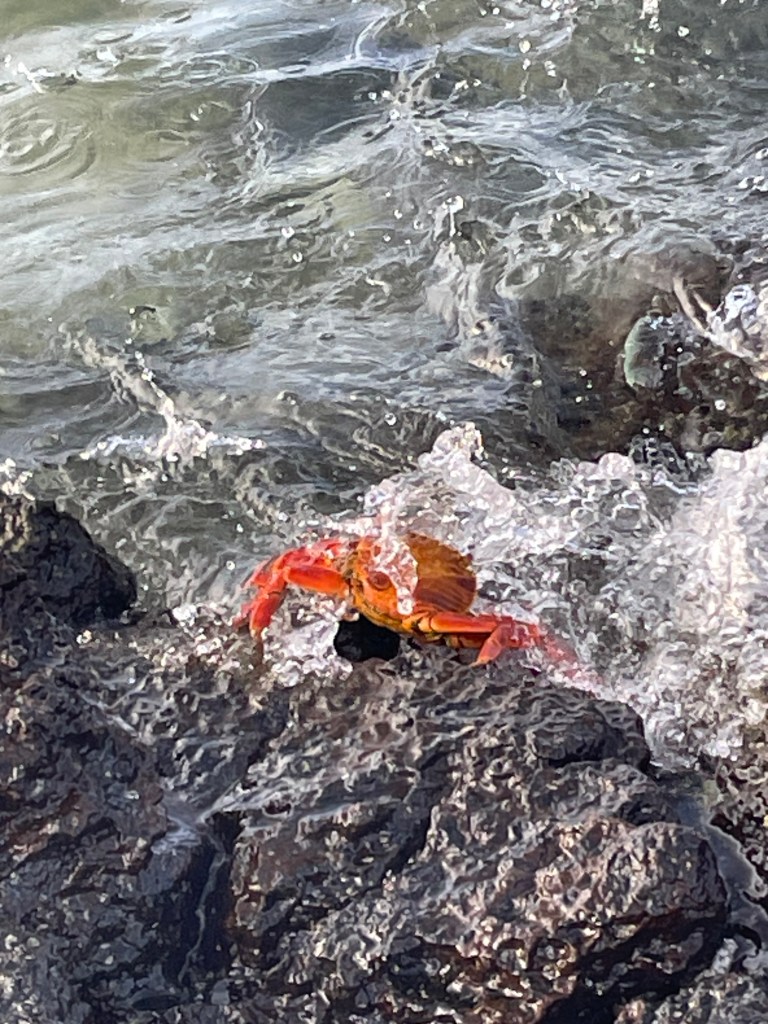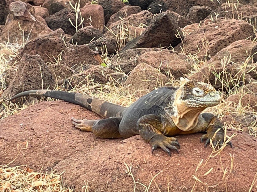 We often cruised the along the coast in the pangas, to observe the fish and fowl as they went about their daily lives. Observing more of what we saw beneath the water or on the land from a different angle. We watched sea lions lazing on the rocks or blocking our way when we disembarked, laying in the pathways and looking up at us to see what we wanted. Many of the birds were easier to see from the water as they perched on small ledges along the rocky shoreline. Everywhere there were bright red crabs clinging to the rocks as the waves washed over them. Baby ones are black to protect them from predators, slowly turning red as their shells harden. We not only saw the animals active in their regular pursuits but also in various stages of decay, having succumbed to predators, old age or harsh conditions. We even saw the spine of a whale washed up yards from the shore, I imagine during a violent storm. We had two opportunities to see giant tortoises, once in the wild and once in a breeding center. Both times, some were actively creating the next generation. At one island, we boated close to shore to see the remnants of a recent volcanic eruption. Steam billowed as the lava cooled along the coast. And in one large formation we could see a sliver of hot magma, peering at us like Sauron’s eye. If it hadn’t been for the heavy rocking of the boat on the last day – seasick remedies needed by most, we all would have been happy to spend another week in these beautiful and amazing islands.
