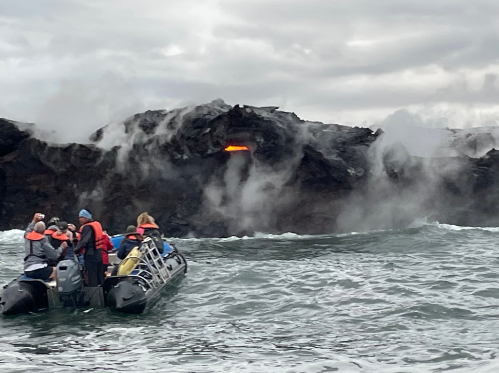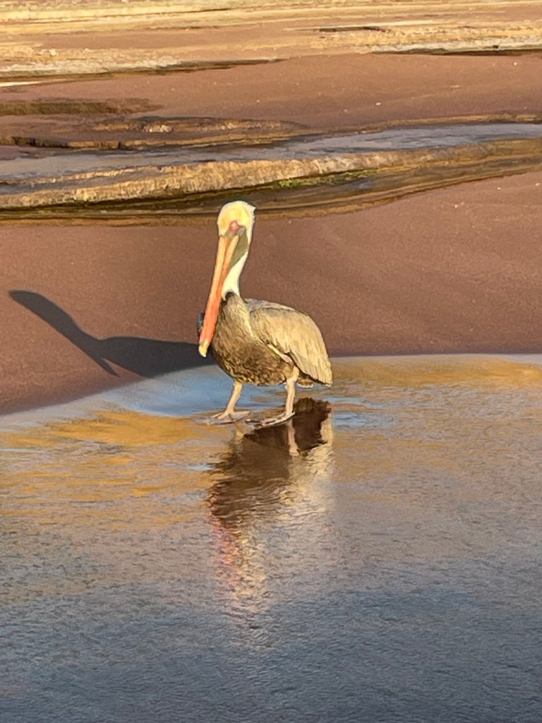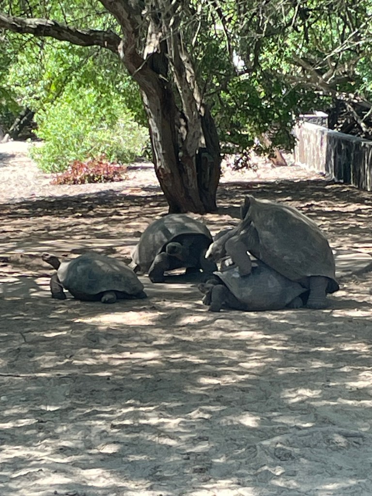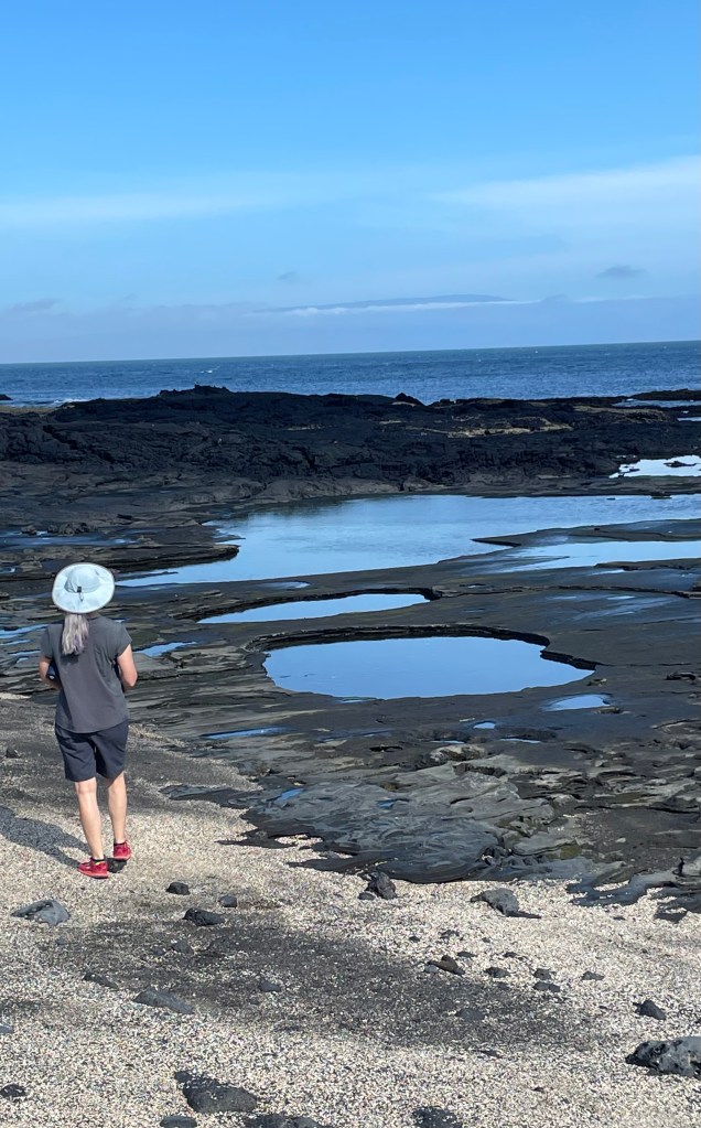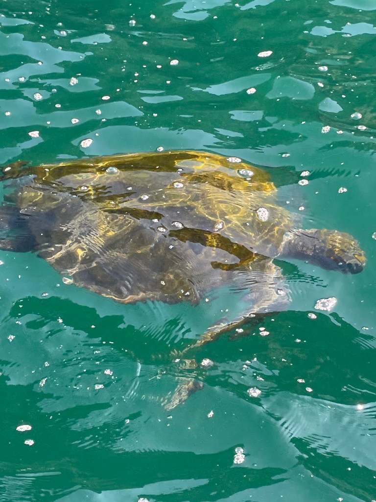 We often cruised the along the coast in the pangas, to observe the fish and fowl as they went about their daily lives. Observing more of what we saw beneath the water or on the land from a different angle. We watched sea lions lazing on the rocks or blocking our way when we disembarked, laying in the pathways and looking up at us to see what we wanted. Many of the birds were easier to see from the water as they perched on small ledges along the rocky shoreline. Everywhere there were bright red crabs clinging to the rocks as the waves washed over them. Baby ones are black to protect them from predators, slowly turning red as their shells harden. We not only saw the animals active in their regular pursuits but also in various stages of decay, having succumbed to predators, old age or harsh conditions. We even saw the spine of a whale washed up yards from the shore, I imagine during a violent storm. We had two opportunities to see giant tortoises, once in the wild and once in a breeding center. Both times, some were actively creating the next generation. At one island, we boated close to shore to see the remnants of a recent volcanic eruption. Steam billowed as the lava cooled along the coast. And in one large formation we could see a sliver of hot magma, peering at us like Sauron’s eye. If it hadn’t been for the heavy rocking of the boat on the last day – seasick remedies needed by most, we all would have been happy to spend another week in these beautiful and amazing islands.