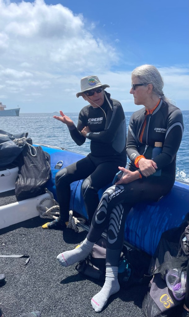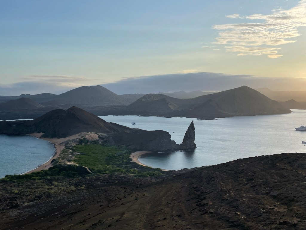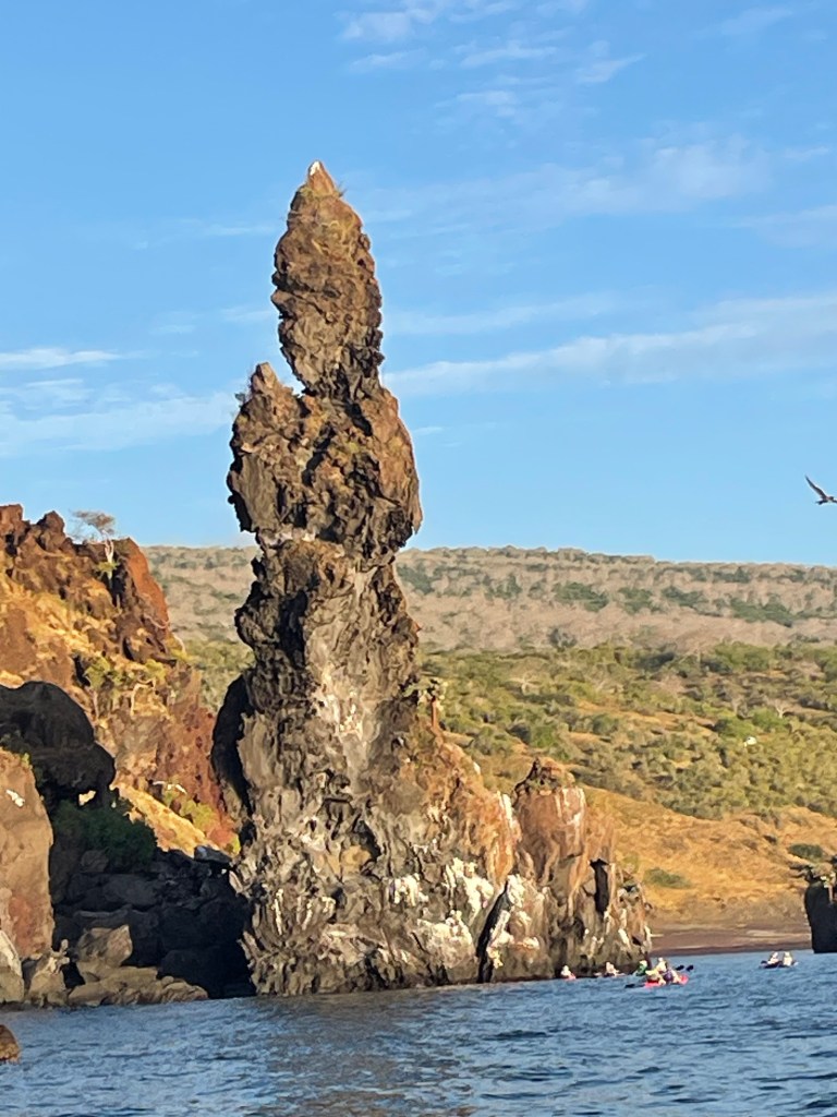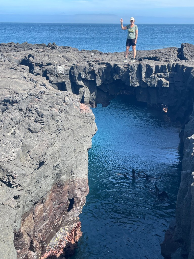Time to get back on the water. Pam and I arrived in the Galapagos on a beautiful sunny day and boarded the Grace – once the yacht of Princess Grace of Monaco. Many thanks to my friend Brad Eskind – who you might remember joined me in Bhutan, for recommending it. She slept 16 guests. All of us were from the US, spanning the nation from San Diego to Boston. One woman came with her son who was 21 but the others ranged in age from their fifties to their seventies. I enjoyed meeting and hanging out with all of them. From day one, they told us this was not a vacation but an adventure and provided us with one wonderful activity after the other – snorkeling, hiking, kayaking, nature talks and panga rides. As the boat cruised from island to island we navigated daily in a panga or zodiac to our activities. There were two naturalists on board, Diego and Walter, who accompanied us everywhere we went, providing in-depth commentary. Gibson, the on-board chef prepared three delicious meals each day, with multiple options for the main course. Highlighting, of course, the fresh seafood of the islands. Xavier, not only mixed fabulous cocktails but served us our meal as well. Ten more staff worked to make the trip safe and special, from Jorge, our captain, to Alex who cleaned our rooms and left creative towel animals on our beds.