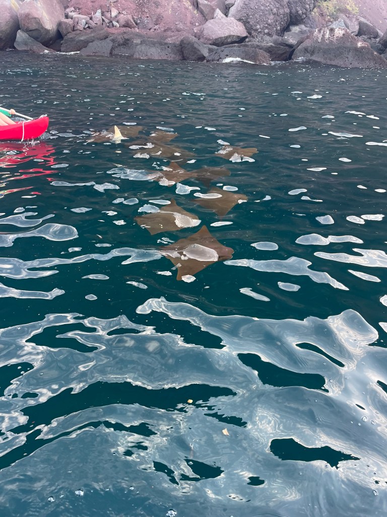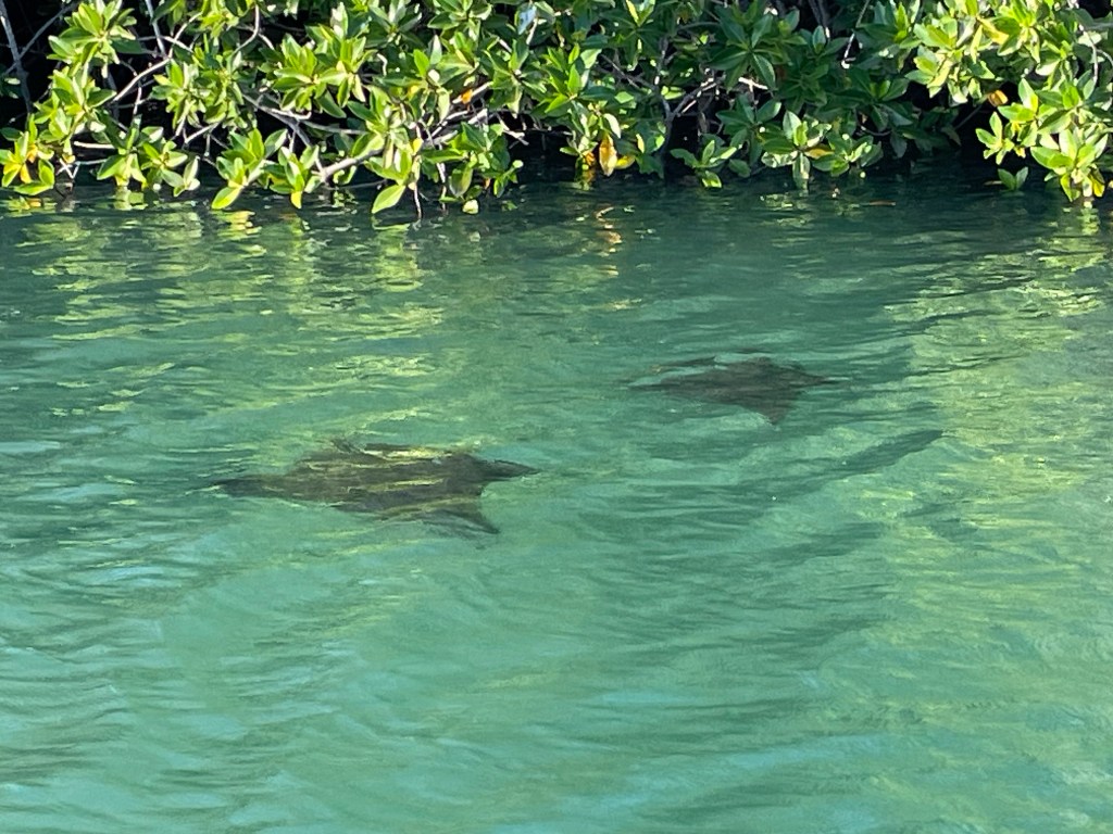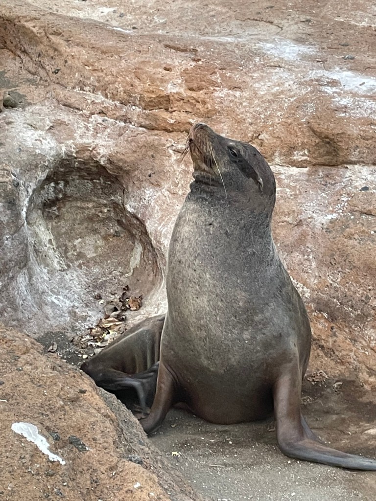 We were given options to snorkel almost every day and twice on some days. Thankfully we were loaned wet suits, as the water was very refreshing, though getting in and out of them could be the basis for a comedic sketch. We peeled them off on the front deck, right next to the hot tub, and then proceeded to climb in to warm up and have a chat about what we saw. I delight in being in the water so couldn’t be more happy. There were so many schools of fish, ranging in size from almost microscopic to good sized surgeon fish. Bright yellow, orange, red, purple, white and silver flashed in front of us as they swam by, as spots, stripes, tails, bellies and backs. We witnesses several white tip and Galapagos sharks. I floated above huge sea turtles as they nibbled on the algae on the rocks. I frolicked with sea lions as they swam between us, curious to what these strange beings might be. Penguins dove in and rocketed to safety. Wing tip, golden, and marbled rays gracefully glided their way through the water, one about 5 feet in circumference. Flightless cormorants plunged beneath the surface scouring the bottom for tidbits to eat. Our heads plunging in after him to watch his flight across the ocean bottom. An octopus, which Pam discovered, scurried for safety under a rock, completely camouflaged once he settled in. All seemed unconcerned with our presence though maybe a little annoyed as we hovered above them.