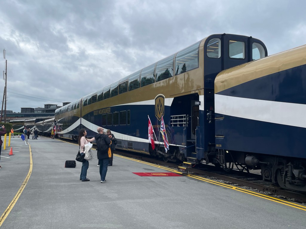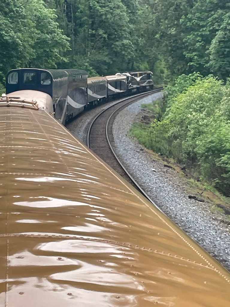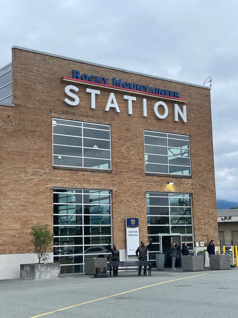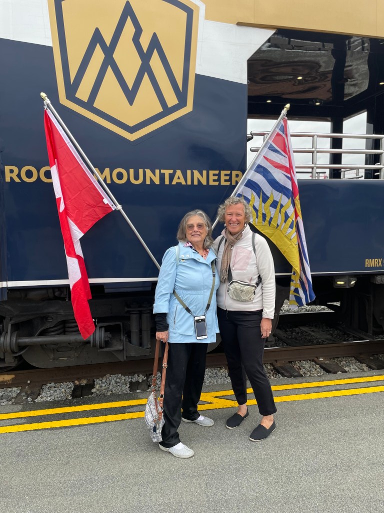 The experience on the Rocky Mountaineer was first class from the beginning. Our luggage was whisked away early in the morning, reappearing each evening in our hotel room. Let me tell you, it’s nice having someone else deal with your suitcases. Our assigned seats were on the upper floor of a domed observation car, providing magnificent views of the beautiful country side we passed through. We were called down to the dining car below for both breakfast and lunch and served delicious three-course meals on white table cloths. Our companions while we ate, changed from meal to meal which allowed us to get to know our fellow passengers. We dined with several interesting couples, one from the Cotswolds in England, another from Scotland, and one from California- though they both were born in China. We continued to run into the last couple are various points along the rest of our trip, although never had the pleasure of having another meal together. There were two shifts for every service but if you happened to be in the second seating for breakfast, they served you warm cranberry orange cake while you were waiting. The bar was always open upstairs and down, with wonderful Canadian wines, a featured cocktail, and almost anything else you might want. I often had hot water with lemon and honey, as the dry Alaskan and Canadian air was playing havoc with my sinuses which impacted my throat. We spent the days enjoying the views, wandering the long car to look out from different vantage points, talking, and me writing my blog. Somehow, my normal routine of scheduling several days rest between tours went by the wayside, leaving me no time to write.