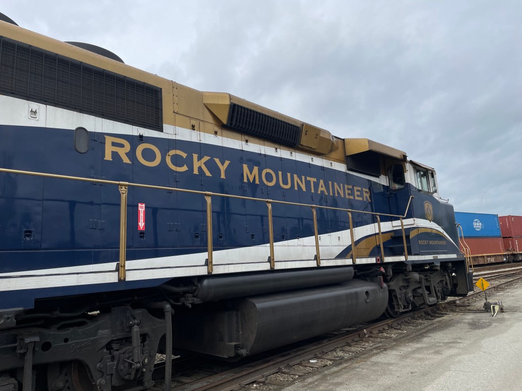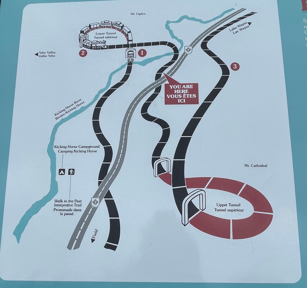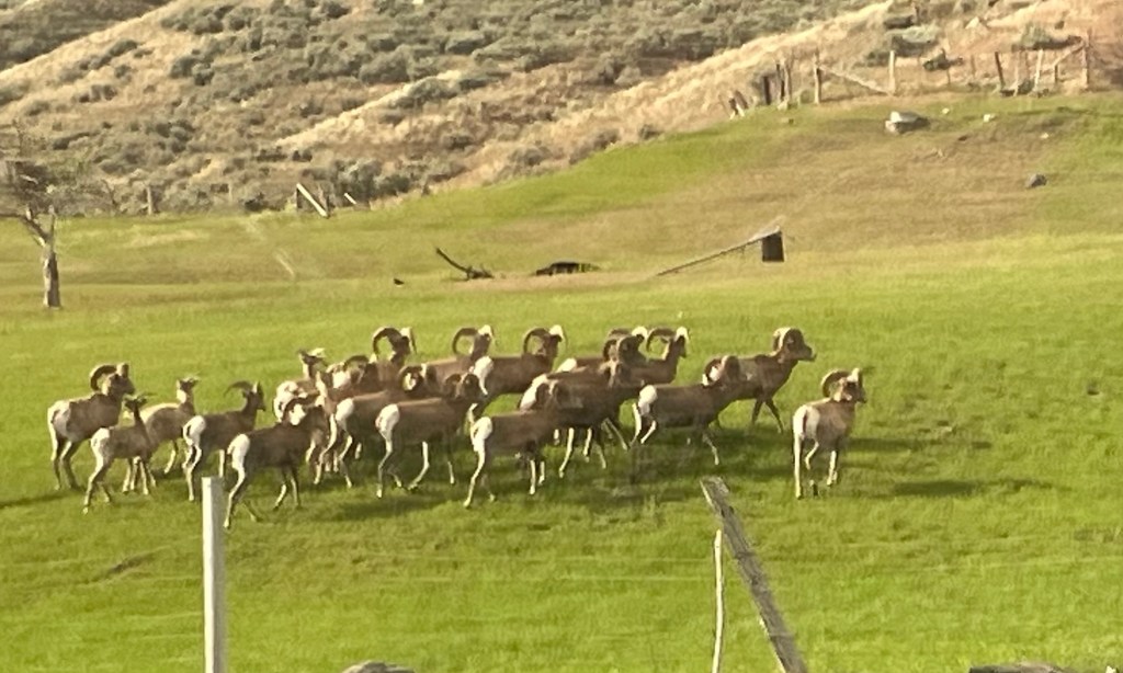 Both the Rocky Mountaineer and Via Rail run on Canadian Pacific or Canadian National rail lines and the commercial trains have the right of way. This was much more noticeable on the Via Rail, where we had to pull over several times to let long lines of colorful container cars pass by. The Rocky Mountaineer had 23 cars – 8 passenger, 3 engines, 3 generators, and nine crew and storage cars. We had 448 guests on board but in peak season there can be up to 900. The tracks, the Rocky Mountaineer runs on, are often built on a thin strip of ground between a mountain and a river so trains only run in one direction. We could see the west bound trains across the river, clinging to the rails on the side of the slopes. In many areas, those trains ran through tunnels so that avalanches can roll over the top of them, preventing many delays. As we climbed toward the Canadian Rockies, more snow covered peaks came into view. At one pass, our elevation was too great to go directly up the hill so we went slowly – 10 mph so not to break a knuckle, through a spiral tunnel. These are engineering feats, copied from Swiss technology. When you’re in the tunnel, it feels like you’re going straight but you’re actually making a sharp turn. It takes two turns, one to the left and one to the right, to make it up the mountain. We were always on the lookout for wildlife and were rewarded one day with a large herd of big-horned sheep.