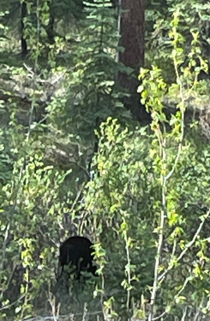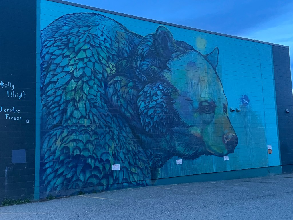 Some fun facts about bears. Black bears have claws like cats which is why they are so adept at climbing trees. Grizzlies have a hump on their back and long claws for digging grubs from the ground. They can lift a 300 pound rock to get to the bugs underneath and unroot a tree to get to you, if you’ve climbed there for safety. Bears love dandelions, the greens help get their metabolisms going after hibernation. Female bears can carry multiple fertilized eggs through the summer and can self-abort if she hasn’t eaten enough to support them, after the cubs are born in January. If she’s eaten well, she may have twins or triplets. Despite all the bears in the region, outdoor sports abound – lots of camping, biking, rafting, skiing, hiking, etc.